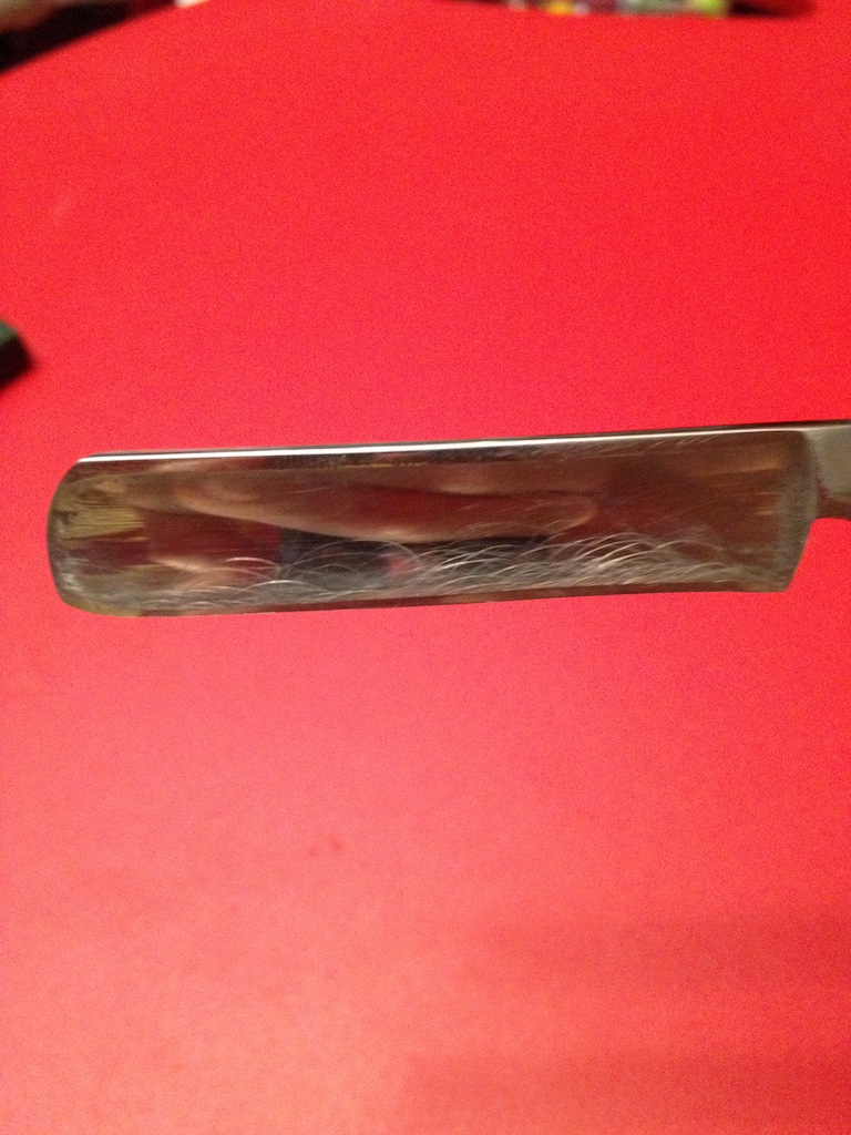 1. По Спартаку. Бритва досталась мне почти в том же виде, что и на фото. За исключением того, что почистил я ее ГОИ. Снял "следы времени". И то, что вы видите - результат "умений" предыдущего хозяина. 80 грит или не 80, я без понятия, может он ее вообще напильником точил. Брал себе специально для тренировки, но пока нет в планах брать камень с таким зерном, чтоб сточить эту улыбку. А японца на ней убивать нет желания. 2. По востену. Трещина там именно на мыске, поэтому он с 2 сторон крупным планом. Снял как мог, она реально микроскопическая, на фото не видно. Но она есть, чего скрывать Если что-то интересует еще - спрашивайте. А учить меня не надо