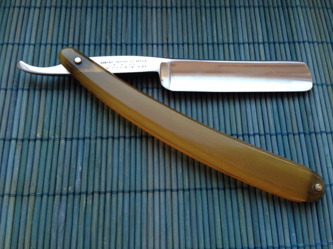 Ширина полотна 6/8 , оригинальные пины из латуни и ручка из рога . Заточена и готова к бритью .