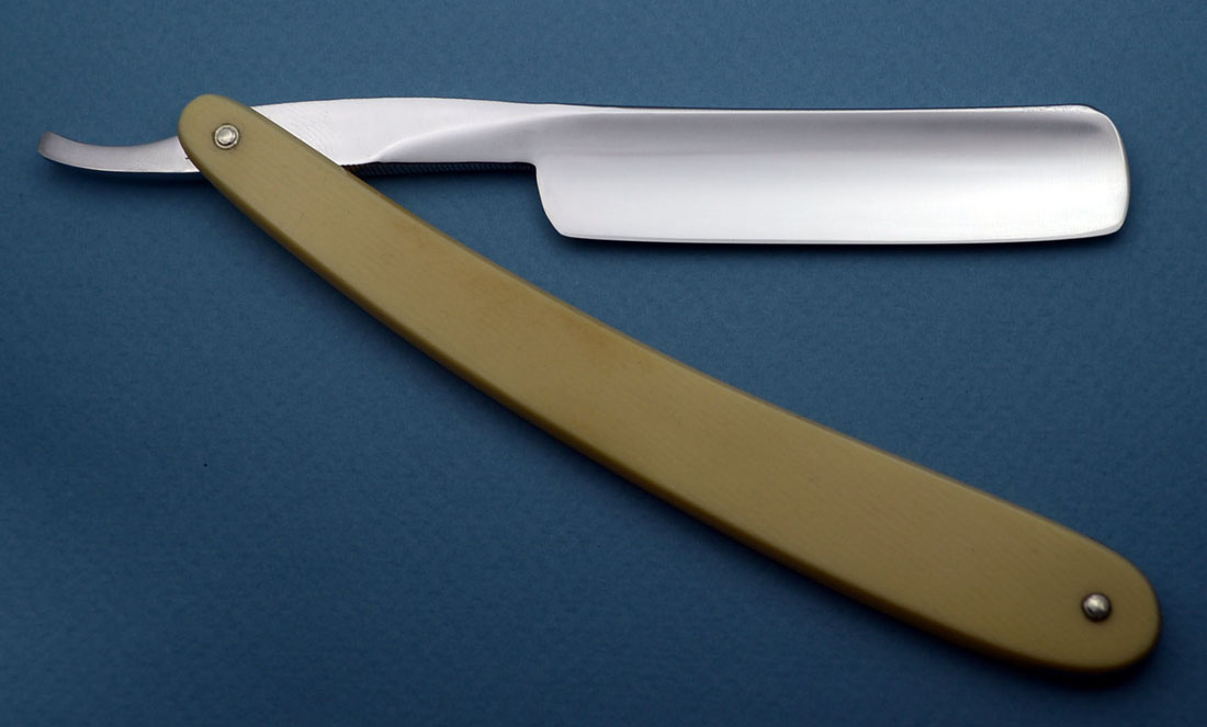 Насколько я понимаю, бритва изготовлена в Германии по заказу американской фирмы. Ручка из кости, в приличном состоянии. Заточена и полностью готова к бритью. Ширина полотна 19 мм, толщина в обушке 5 мм.