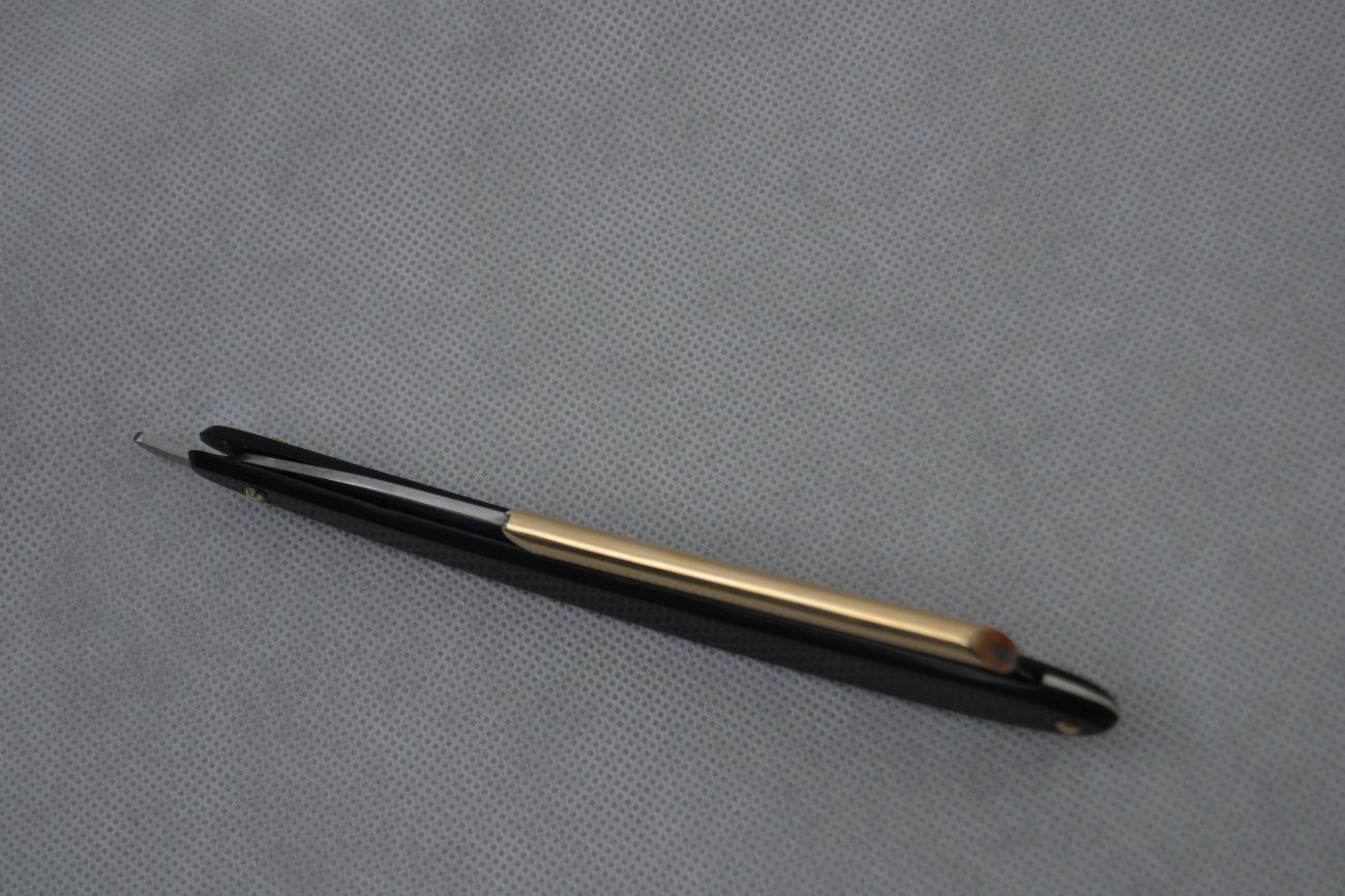 Английская бритва под торговой маркой Eclipse от Братьев Гилберт. Вогнутость 1/2, ширина 6/8. Необычная форма спинки. Новая ручка из рога буйвола насыщенной черно-белой расцветки. Рог очень высокого качества. В комплекте родной футляр гробиком в замечательном сохране. Заточена, готова к бритью. Продано Spoiler Show