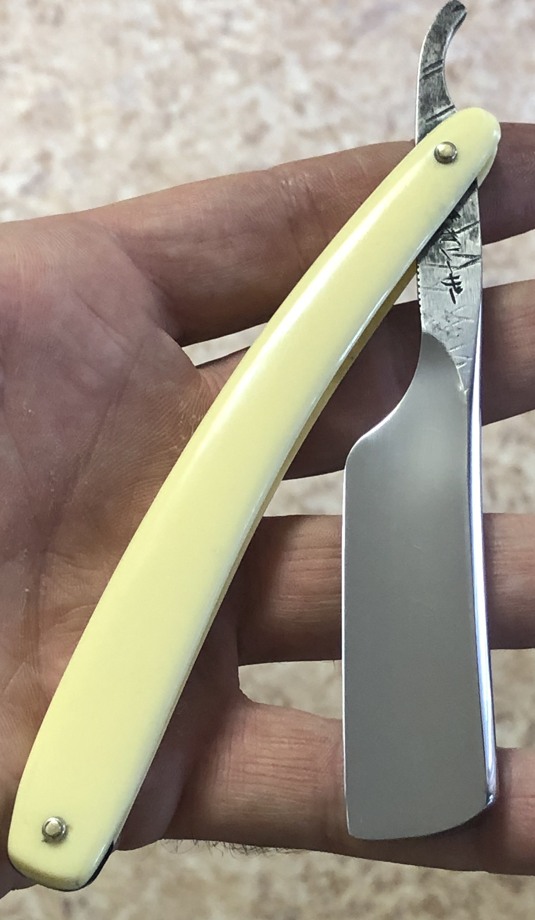 Клинок в очень хорошем состоянии.Немного исправил "обратную улыбку", почистил ,восстановил оригинальный гринд,в меру своих возможностей и отполировал.Касаемо оправы...Роговая, натуральная ручка ,древняя,от французского донора 19-го века.(Немного длинновата, конечно, но в любом случае лучше, чем какой то заводской пластик. ) Так как на оправе имелись довольно большие отверстия под пины, то мною было принято решение поставить именно такие шайбы, возможно крупные,зато надёжные.Сталь чистая, без видимых дефектов. Идеальная геометрия клинка:кромочка равномерна по всей длине.Бритва получилась немного тяжелее, по сравнению с бритвой в оригинальном исполнении.В любом случае,бритва приятна во всех отношениях. Брить должна неплохо. Заточена и готова к бритью.