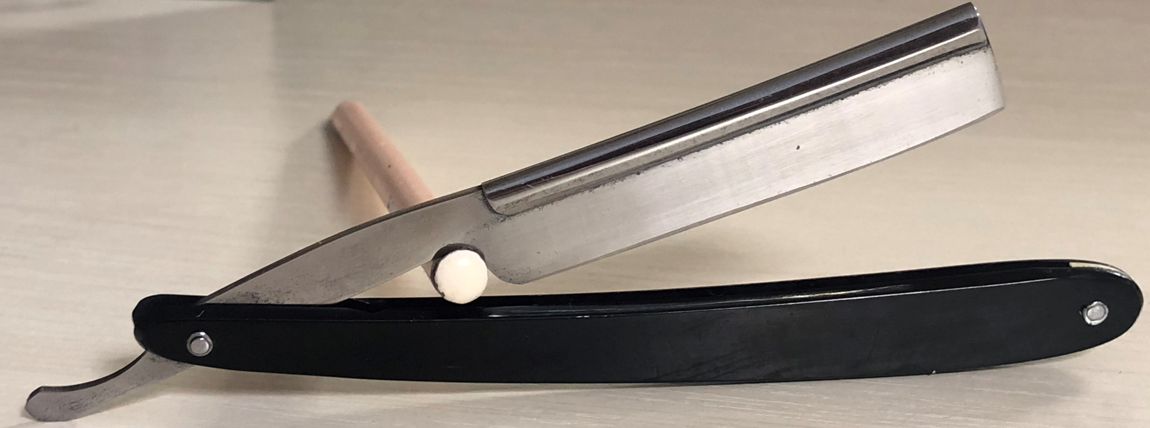 Бритва в очень хорошем состоянии для своих лет. Разобрал, немного освежил металл и снова собрал.Следов активного пользования и уточки клинка не замечено. Родную оправу не стал менять из за небольшой трещинки, которую намертво проклеил и зашлифовал.Кромочка равномерна по всей длине. Сталь чистая от разного рода видимых дефектов. Очень удобная и приятная бритва, во всех отношениях. Будет идеальным вариантом для новичка и просто в коллекцию, так как думаю что бритва достаточно редкая. Никогда ничего подобного не видел.Заточена и готова к бритью.