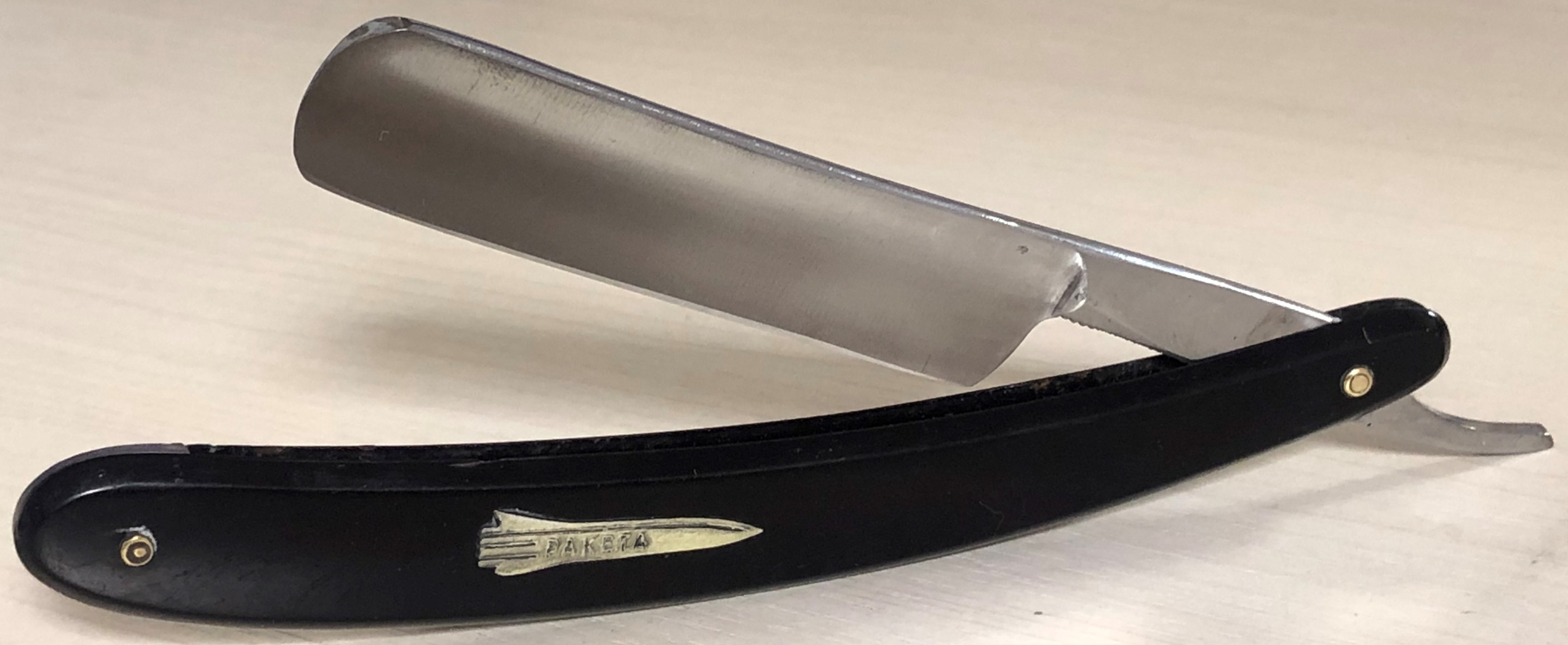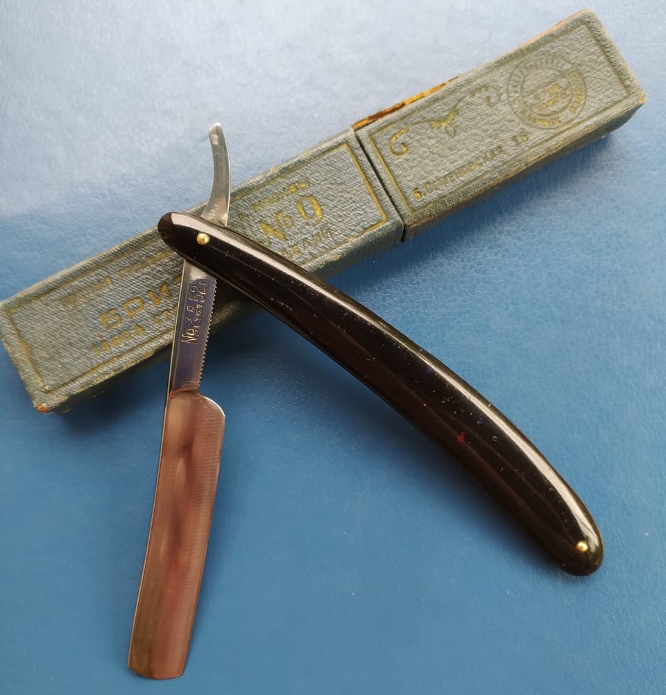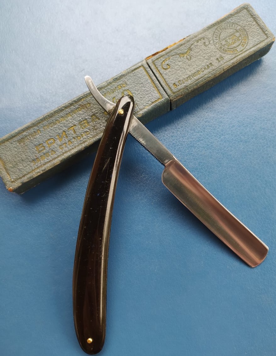 Бритву разобрал, почистил и снова собрал, добавив внутренние шайбы и сохранив оригинальные пины.Идеальная геометрия клинка:кромочка равномерна по всей длине.Очень неплохая сталь с точки зрения заточки.Думаю, что и бритье не разочарует. Родная оправа также в очень хорошем состоянии. Бритва среднего размера,без признаков активного пользования, главное, недорогая, будет отличным вариантом для новичка и просто в коллекцию.Заточена и готова к бою.