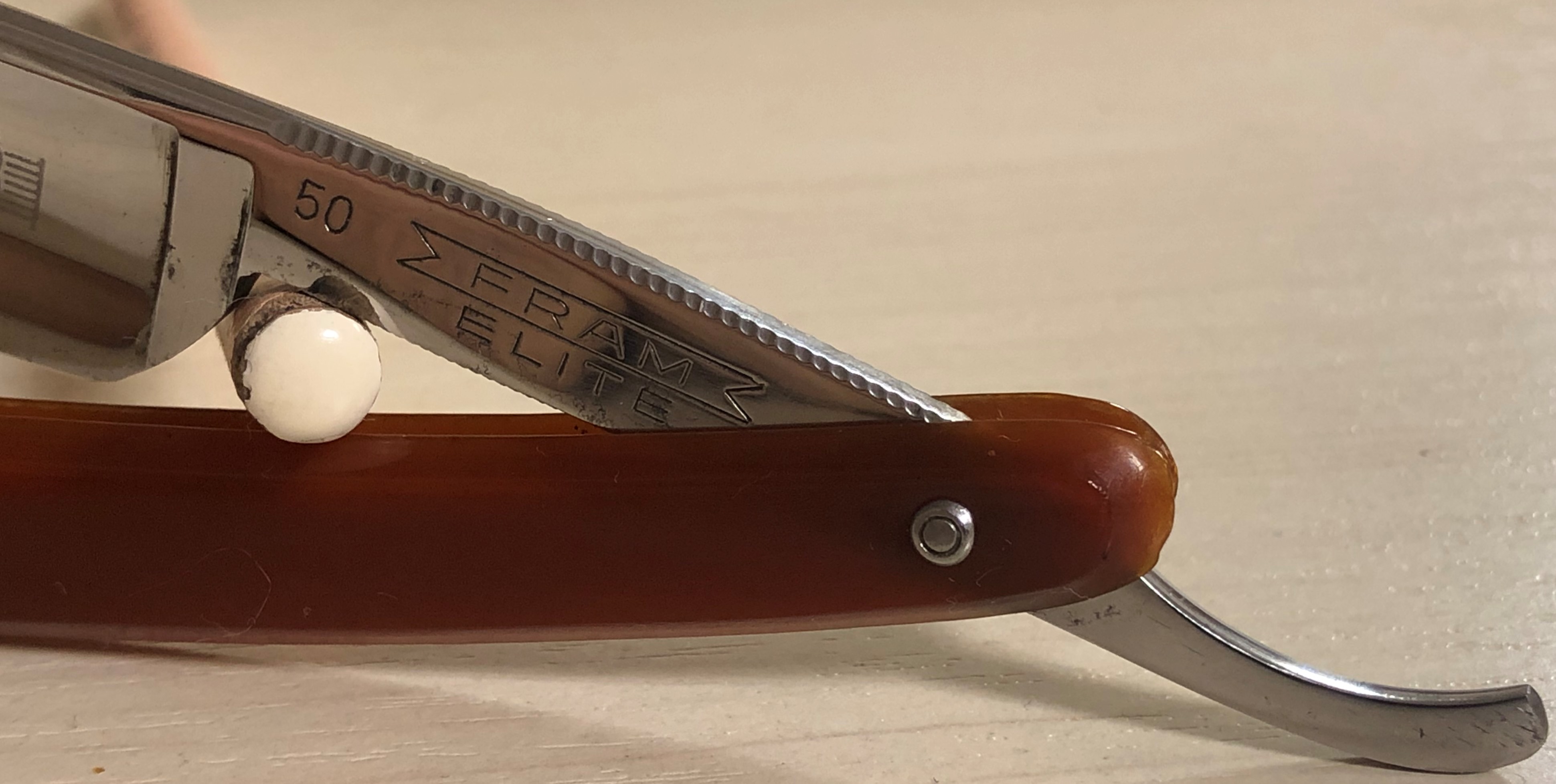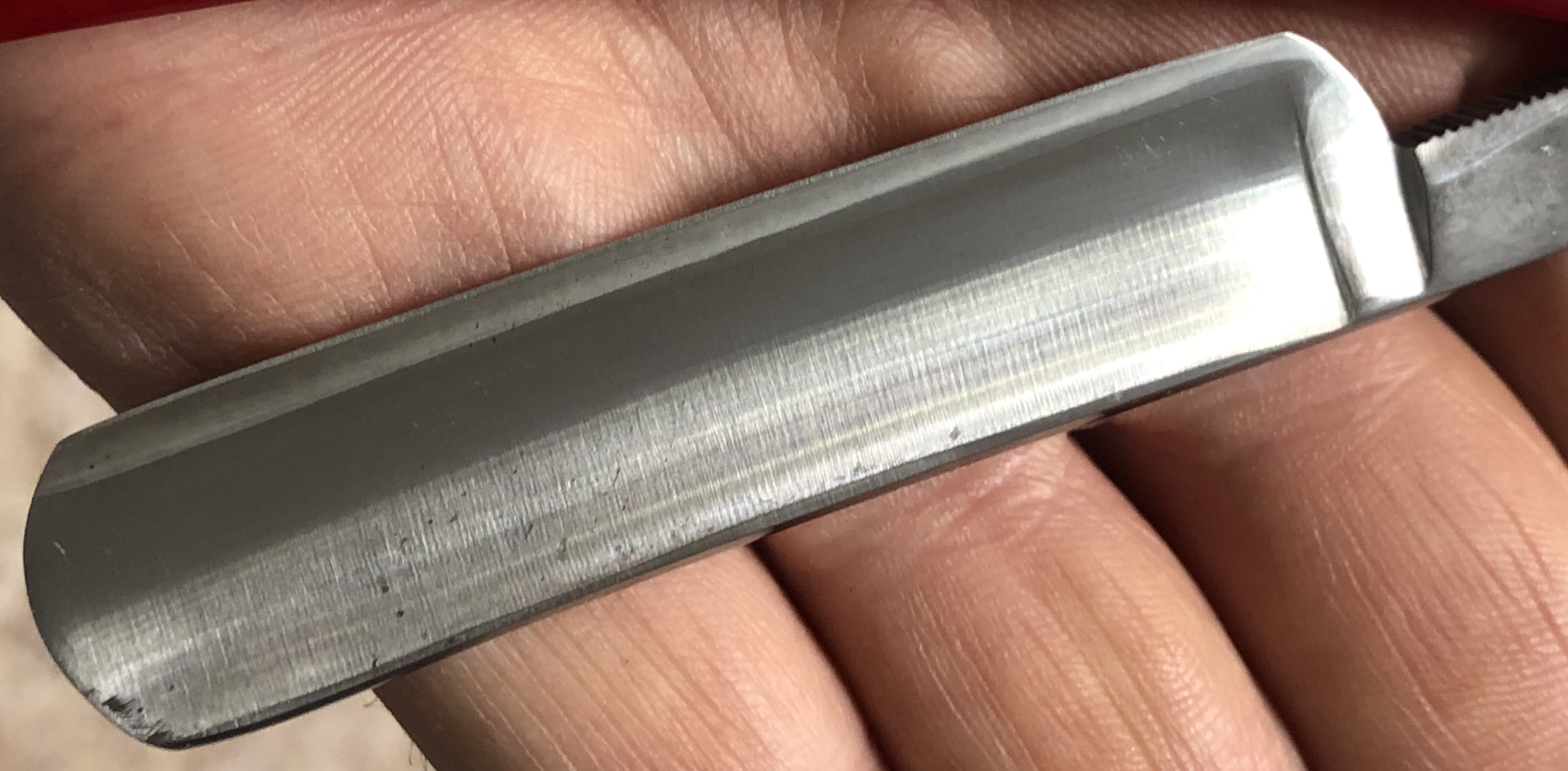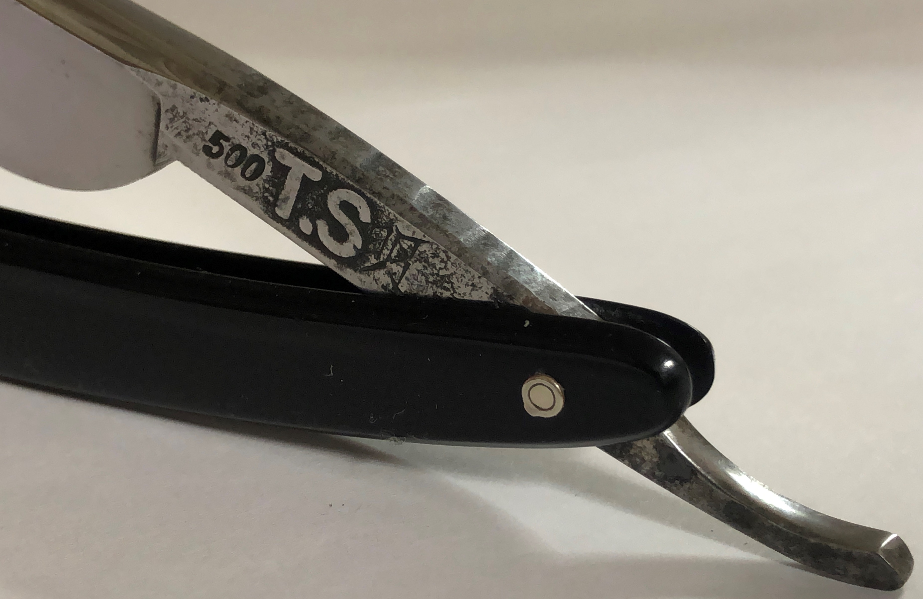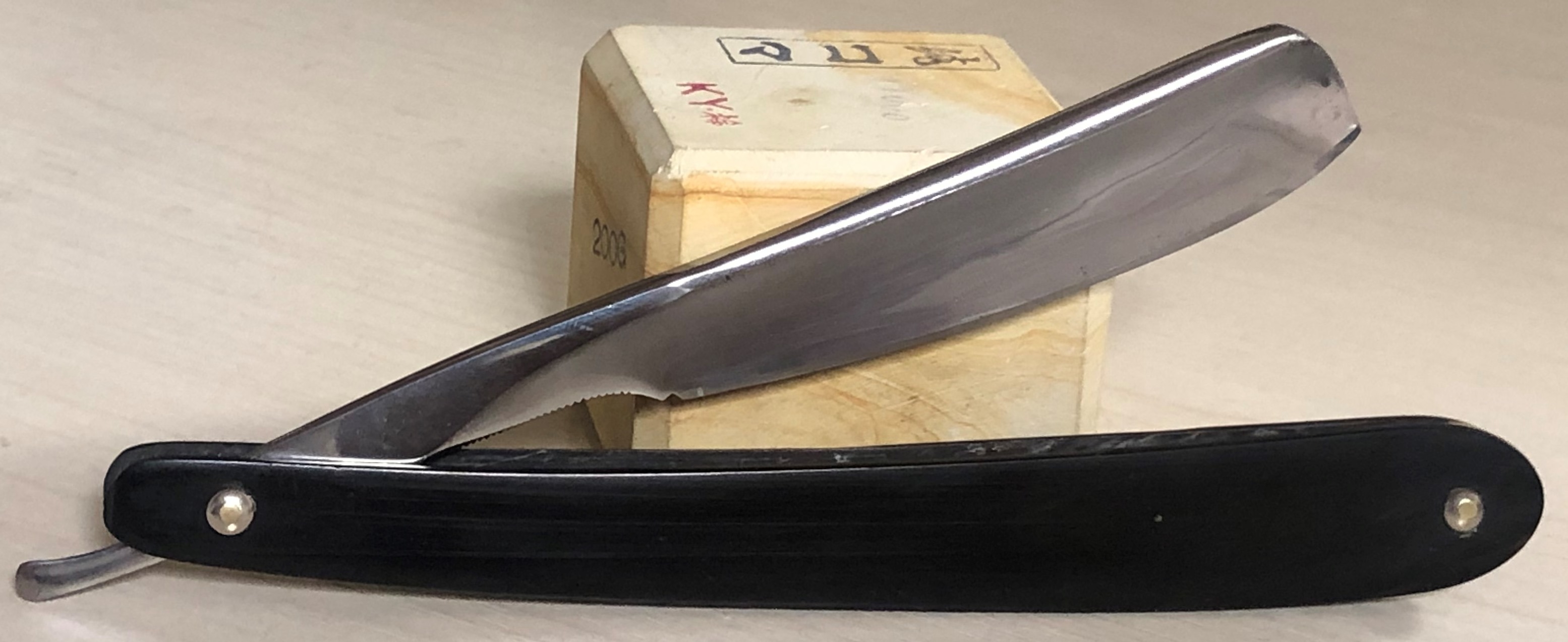 Не стал стачивать много "мяса", чтобы убрать все изъяны и рытвинки металла, а просто почистил и заточил.В целом клиночек чистый, за исключением небольшого количества у обушка.Кромочка равномерна по всей длине.Сталь очень неплохая в плане заточки, впрочем как и большинство французских бритв этого периода.Роговая оправа в очень хорошем состоянии, практически без отгрызанных мест. Массивная , тяжёлая бритва. Заточена и готова к бритью.