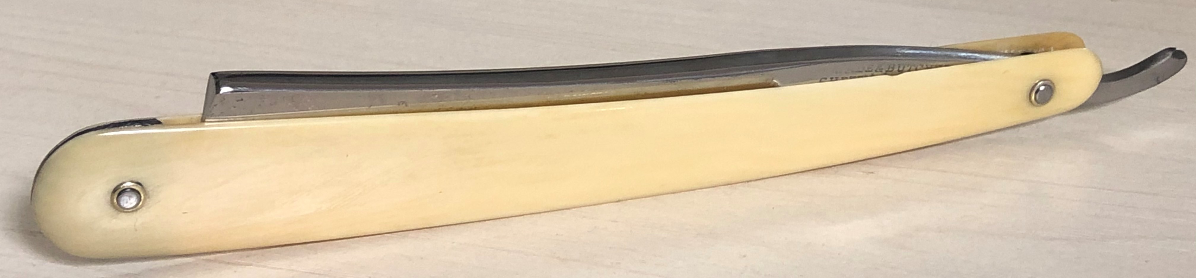 Изюминкой в компоновке данного раритета стал сюртук , пошива конца 19-го,начала 20-го веков.Имеется ввиду ручка из натуральной кости, от старинного донора. Оправа мощная, крепкая, тяжёлая, в идеальном состоянии.Пины удалось заново поставить оригинальные, от Ивасаки.Клинок в прекрасном состоянии,без видимых дефектов. Идеальная геометрия полотна:кромочка равномерна по всей длине.Сталь звонкая, отличного качества. По всем параметрам твердая, больше подошла бы для жёсткой щетины, но и для опытного пользователя будет очень неплоха. В общем и целом я доволен своей работой. На мой взгляд, отличная вещь для повседневного бритья.Заточена и готова к бритью.
