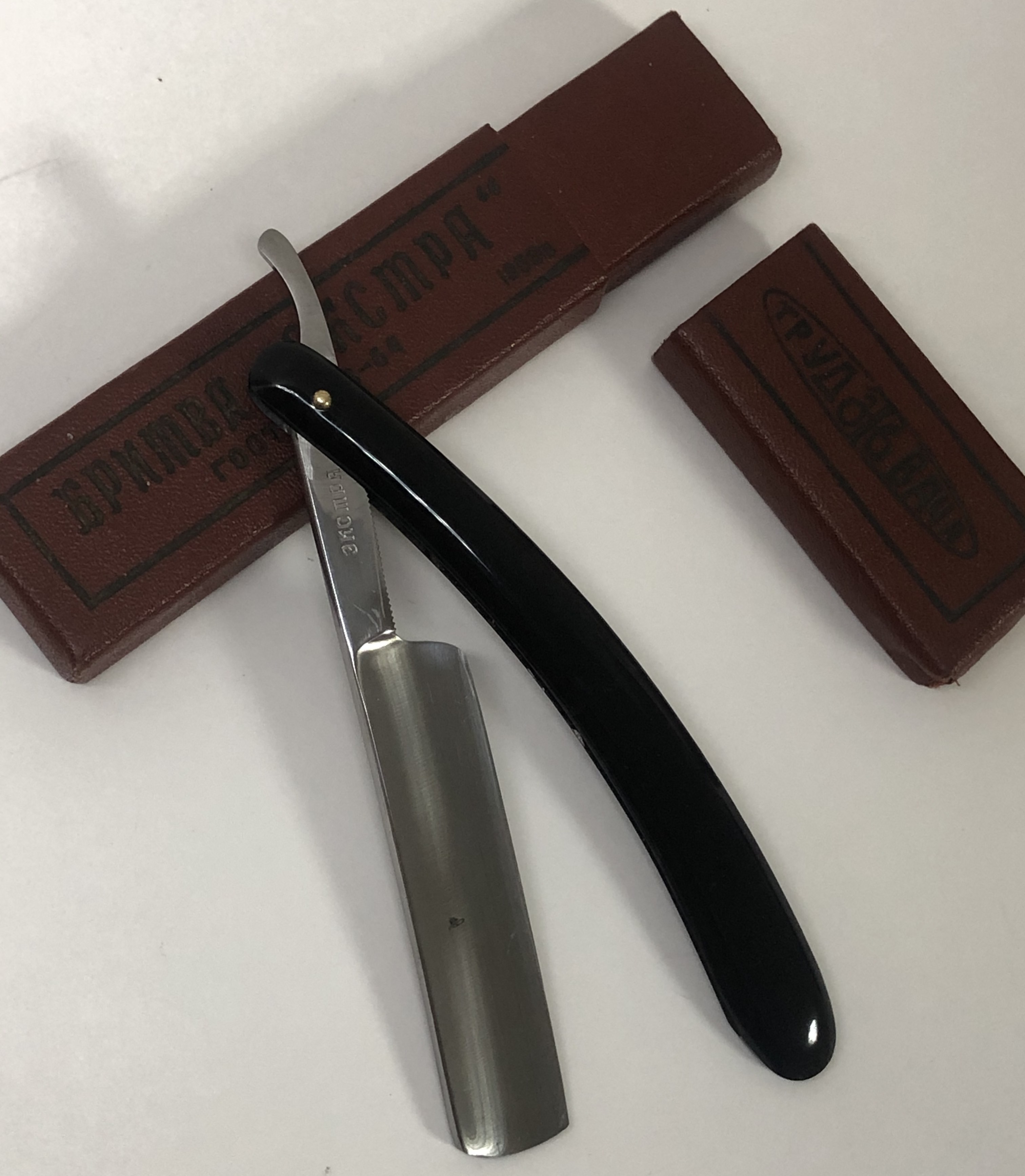 Бритва в состоянии приближенному к идеальному. Разобрал, почистил район осевого пина, полирнул полотно и заново собрал, добавив внутренние шайбы и установив новую немецкую двух-цветную втулку.Сталь и кромка чистые, без видимых дефектов. Идеальная геометрия клинка:кромочка равномерна по всей длине.Коробочка от "КАМЫ".Заточена и готова к бритью.Очень хорошая, добротная и совершенно недорогая бритва для новичка и не только.