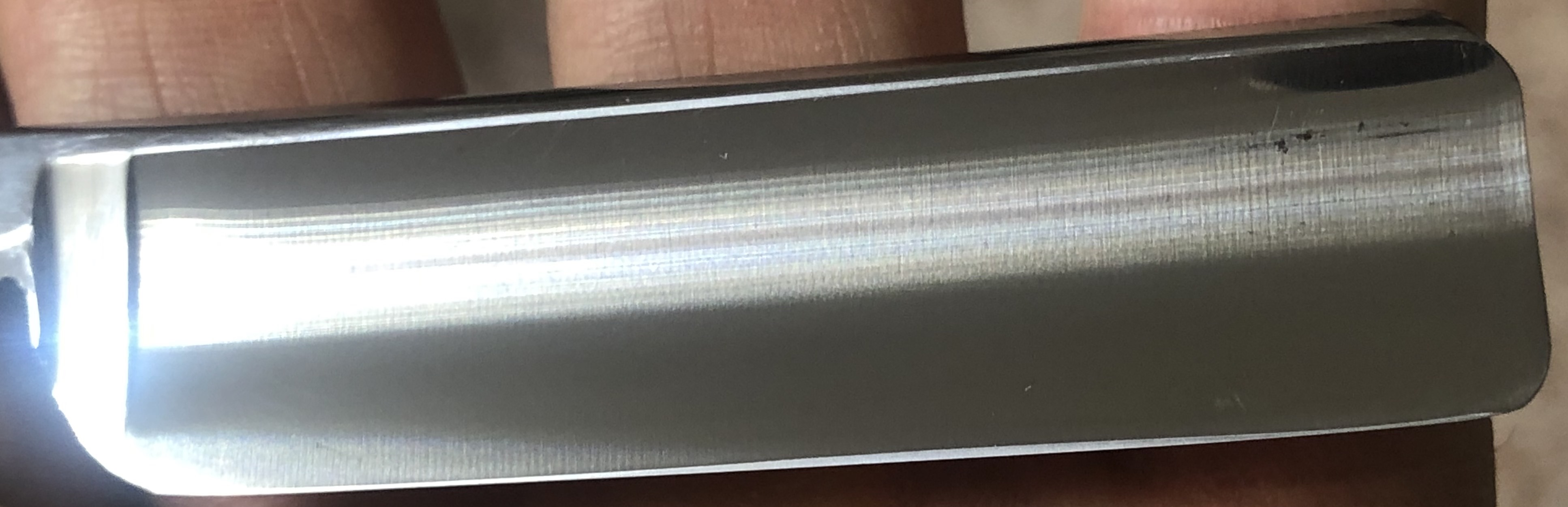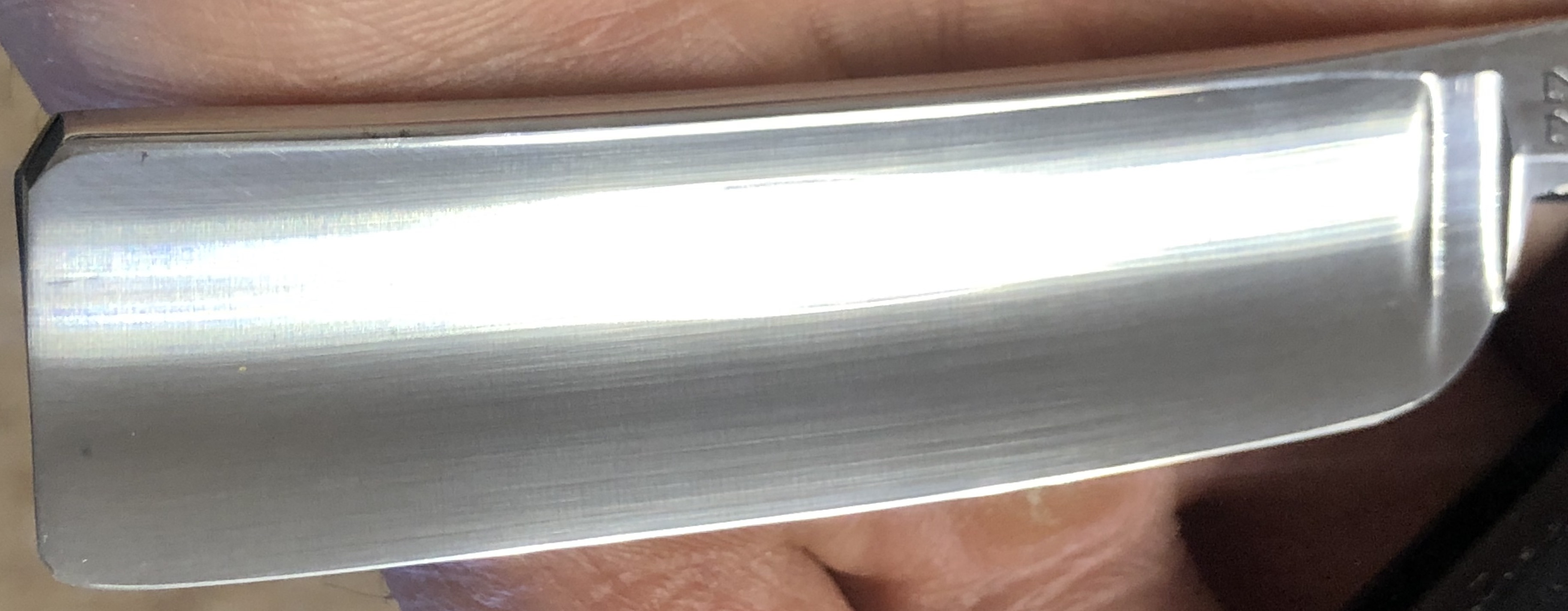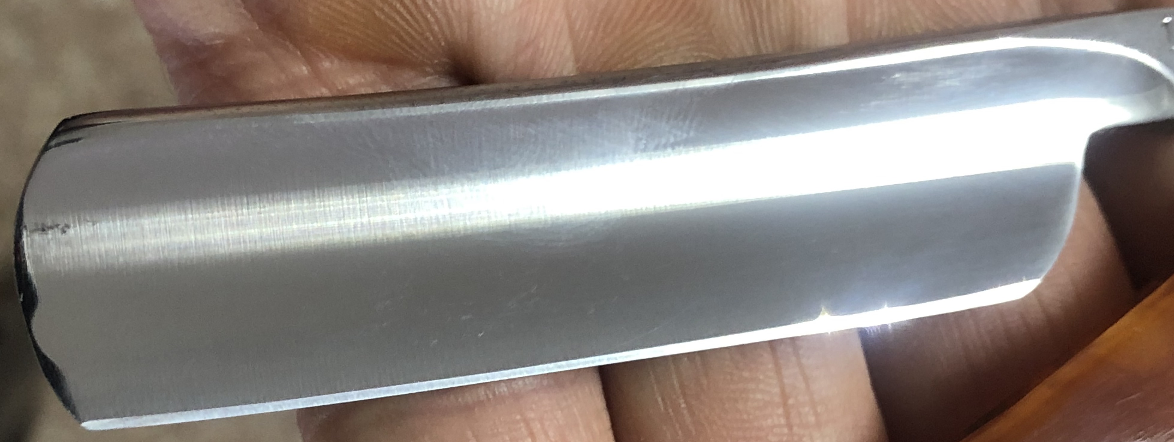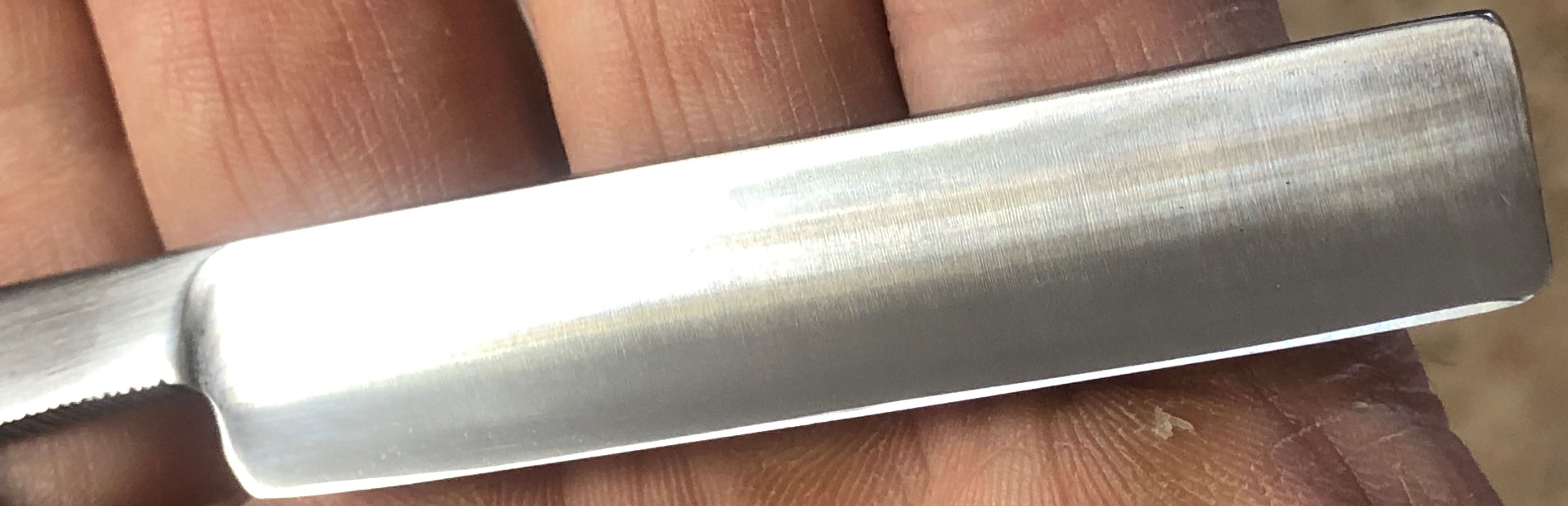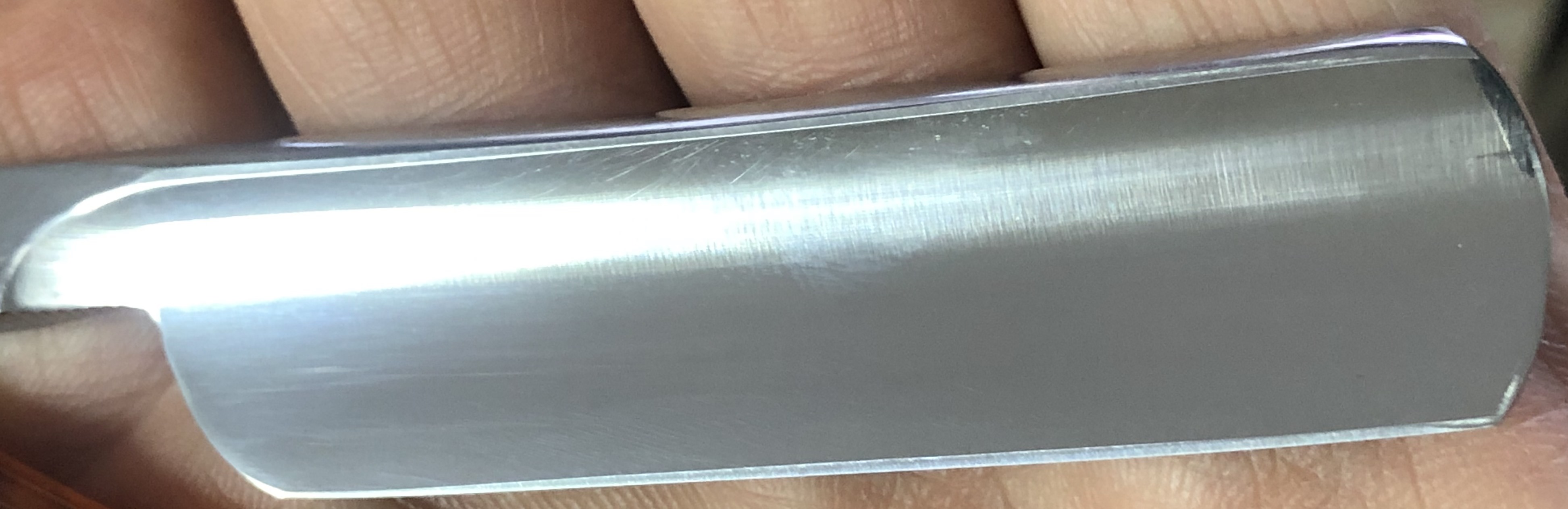 Бритва в идеальном состоянии,без следов пользования.С большой долей вероятности вообще не была ещё в деле.Не разбиралась.Немного освежил клинок от патины, на самых тонких абразивах и полирнул.Состояние новой бритвы.Идеальная геометрия:кромочка равномерна по всей длине.Сталь чистая, без дефектов.