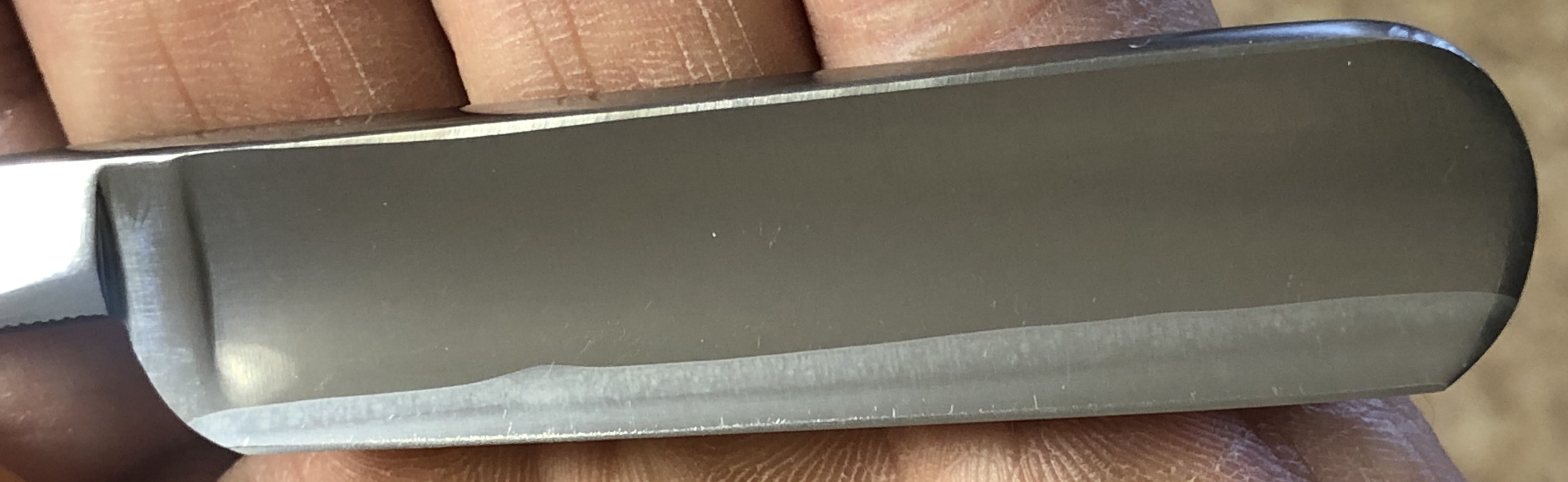 Идеальная геометрия полотна:кромочка равномерна по всей длине.Сталь чистая, без видимых дефектов.Ничего не болтается и не люфтит. Очень неплохой вариант для новичка, как удобный и совершенно недорогой инструмент.