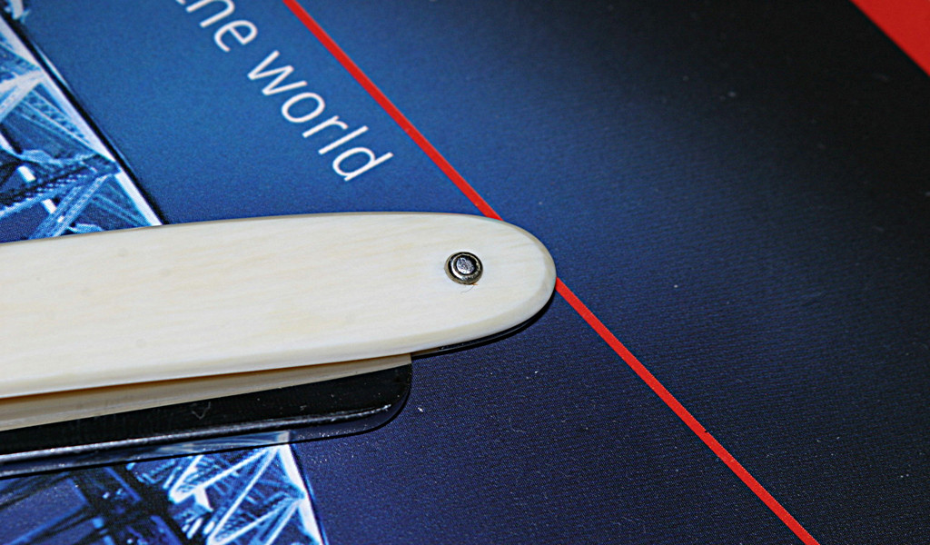 я нагрел на газу стальную швейную иглу и каснулся ею с внутренней стороны в районе верхнего пина.В результате появился характерный запах жжёной кости,такой запах бывает в стоматологическом кабинете во время обработки зуба бормашинкой. Этот запох является 100% подтверждением того что ручка из натурального материала. А годичные полосы но бивне отличают его от кости,которая имеет своеобразные углубления(дырочки). Также эта ручка не ростворяется в ацетоне,спирте и т.д. Omnia praeclara rara./Всё прекрасное редко.