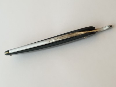 Продаётся от S&T67. Винтажный французский бесхвостый клин, под восстановление. От клейма остались полунамеки на пару букв. Ширина клинка 16мм. Ручка из рога, в весьма хорошем сохране, крепкая, пины - железо, с внешними шайбами типа "бычий глаз". Мелкая насечка на эрле с обеих сторон. Все родное, бритва не разбиралась, клинок паркуется в ручку по центру, без перекосов.