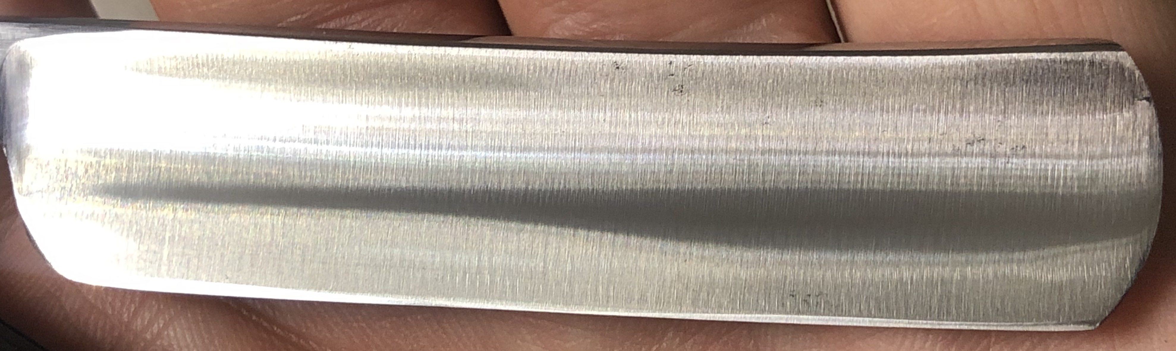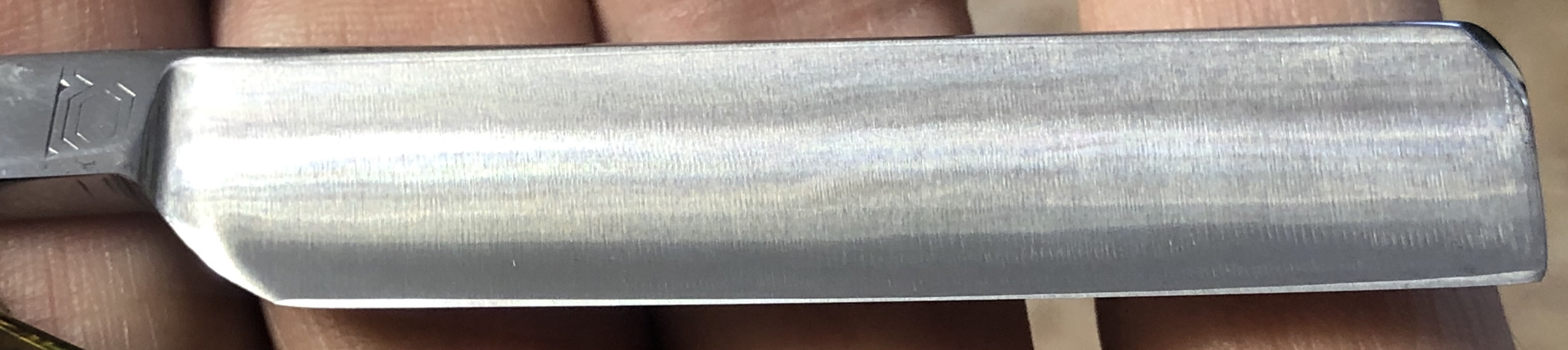 Клинок в очень хорошем и по всей видимости непользованном состоянии.Ручку оригинальную снял и поставил самодельную,от какой то советской бритвы, ручной работы.Материал-прозрачное орг-стекло.Как раз клиночек хорошо зашел в свой новый сюртук. Бритва будет неплохим рабочим инструментом, без какой либо претензии на историческую ценность. На мой взгляд, клиночек ещё долго послужит...