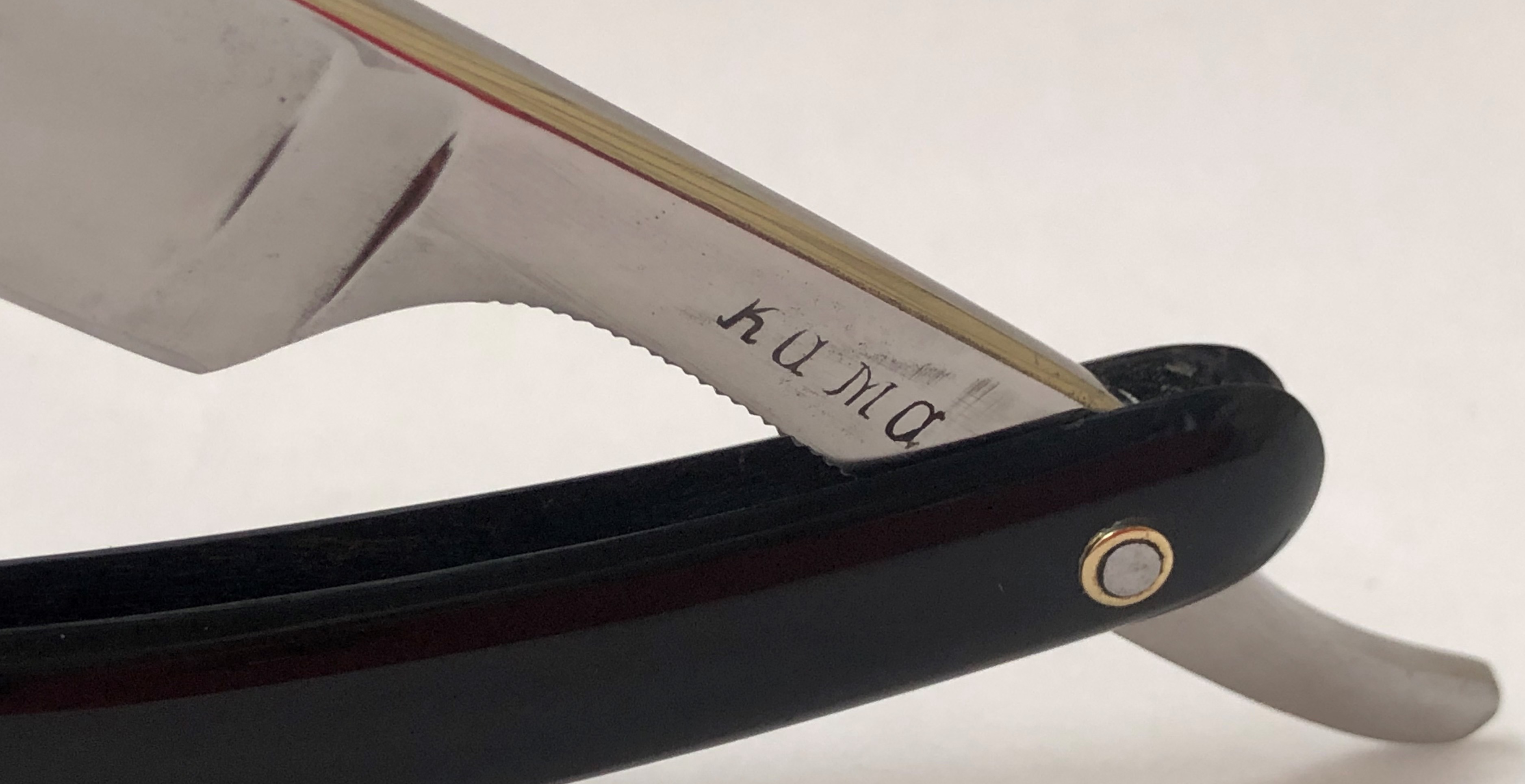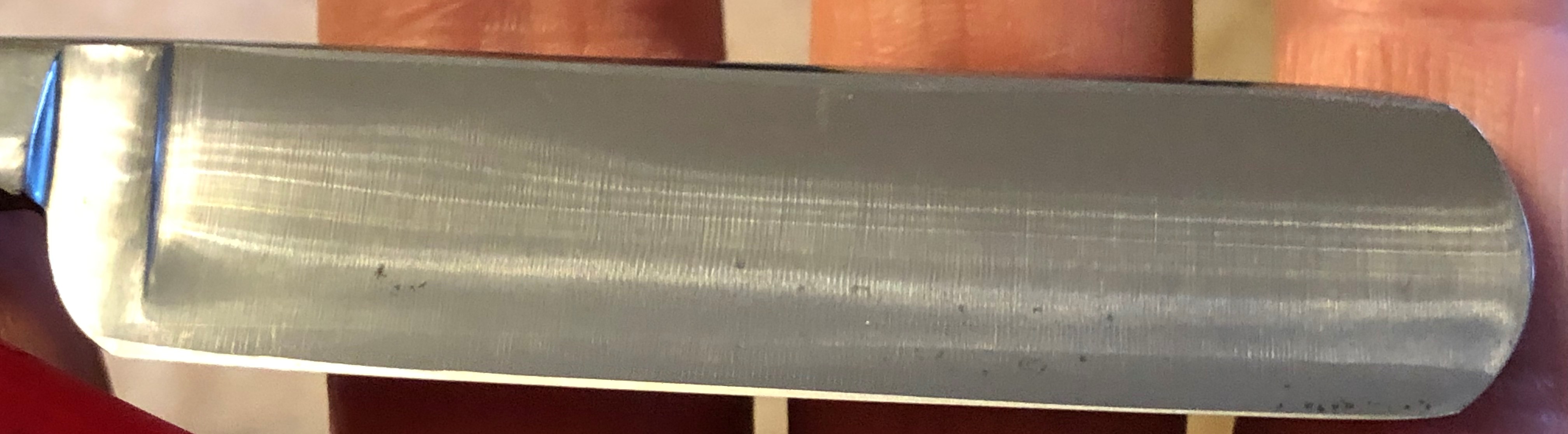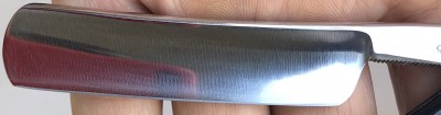 Бритва в состоянии приближенном к идеальному.Не разбиралась и не ремонтировалась. Единственно что, убрал на самых тонких абразивах пятна от остатков воды на клинке.Сформировал "типа-оригинальный" гринд полотна и умеренно отполировал.Сталь чистая от дефектов.Кромочка почти идеально ровная по всей длине. Родная коробочка в хорошем состоянии.