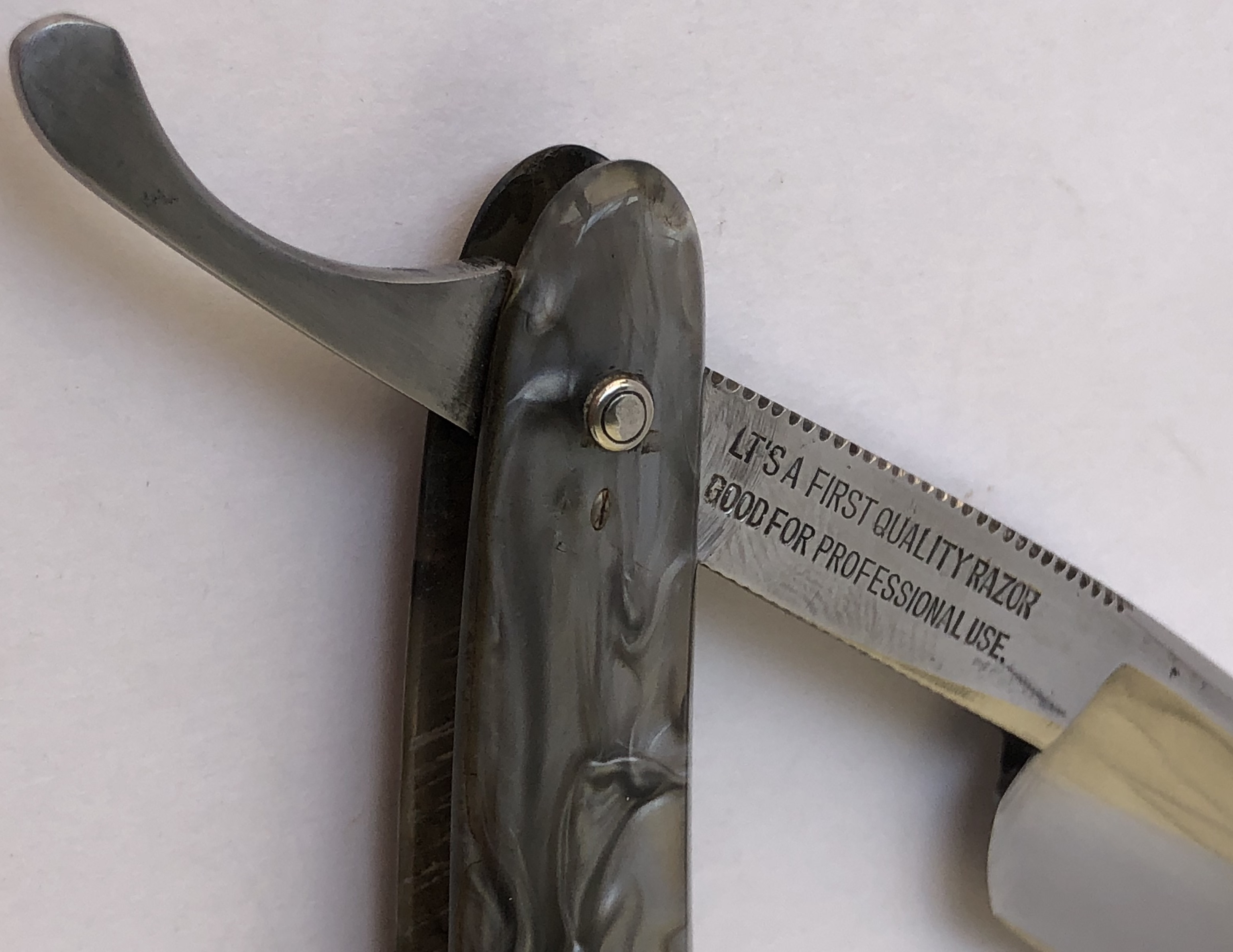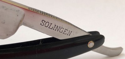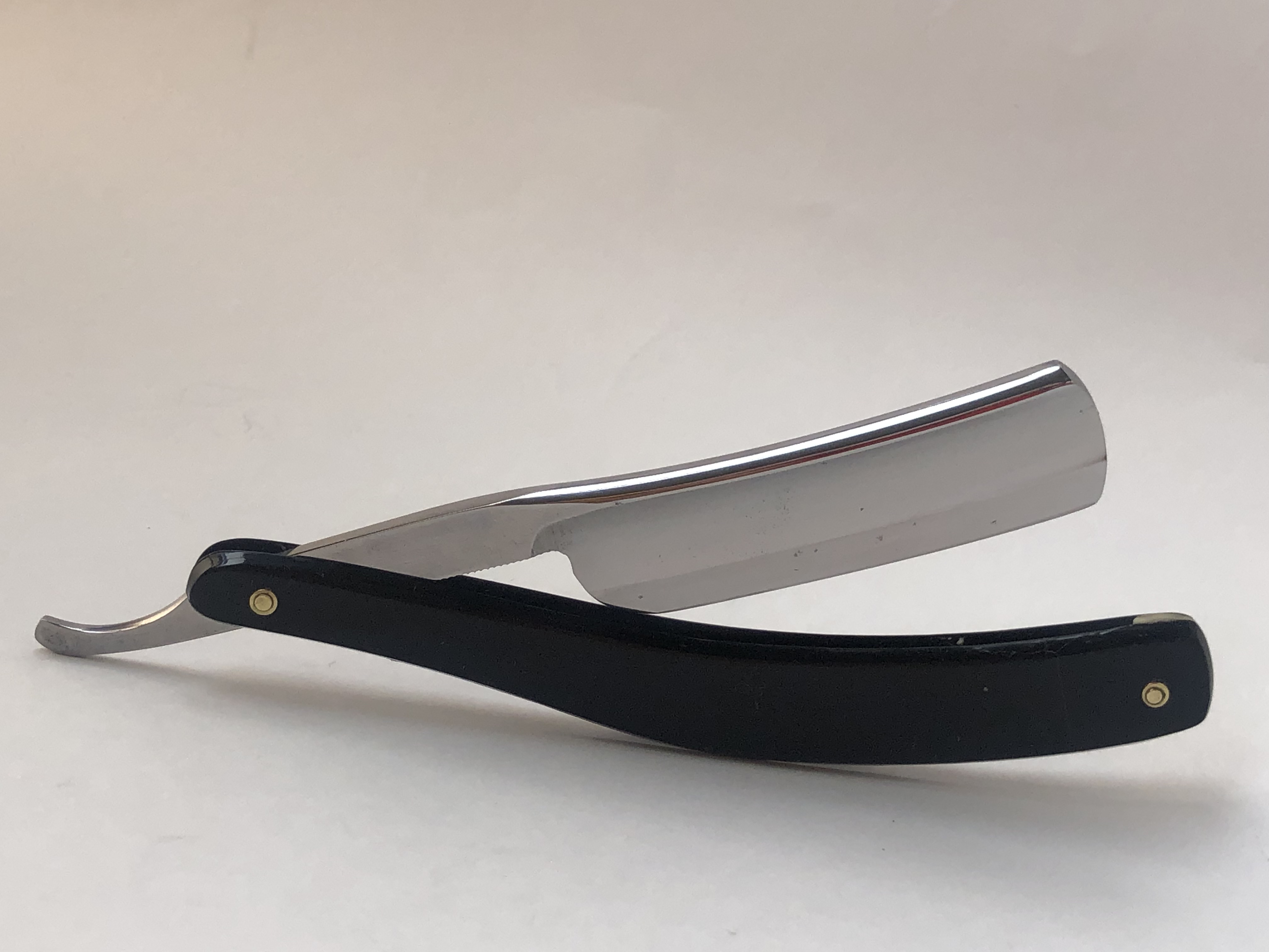 По всей видимости бритва была непользованная, но имела скол на 1.5 мм и немного очагов ржавчины, которые после определенных работ были успешно устранены.Разобрал, почистил, умеренно отполировал и заново собрал, заменив оригинальные пины на немецкие двух-цветные втулки.Идеальная геометрия:кромочка равномерна по всей длине.Бритва продается с 60%-ой скидкой, так что не пропустите..Заточена и готова к бритью.