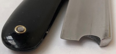Клинок в неплохом, рабочем состоянии.Почистил, отполировал полотно.Ручка была утрачена, так что поставил то,что подошло.Толстая,трёх-пиновая оправа.Заточена Геометрия на уровне.Сталь чистая от дефектов.Заточена и готова к бритью.Совсем недорогой вариант для бритья.