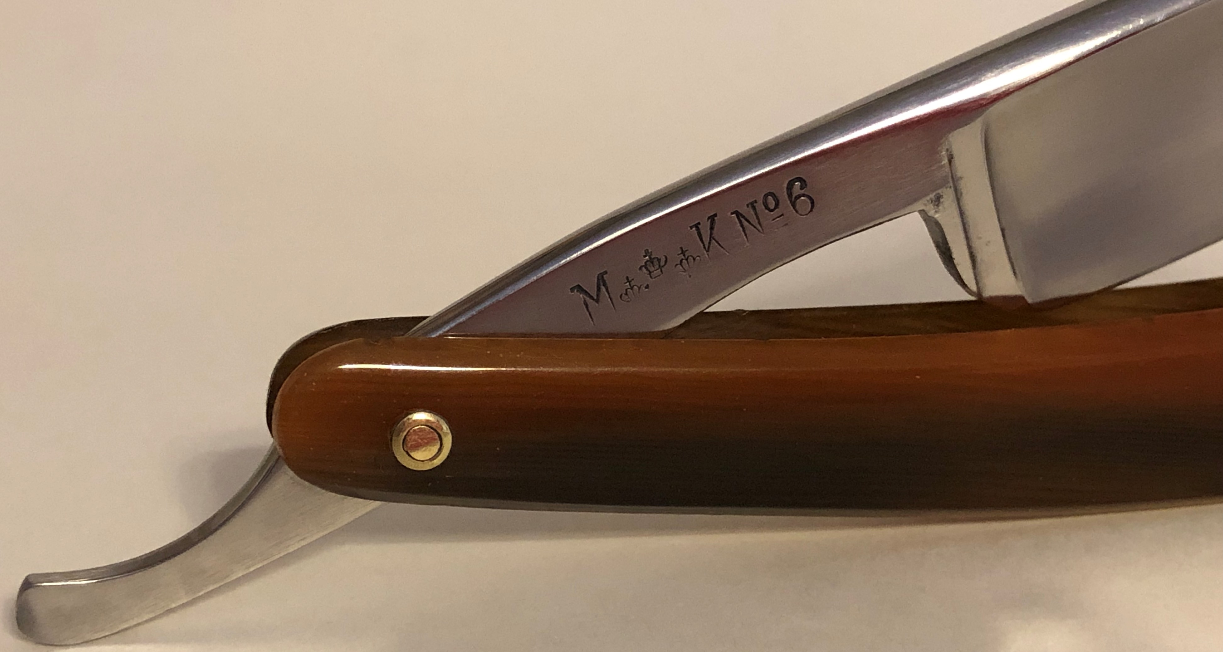 Бритва была разобрана, клинок перешлифован и умеренно отполирован.Заводские пины были сохранены и заново установлены.Очень неплохая геометрия полотна.Кромочка тоненькая по всей длине полотна. Оригинальная оправа также в очень хорошем состоянии. Бритва перед отправкой будет до конца заточена и доведена до комфортного бритья.