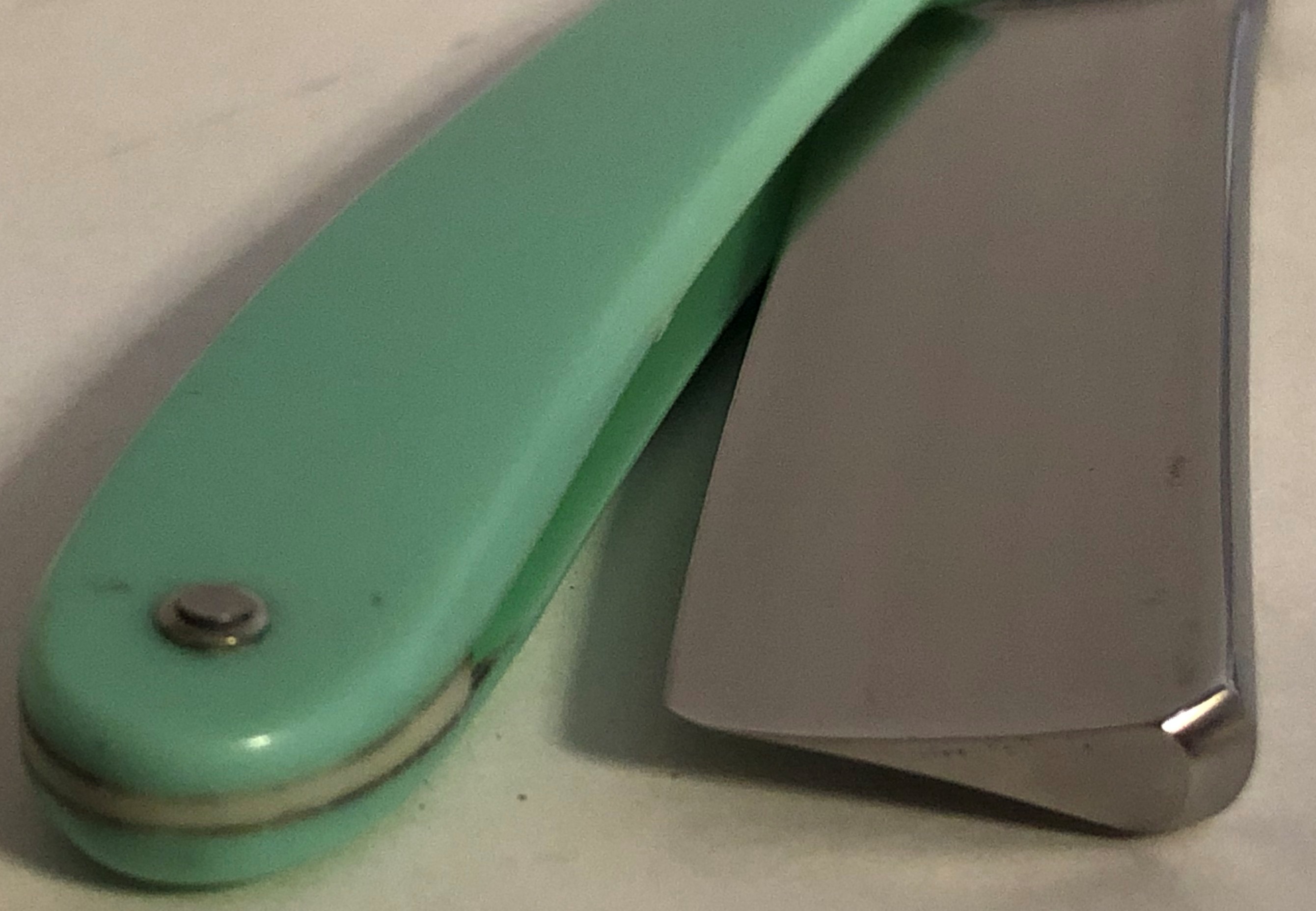 Клинок в нормальном состоянии. По какой то причине была сточена "ступенька" перехода полотна к эрлю. Под обушком,с лицевой стороны, в районе пятки получилась небольшая "ямка" ни на что не влияющая. Смею предположить, что "ступенька" была сточена для каких то барберских целей, чисто под мастера, которому именно так было удобно работать с инструментом. Вижу такое еже не первый раз.