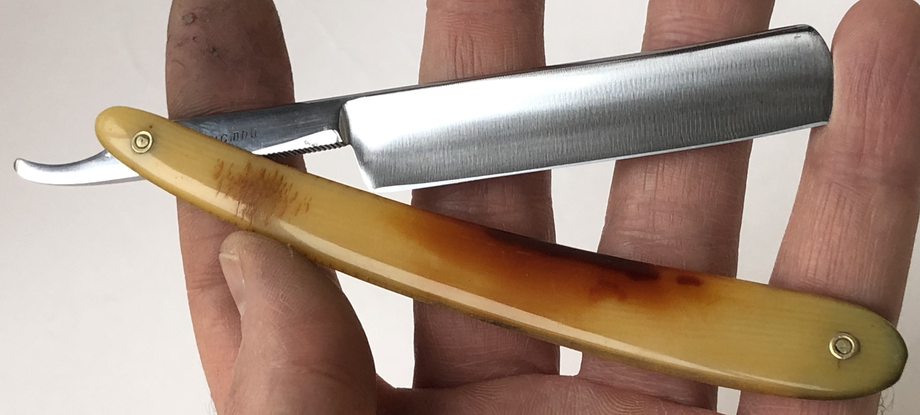 Давно ничего подобного не попадалось.Миниатюрная, но в тоже время достаточно толстая и тяжёлая бритва.Оригинальная форма лезвия.Бритву разобрал, привел в порядок клинок и снова собрал, сохранив родные пины.Сталь чистая от видимых дефектов. Удобная, юркая бритва способна пробрить труднодоступные места.Неплохой вариант для своей коллекции. Заточена и готова к бритью.
