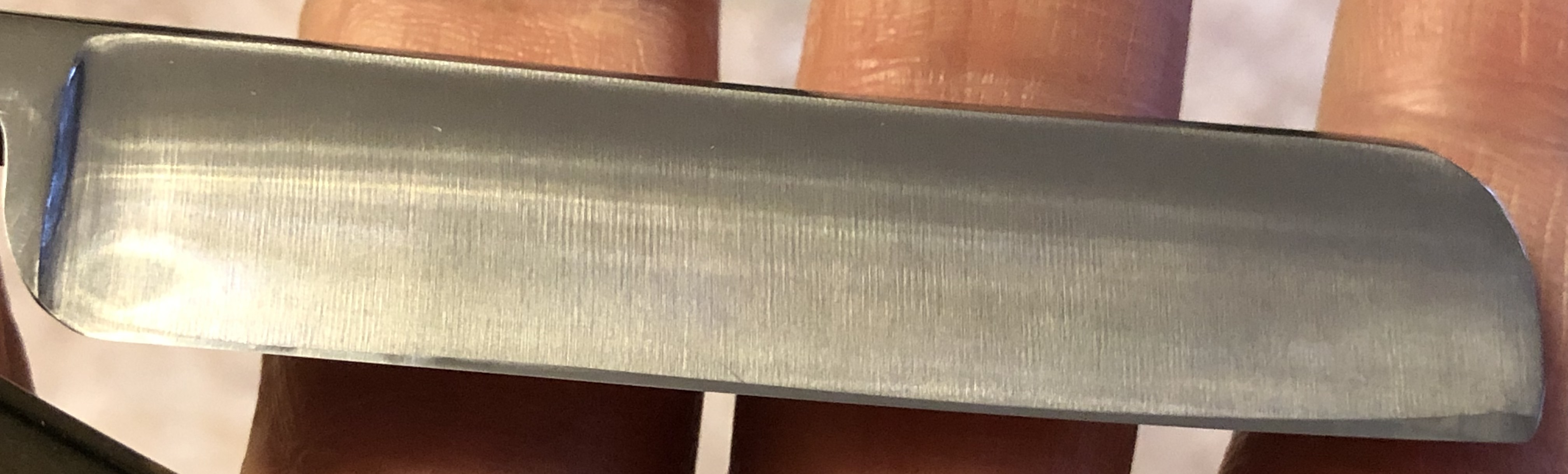 Бритва непользованная, но была разобрана,для удаления окисления в районе осевого пина.Также, прошелся самыми тонкими абразивами по полотну,что позволило восстановить былую свежесть и блеск.Идеальная геометрия клинка:кромочка равномерна по всей длине и практически незаметна.Состояние новой бритвы.Сталь и кромочка чистые от дефектов.Потихоньку тестируя такую же заточенную уже бритву прихожу к выводу, что сталь имеет среднюю твердость и в бритье чем то напоминает англичан начала прошлого века.Бритьё мягкое и чистое, без заметной агрессии. На мой взгляд, подобная форма лезвия и удачный выбор стали и закалки делает инструмент просто незаменимым на все случаи жизни и держа такую бритву, просто не хочется выпускать из рук. Все четко,идеально и без излишеств. Перед отправкой будет заточена и доведена до комфортного бритья.