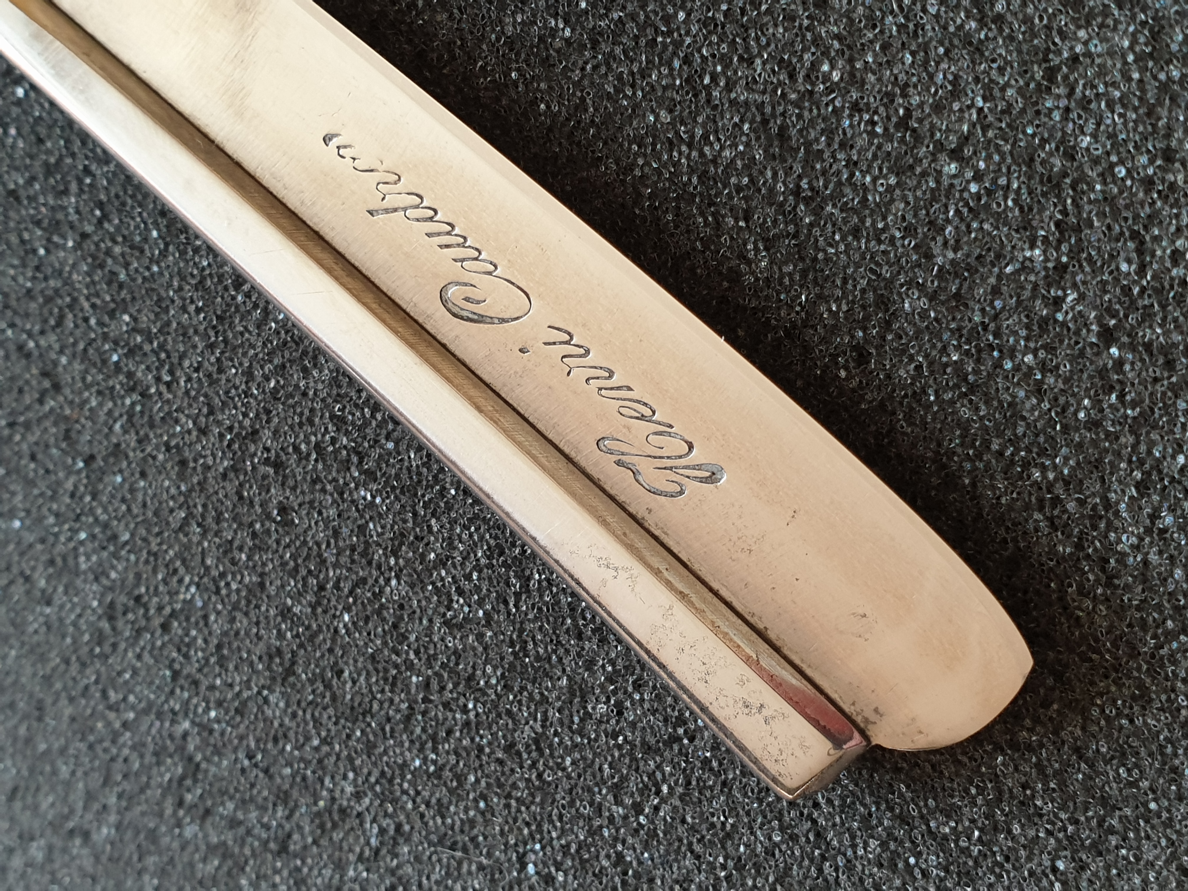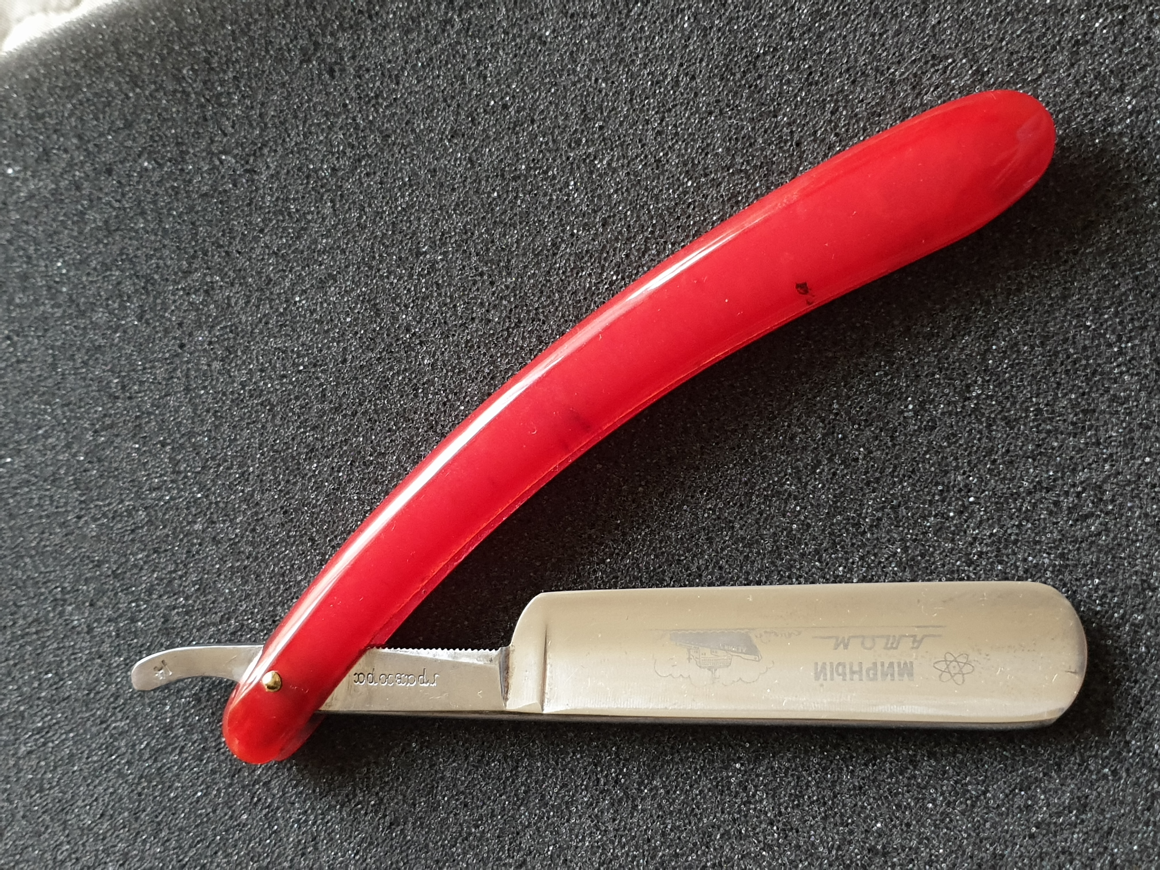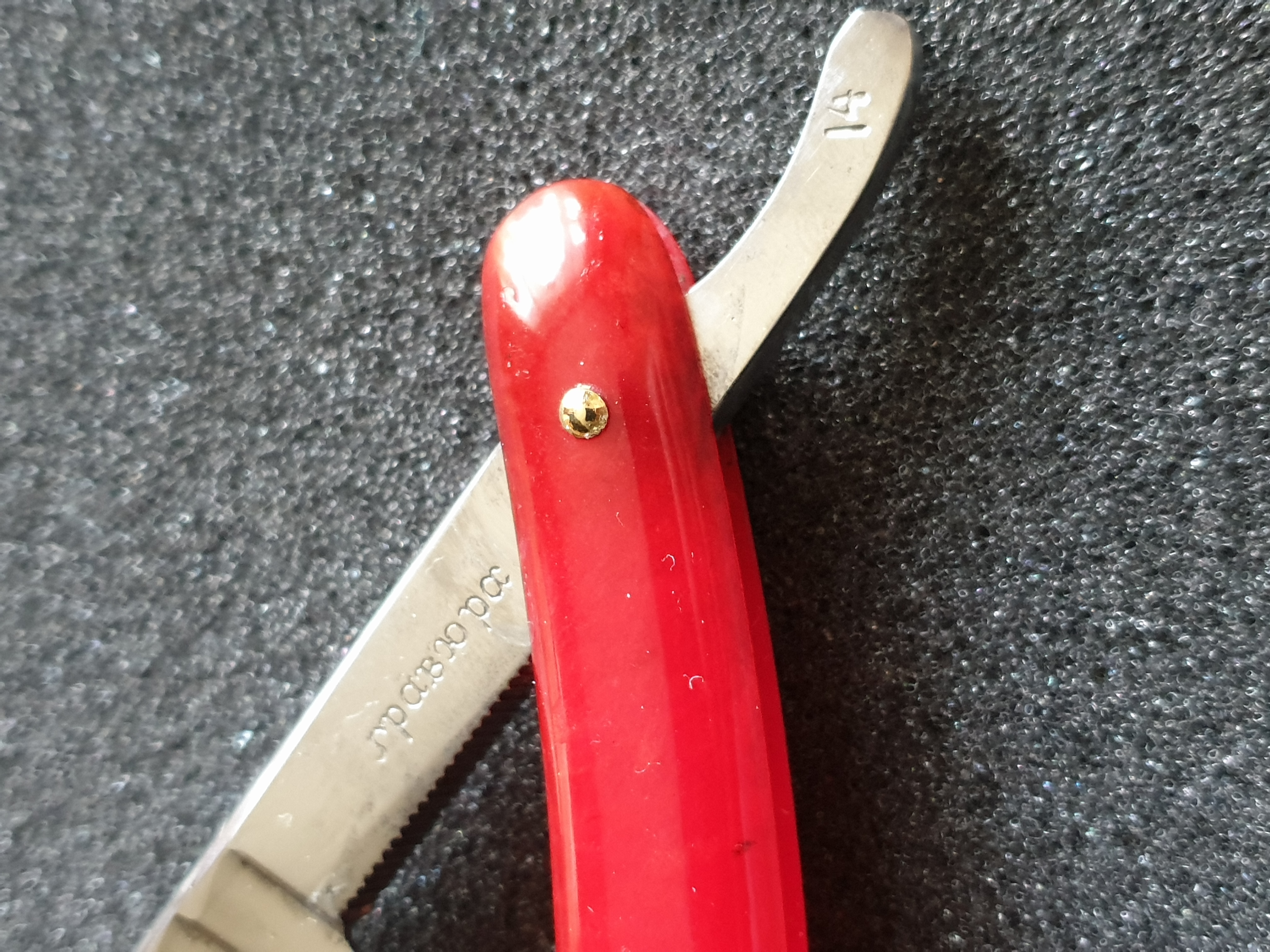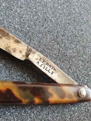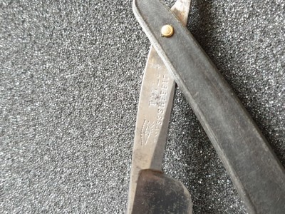 Продаётся от S&T68. Французский винтажный фреймбэк, требует некоторых работ для приведения в порядок. Ширина клинка 20мм, ручка из целлулоида, пины латунные. Все родное, бритва не разбиралась. На кромке был скольчик, он убран, но полноценная заточка не делалась. Клинок паркуется в ручку без закусываний, но с легким "закосом", на ручке грубоватая "персонализация" владельца.