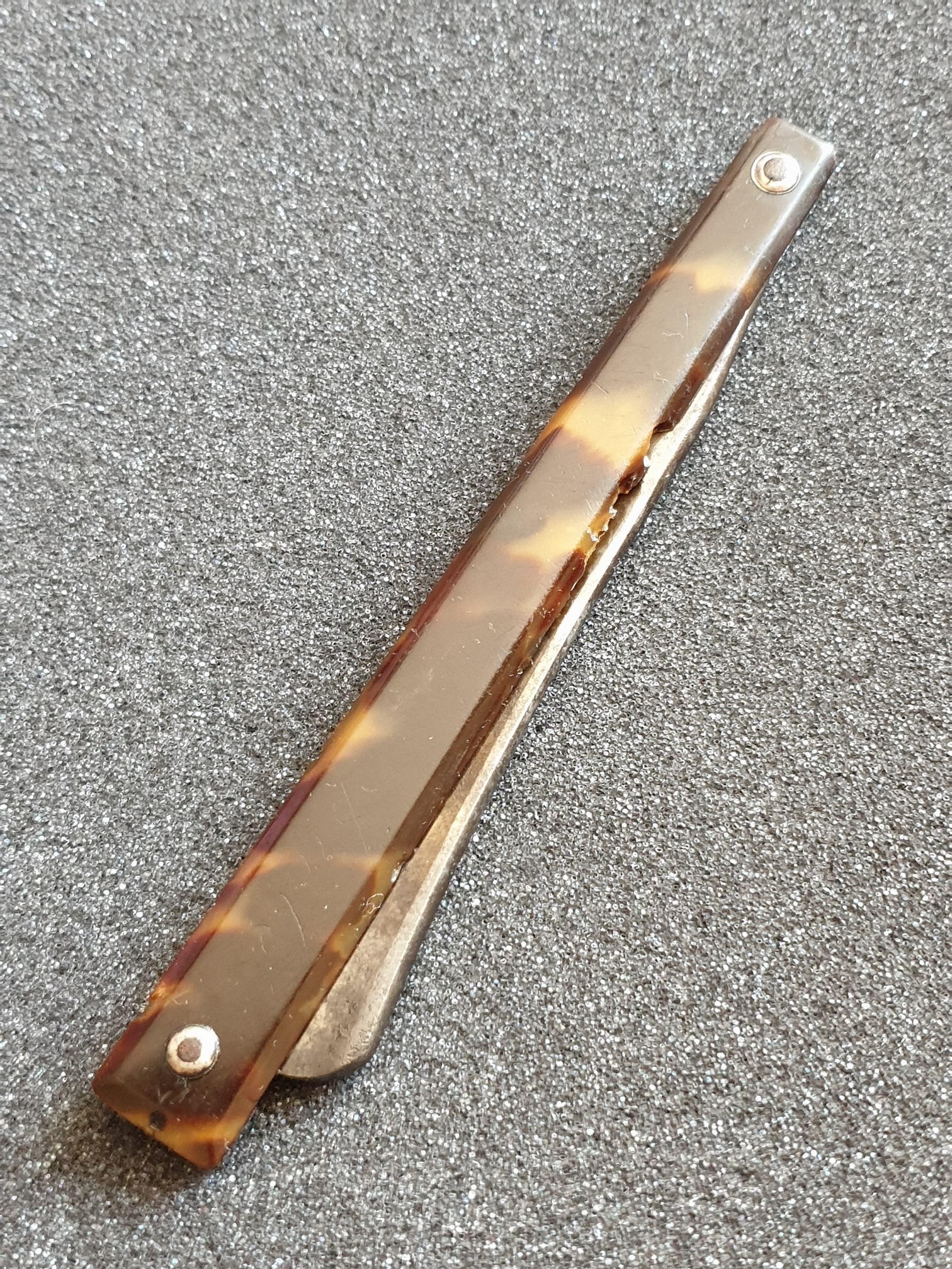Шириина клинка 15мм (10 у эрля), длина рабочей кромки 78мм, между пинами ручки 122мм. Ручка из черепахи, пины железные, внешние шайбы на них без ржавчины, похоже на нейзильбер или даже серебро. Клинышек ручки рассыпался от старости, а черепаха крепкая и ровная, все повреждения бритвы постарался показать на фото. Клинок паркуется в ручку ровно, без закусываний. Бритва не разбиралась, не "улучшалась", только смыта грязь моющими средствами и ручка протерта костным маслом. Продается "как есть". ПРОДАНО Spoiler Show