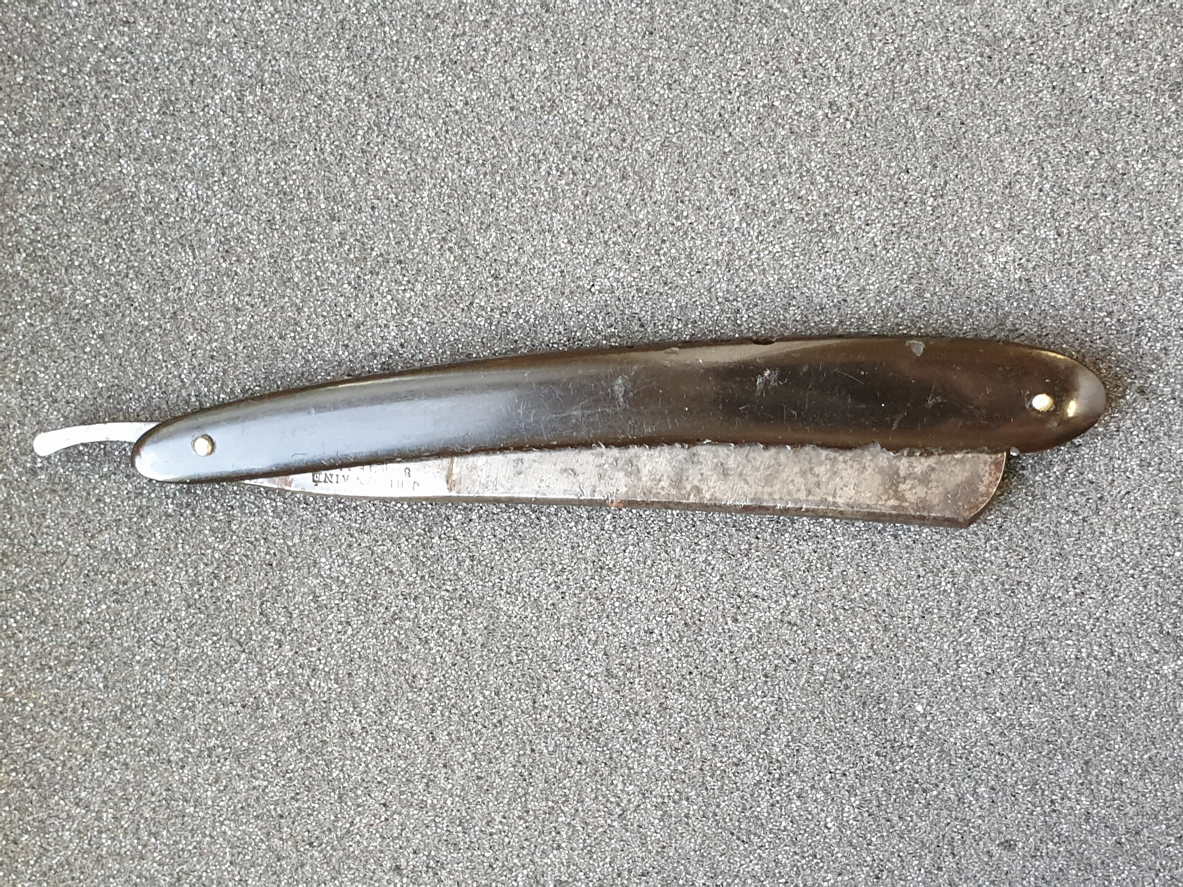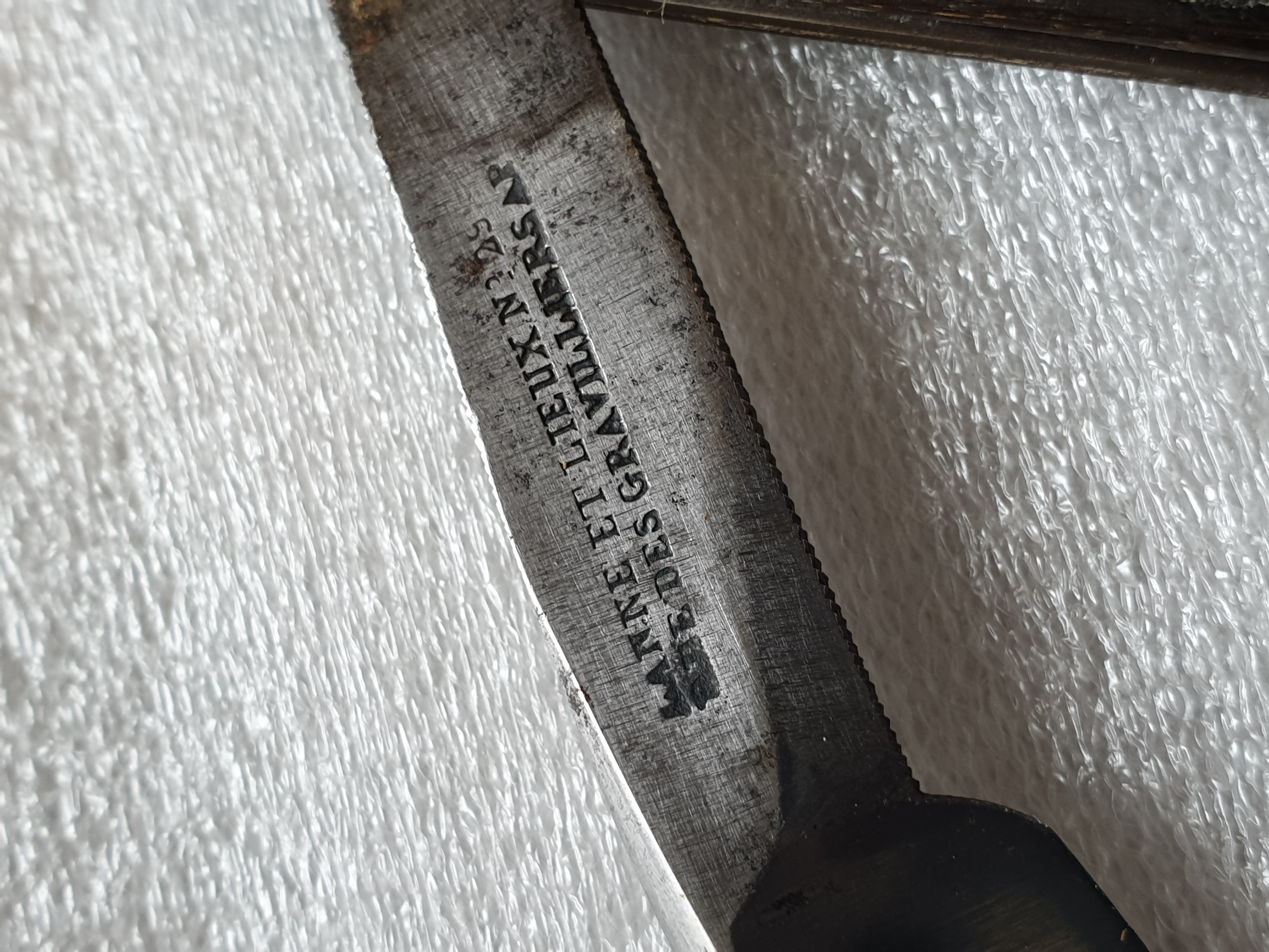 Ширина клинка 20мм, обух 5,6мм, ручка - рог, пины - железо. Все родное, бритва не разбиралась, не восстанавливалась. Одна плашка ручки в отличном состоянии, на второй имеются отслоения рога. Обе плашки ровные, клинышек между ними отсутствует. Родной гринд клинка без существенных повреждений, с двумя локальными пятнами ржавчины в месте касания клинка и ручки в сложенном положении. Клинок паркуется в ручку по центру, без перекосов и закусываний. Поиск по клейму в многотомнике Пажэ дает два упоминания, в первом случае полное совпадение и фамилий мастеров и адреса, они включены в парижский Альманах коммерции за 1830 год, как выходцы (бывшие мастера) из фирмы Pradier (см. Паже том 2, с238). Второе упоминание - совпадает только адрес (улица и номер дома из клейма на бритве), в 1839 году в парижской выставке садовых инструментов участвовала уже другая фирма с этим же адресом - Bresquignan, 29, rue des Gravilliers, à Paris (см. с888 в 3-м томе). Можно предположить, что эта бритва из эпохи французской Реставрации Бурбонов - 1815-1830-х годов. Ссылки на второй и третий тома Пажэ: https://gallica.bnf.fr/ark:/12148/bpt6k ... texteImage https://gallica.bnf.fr/ark:/12148/bpt6k ... k=107296;4 Бритва продается "как есть", ПРОДАНО Spoiler Show