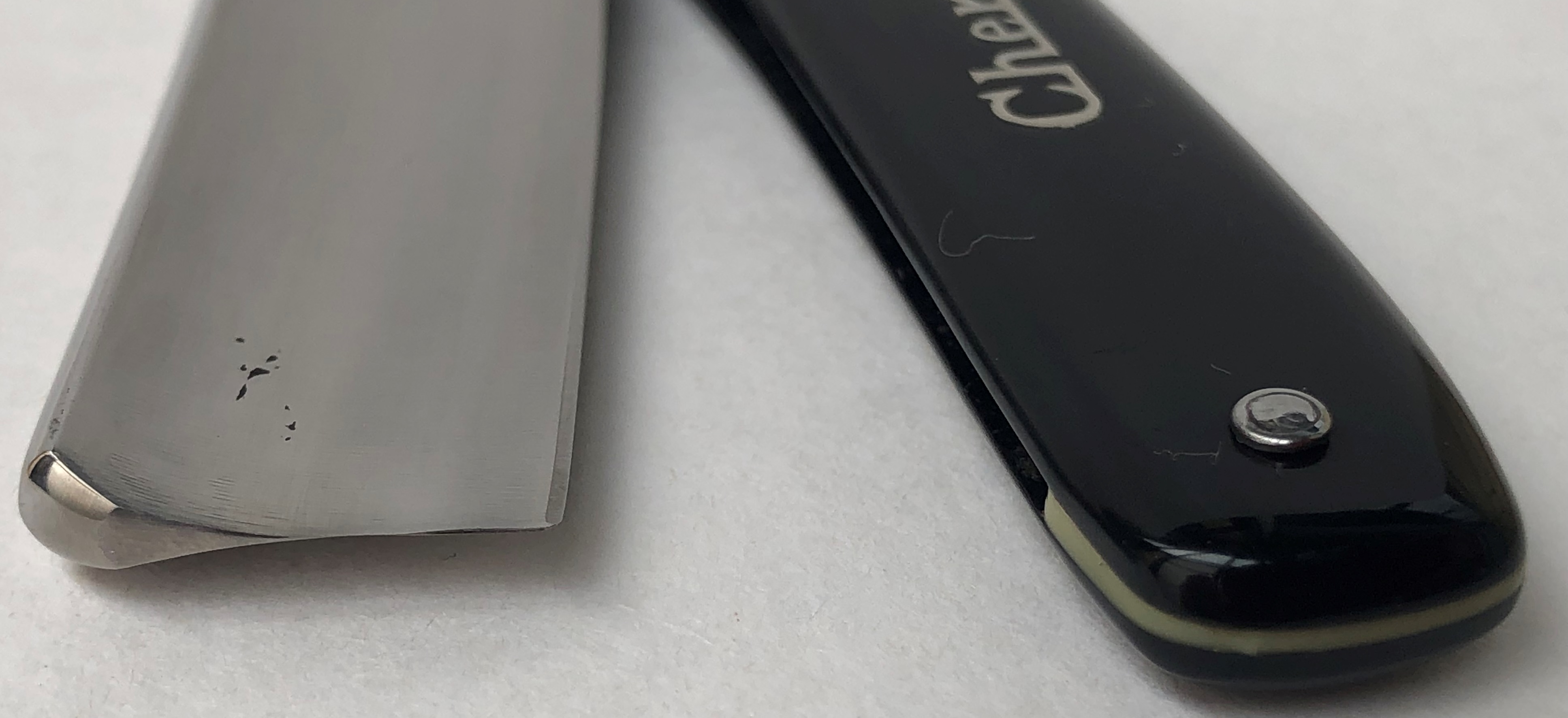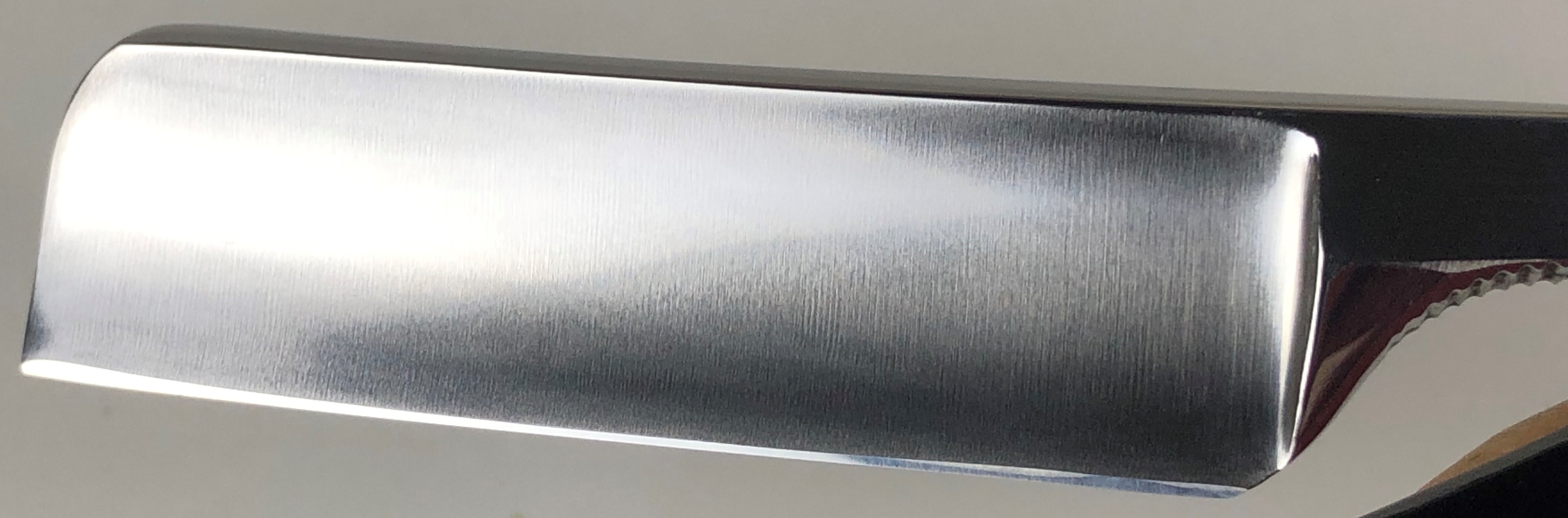 Бритва совершенно непользованная,была оттерта от остатков старого масла с консервации.Ничего не разбиралось и не ремонтировалось.Заводская шлифовка и полировка.Бритву до конца не точил, а только сформировал кромку, чтобы посмотреть геометрию клинка. С геометрий тут все нормально:кромочка равномерна по всей длине.Сталь чистая, без видимых дефектов.Бритва хоть и среднего размера, но за счет толстого обушка достаточно тяжёлая, что даёт возможность чувствовать ее в руке , контролировать процесс и не резаться часто. Особенно это важно для новичков. Сама форма лезвия и размер бритвы хорошо подходят именно для новичка и обучения бритию.Укороченное полотно прекрасно справляется с труднодоступными местами.Перед отправкой будет заточена и доведена до комфортного бритья.