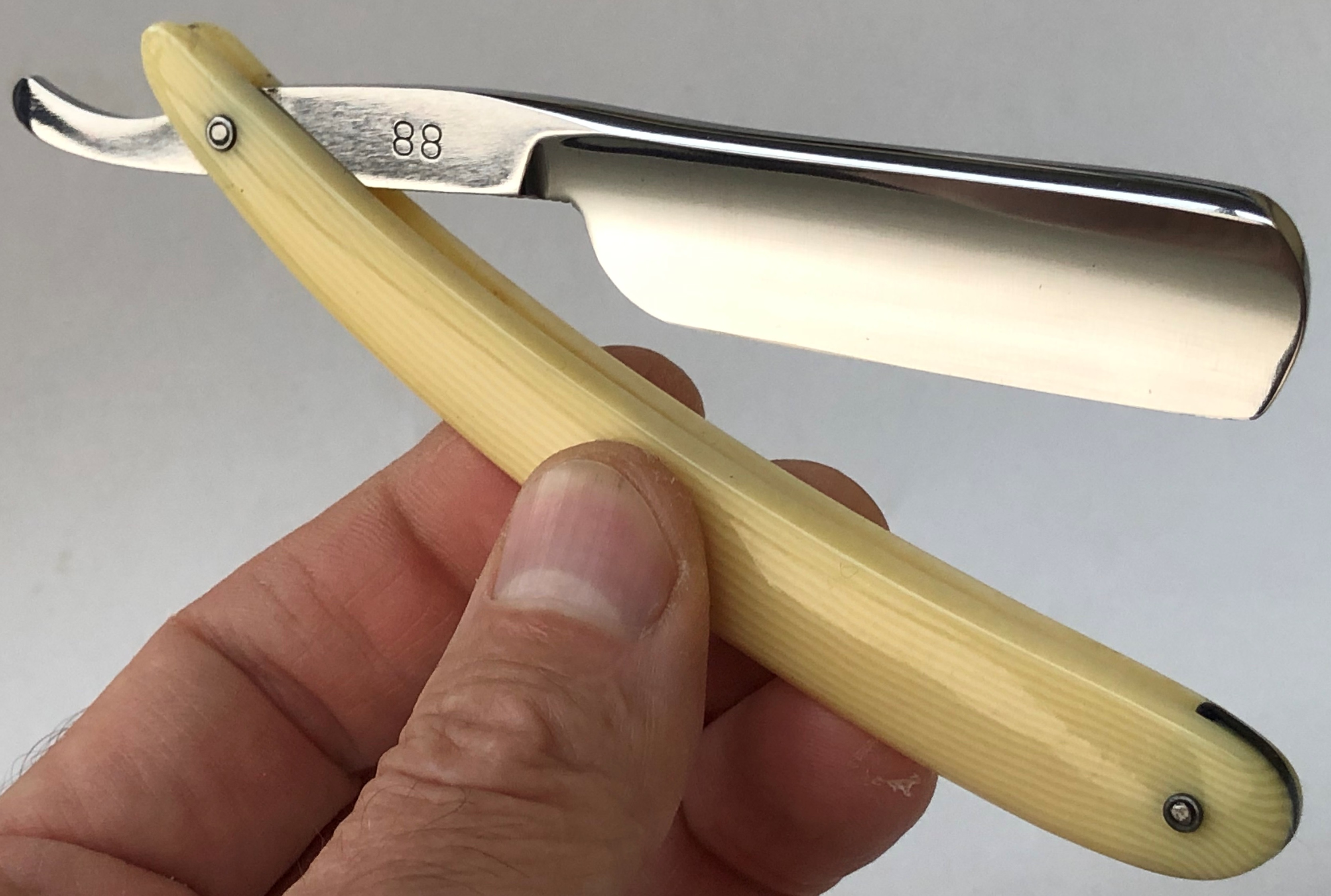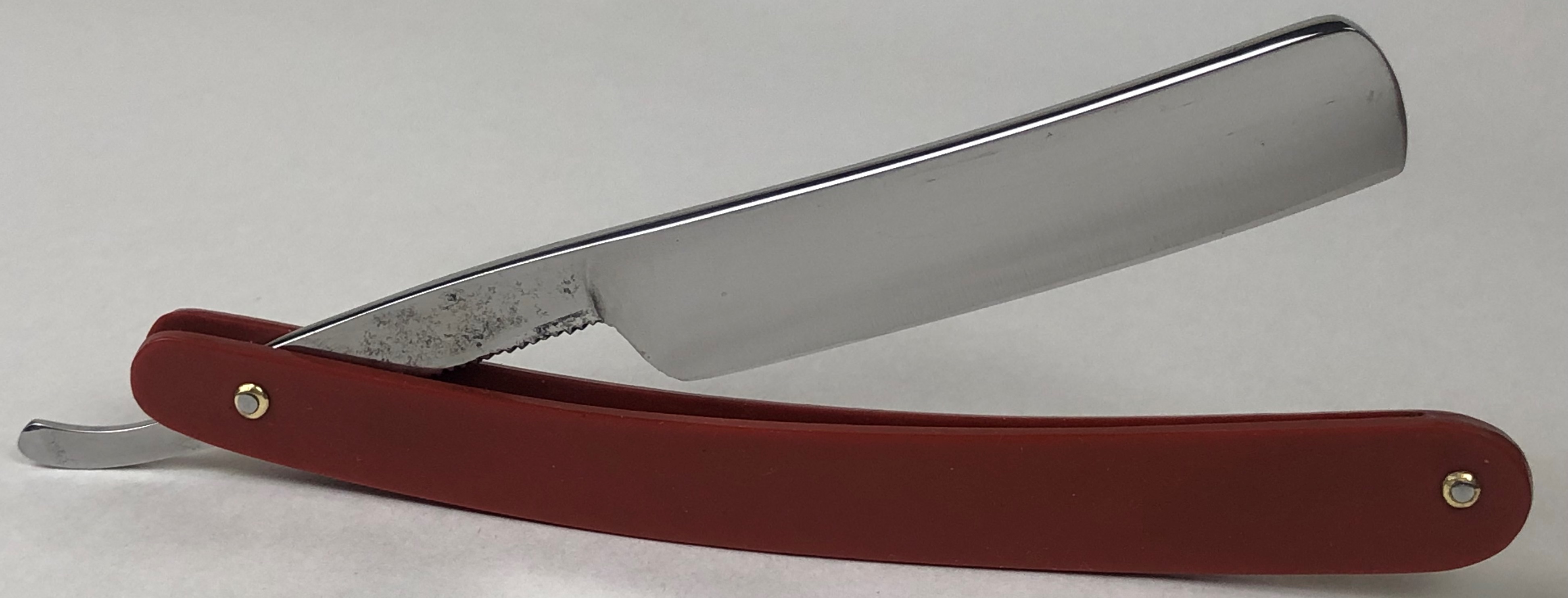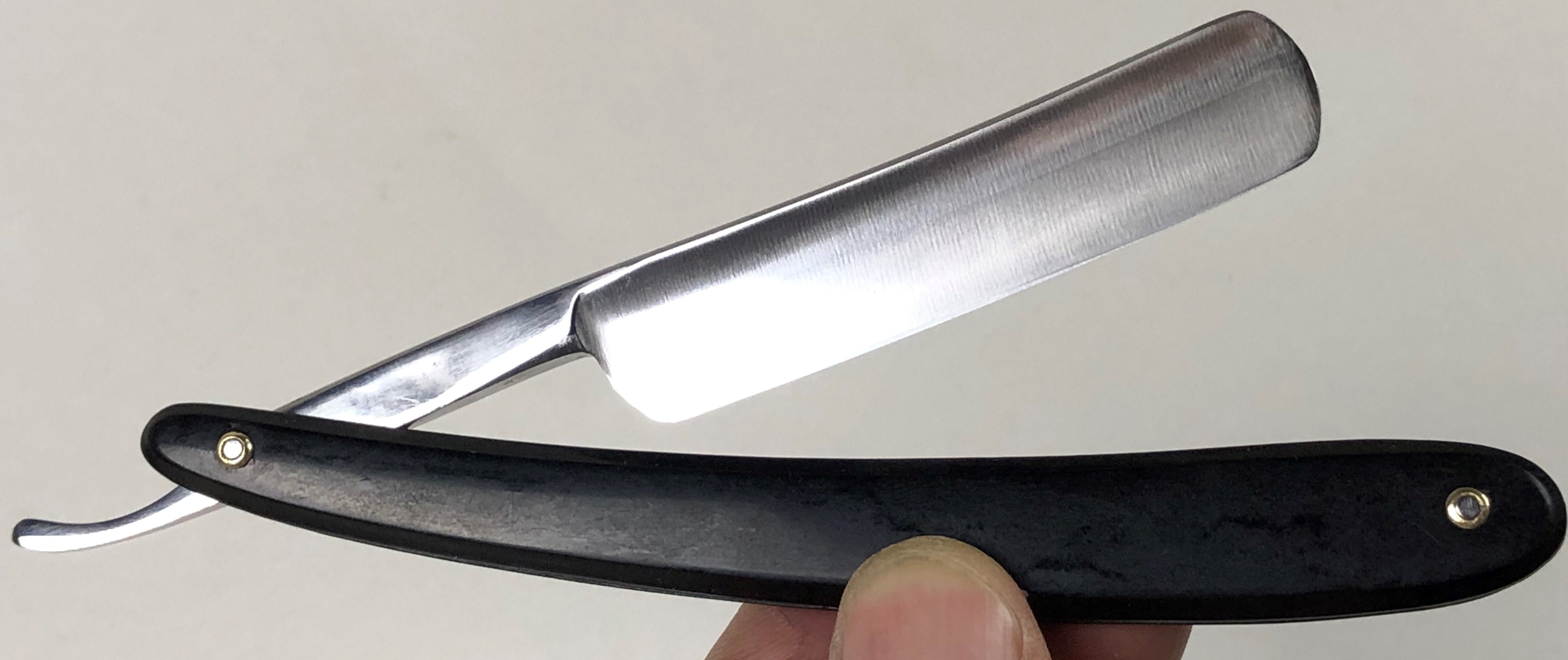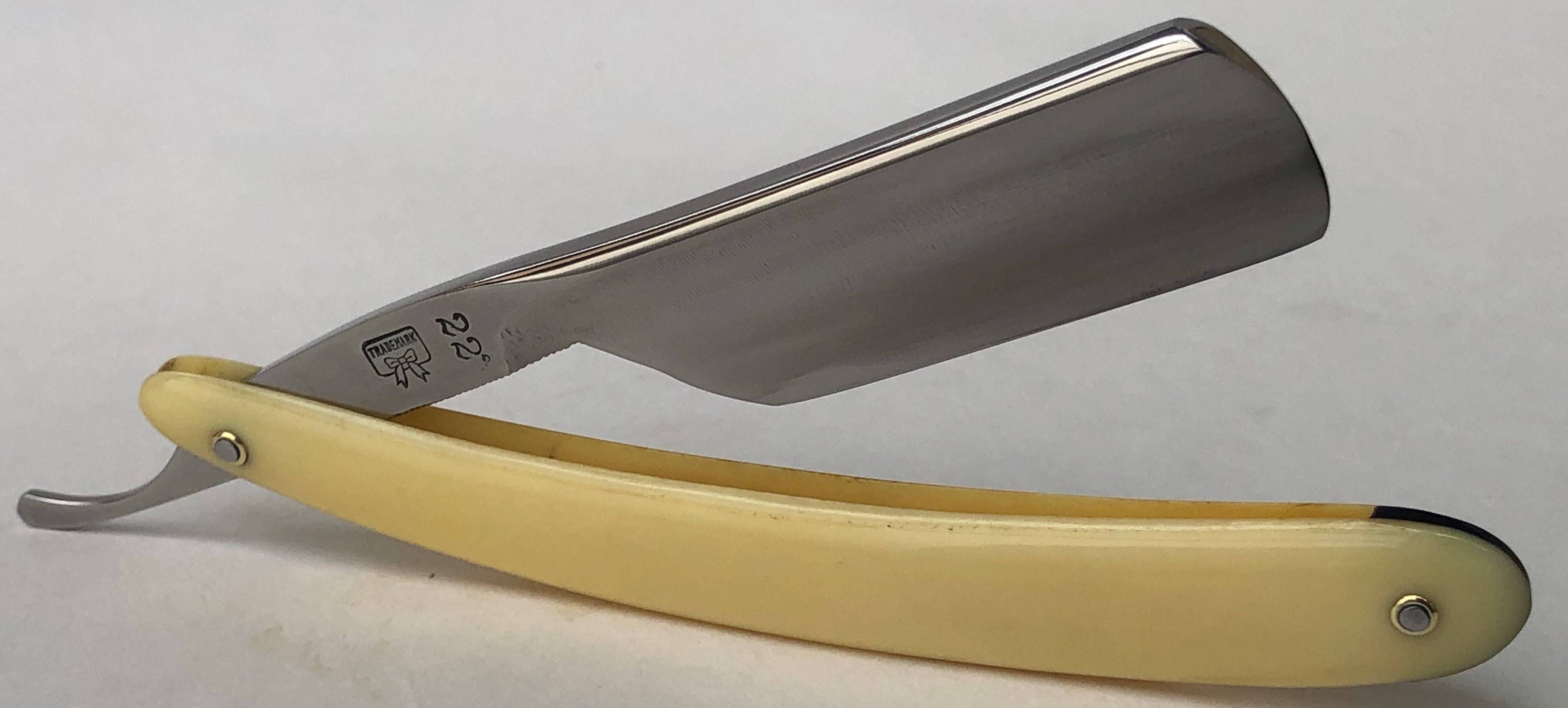 Бритва в очень хорошем состоянии, близком к идеальному.Без следов пользования.Была разобрана, немного освежено полотно и почищен район осевого пина и снова собрана, с заменой оригинальных пинов на немецкие двух-цветные втулки.Идеальная геометрия клинка:кромочка равномерна по всей длине.Сталь чистая , без дефектов. Бритва очень удобна для обучения не только как брить, но и как бриться.Укороченное полотно даёт возможность легко подобраться в самые труднодоступные места.Бритва заточена и готова к пользованию.