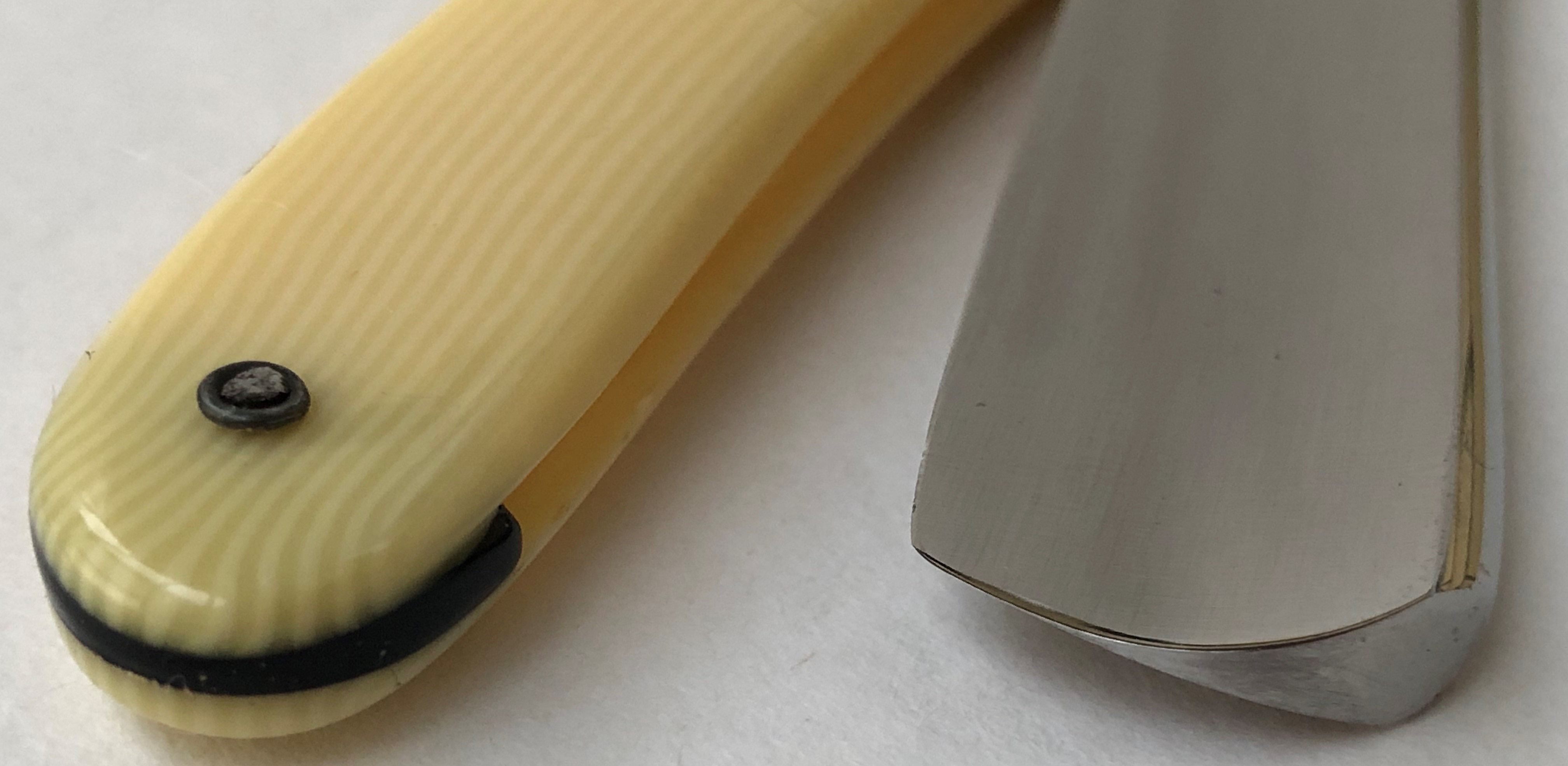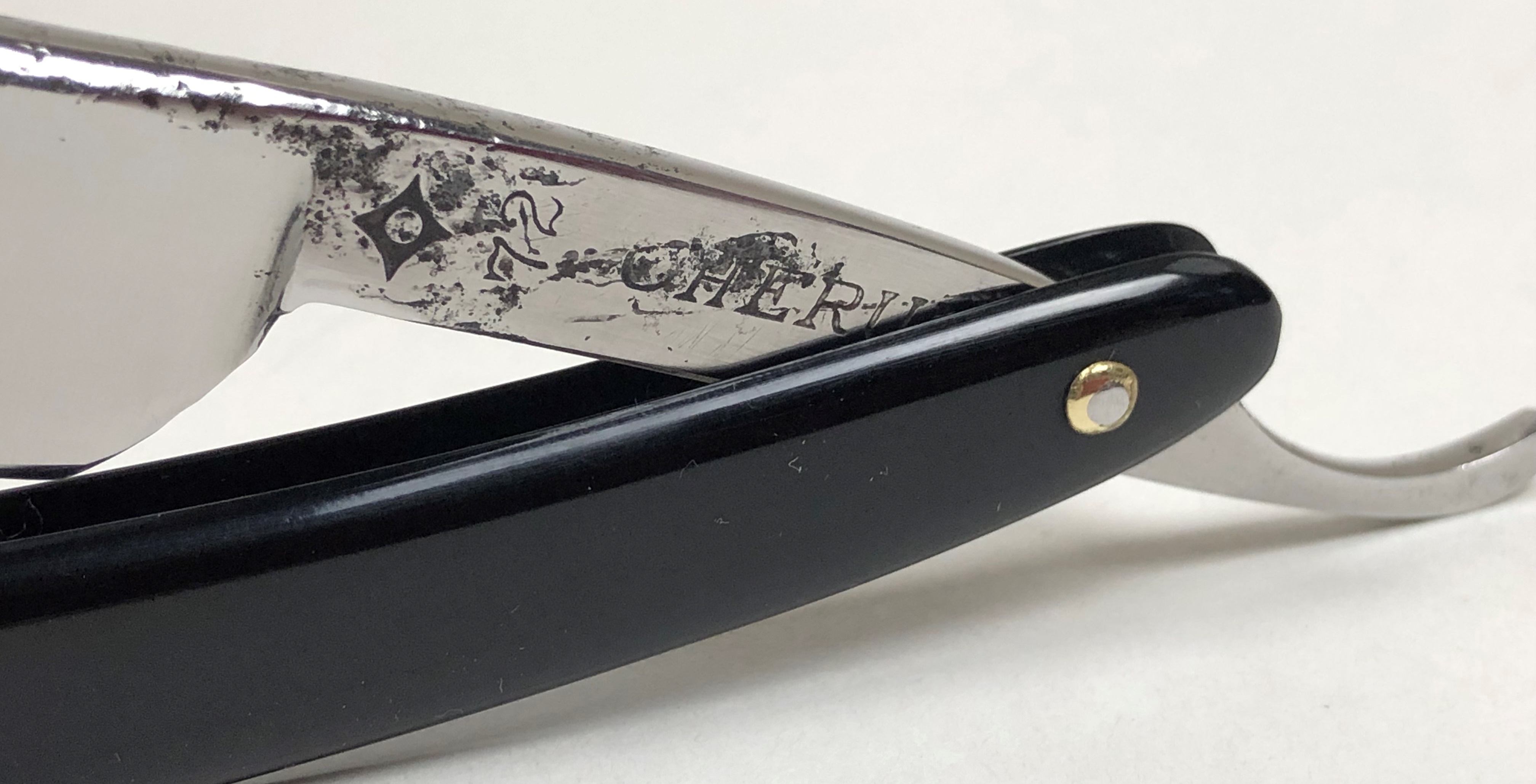 Бритва в прекрасном состоянии для своих лет.Следов от заточных камней на обушке не имеет, что может означать, что бритва или малопользованная, либо не была в употреблении вообще.Разобрал, чтобы немного освежить район осевого пина и сам клинок и снова собрал, с добавлением внутренних шайб и заменой пинов на двух-цветные втулки.Как обычно в таких случаях, стараюсь оставить шикарную патину на эрле, идущую на контрасте с чистым полотном.