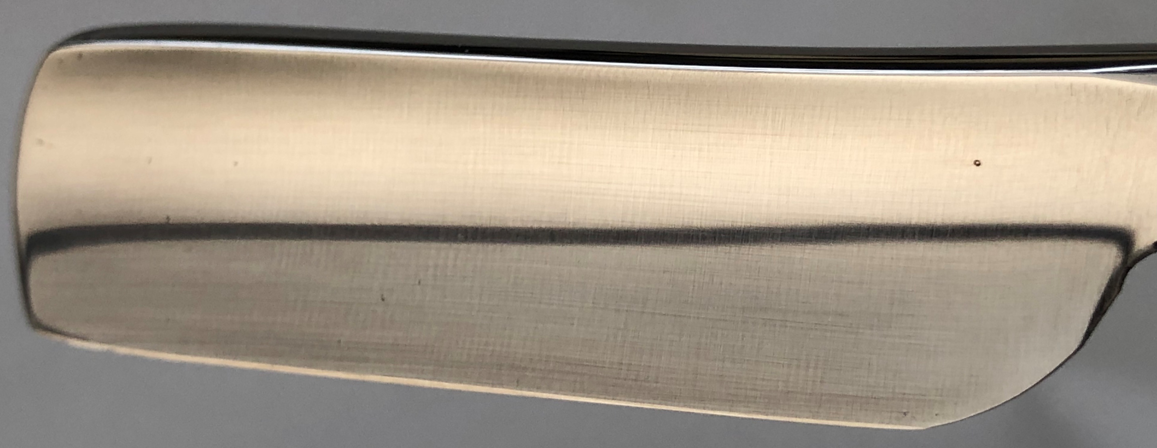 Бритва с минимальными следами пользования.По всей видимости была заточена однажды, а потом просто доводилась на финишниках.Сторона "ура" имеет прекрасную многолетнюю патину.Сторона "омоте" оригинальный грубый гринд.Идеальная геометрия изготовления. Кромочка на "ура" равномерная и еле заметна.На "омоте" шире, но также равномерна по всей длине.Сама сталь Тамахагане каким то магическим образом привлекает всех любителей японской Бритвы и заставляет искать по всему миру то, что сейчас еще где то осталось от этой самой известной семьи.С бритвой ничего не делал, а только тряпочкой протер, как бы это смешно не звучало для многих посвящённых товарищей..