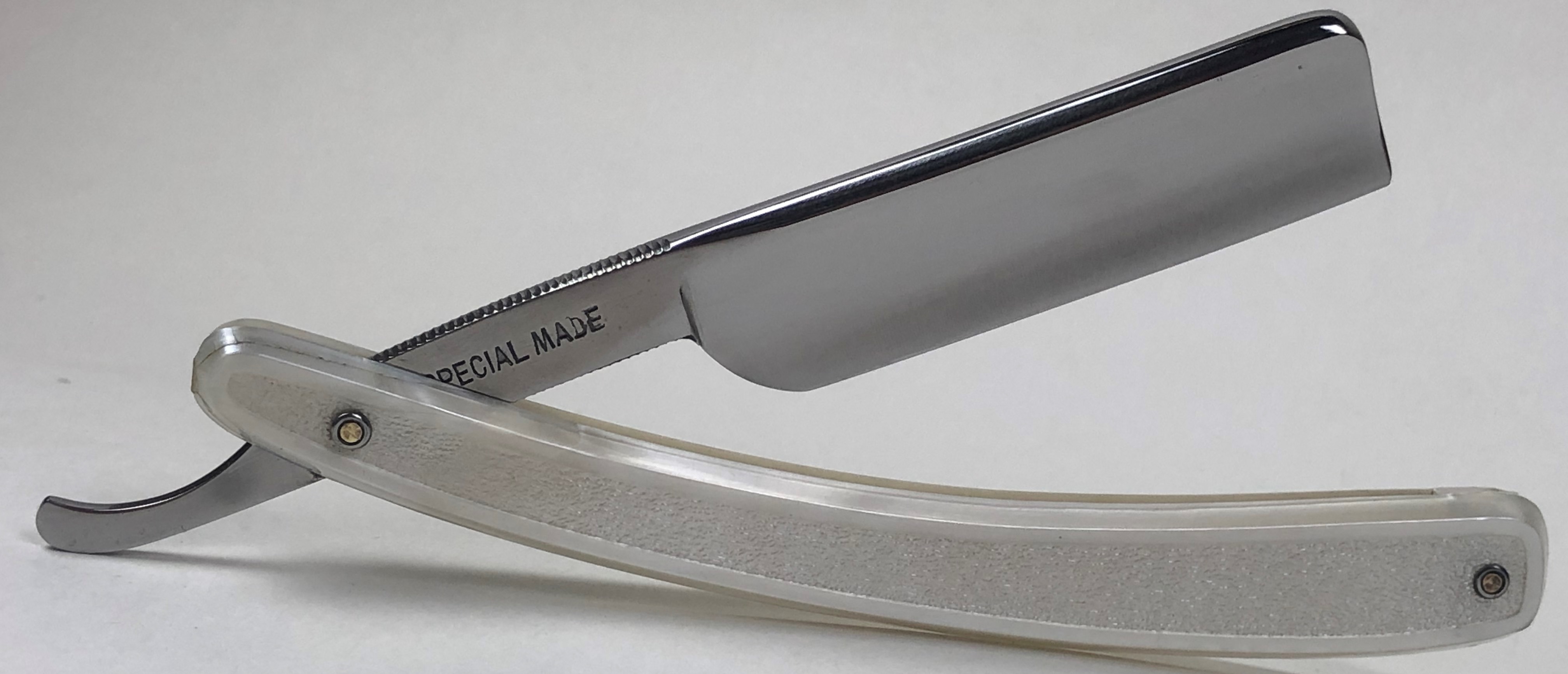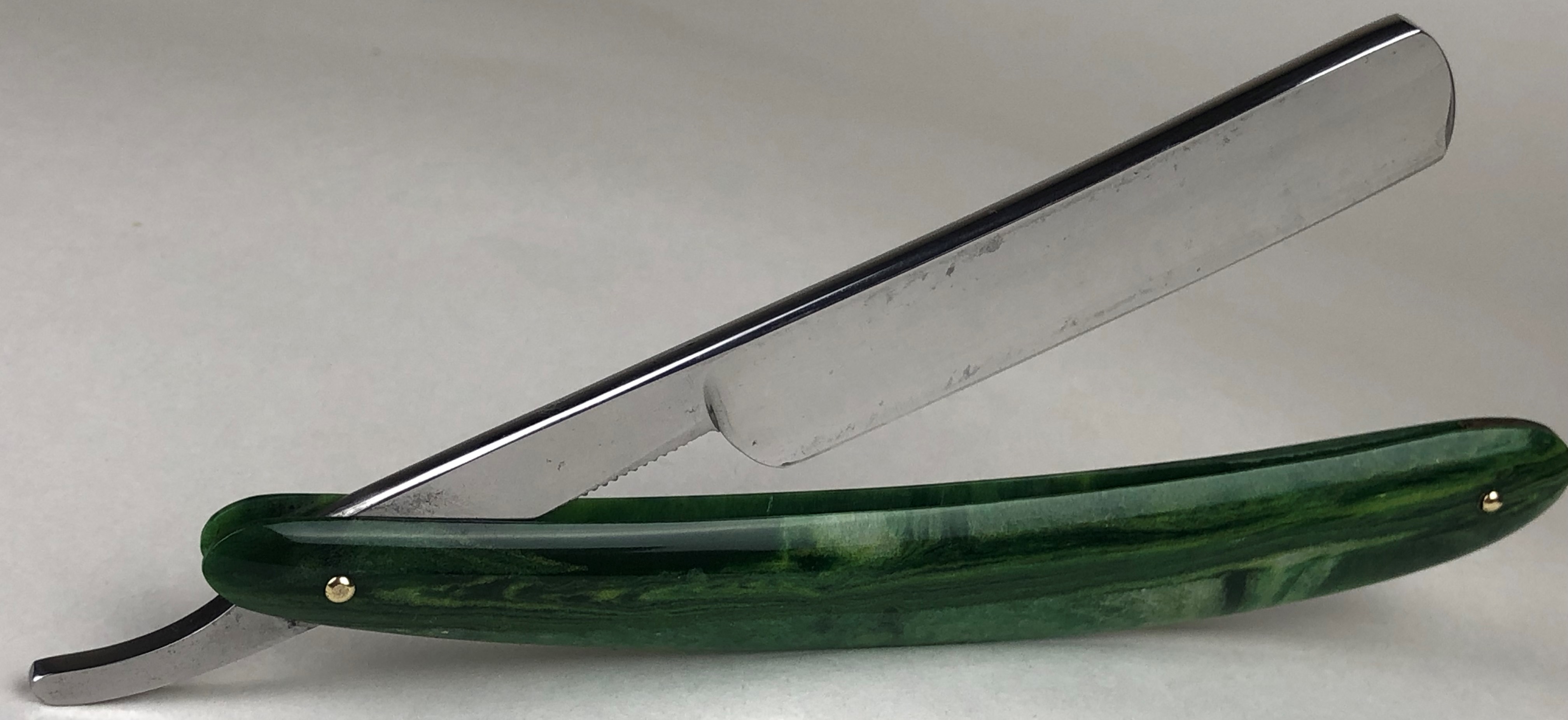 Бритва буз следов пользования.Не разбиралась и не ремонтировалась.Все в оригинале. Идеальная геометрия клинка:кромочка равномерна по всей длине и еле заметна.Исходя из своей формы лезвия , в виде укороченного клинка и толстого обушка, можно предположить, что бритва создана для парикмахерского применения.Красивая, эффектная вещь. Не пропустите! Заточена и готова к бритью.