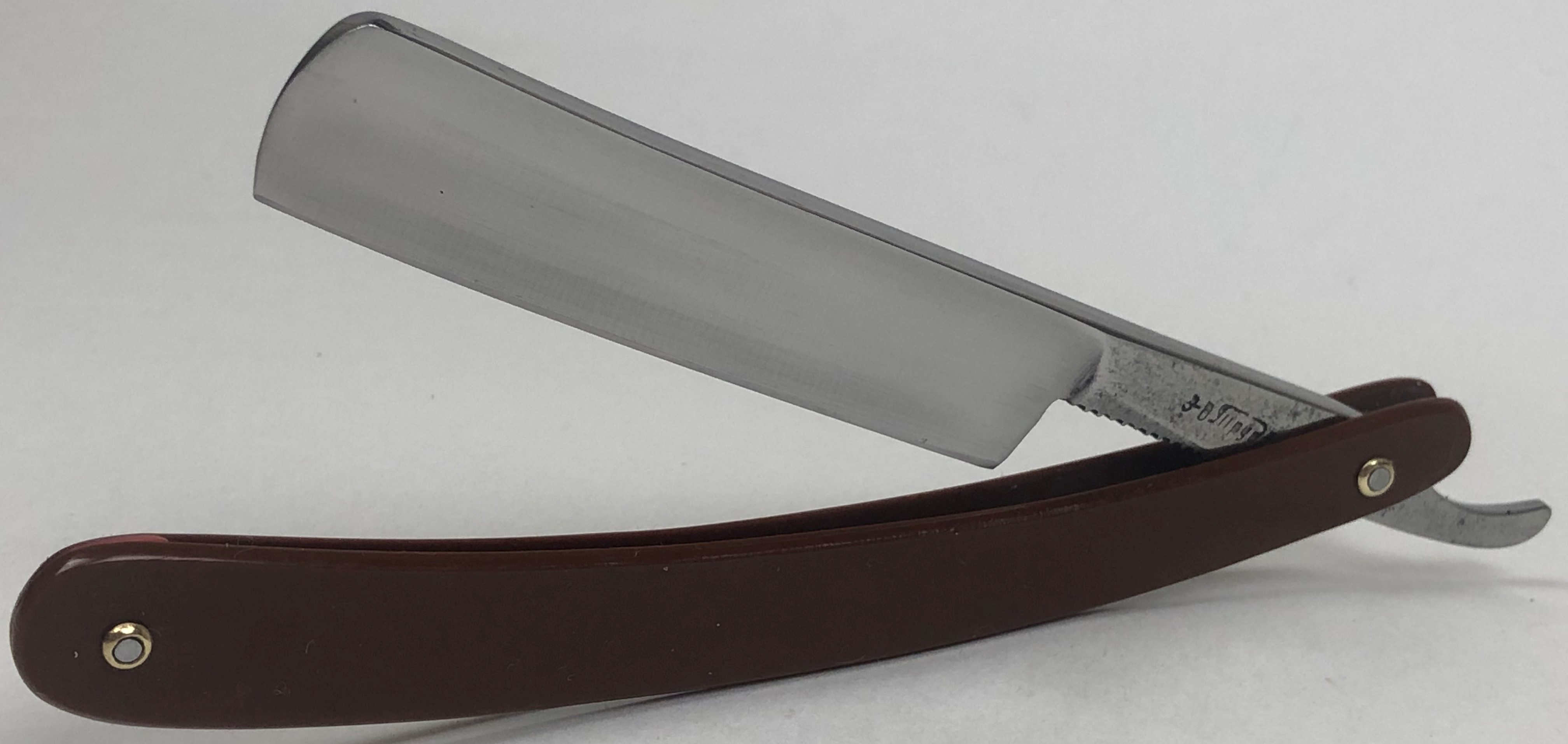 Бритва в очень хорошем состоянии. Немного откорректировал утОчку обушка и умеренно отполировал клинок.Поменял пины на двух-цветные втулки и добавил внутренние шайбы.Идеальная геометрия:кромка ровненькая по всей длине полотна.Тяжёлая.Заточена и готова к бритью.