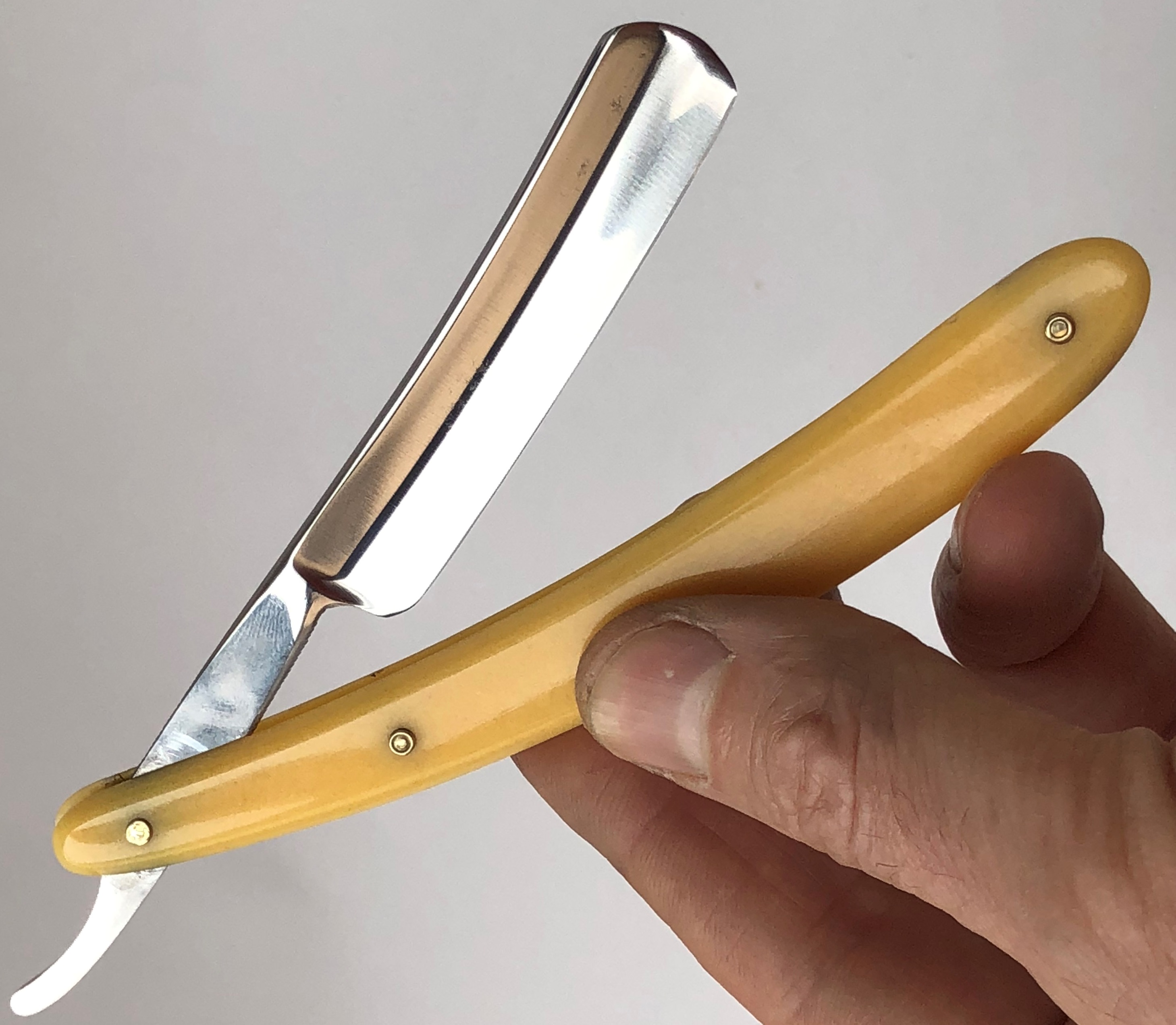 Бритва в пользовании не была.Но пришлось разобрать,чтобы почистить в районе осевого пина. Заодно самую малость освежил само полотно от патины и попробовал повторить "заводской" гринд.Дополнительно поставил внутренние шайбы и поменял оригинальные заклепки на двух-цветные пины.Бритва с виду имеет состояние новой. Идеальная геометрия полотна:кромочка равномерна по всей длине.Качественная сталь способна выдавать чистое и мягкое бритье. Также отличный вариант для новичка. Заточена и готова к бритью.