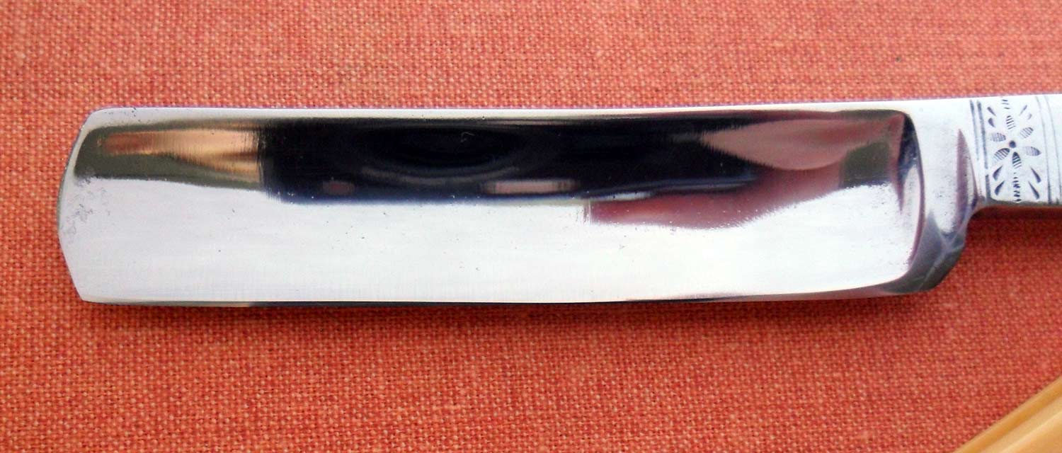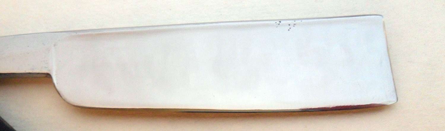 Сведения о производителе: http://britva.ru/forum/viewtopic.php?f=28&t=1149" onclick="window.open(this.href);return false; Судя по форме клинка и шрифту надписи предполагаю конец XIX века, менее вероятно начало XX века. Ручка - материал, предшественник современной микарты - пресованный картон с клеем. Ручка явно фабричная, родная или нет- под вопросом. Клинышек из металла. Геометрия quarter hollow, отлично точится. Очень мягко снимает щетину, хотя требует немного большего навыка в сравнении с обычными холлоу граундами. Естесственно, заточена и полностью готова к бритью. Ширина бритвы 19 мм, толщина обуха 4,5 мм.