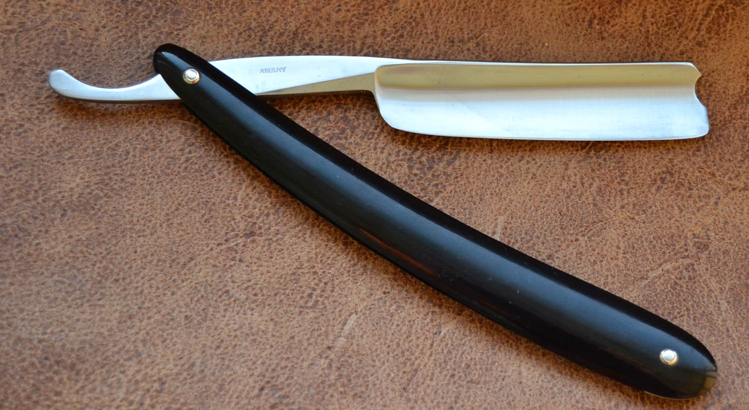 Немецкая бритва в хорошем сохране, сталь во время заточки очень порадовала, как и геометрия. Вогнутость полная. Ширина 5/8 Рукоять из эбонита, шайбы родные. Заточена, готова к бритью. Подарена другу на свадьбу Spoiler Show