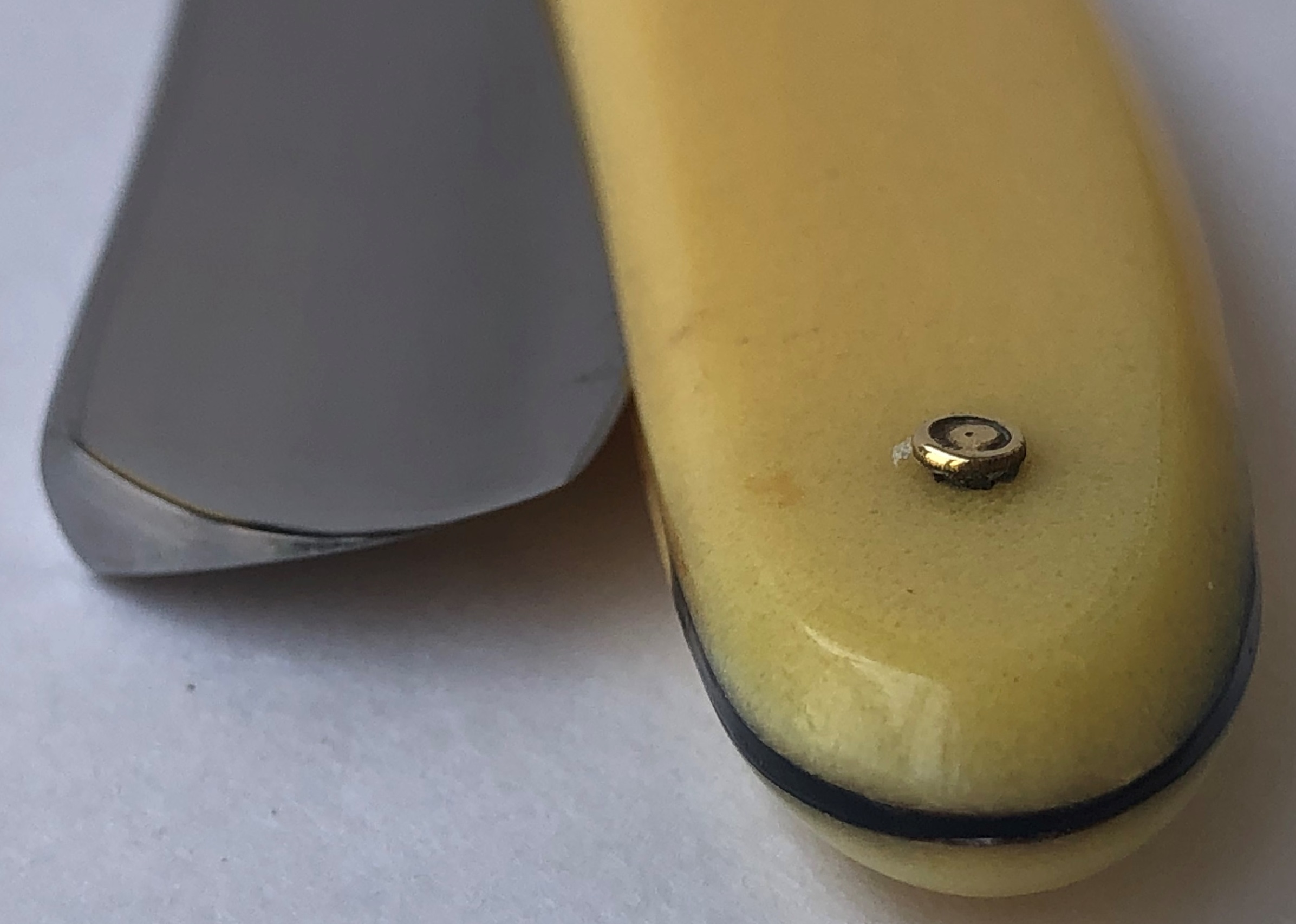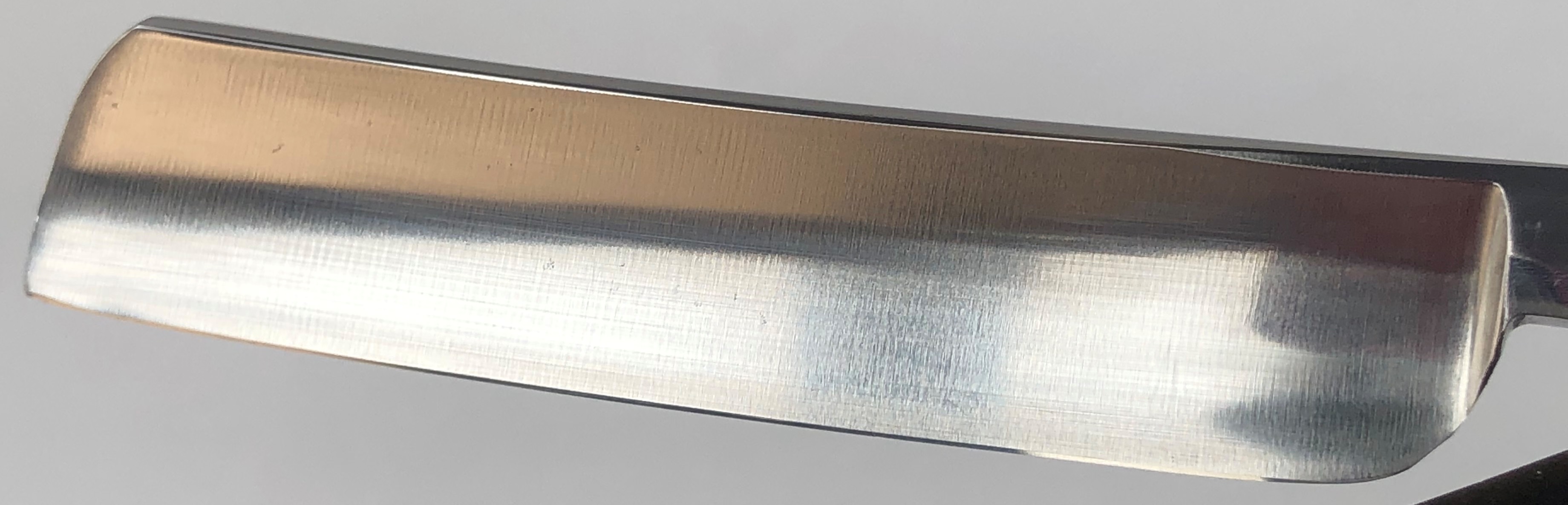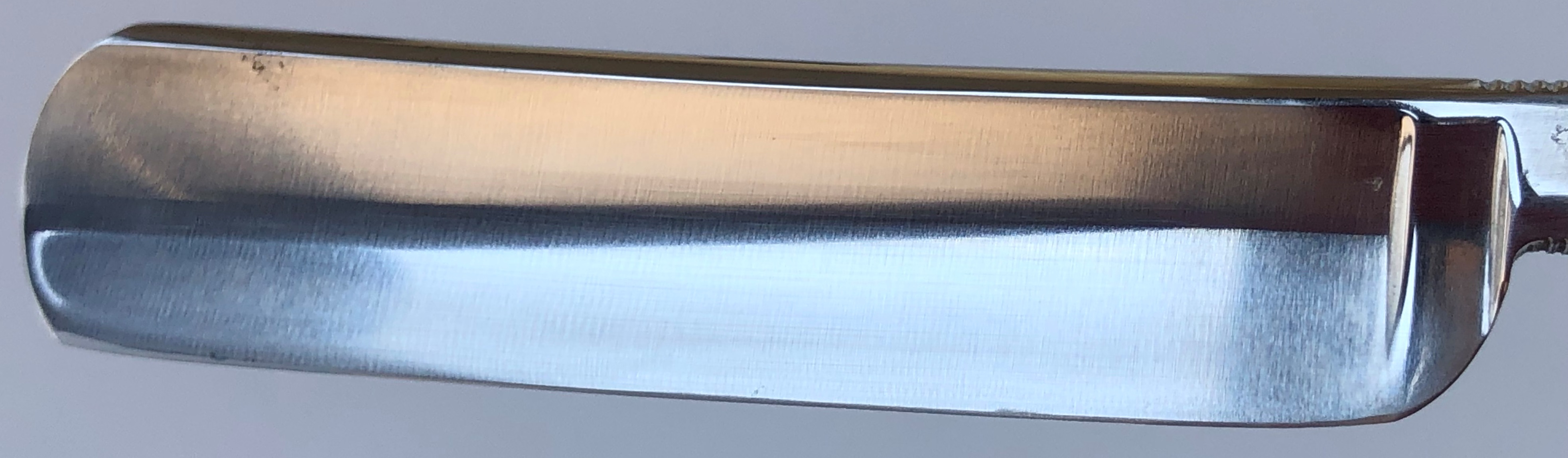Клинок не ремонтировался.Оригинальная шлифовка и полировка.Ничего тут не делалось. Бритву разобрал для заметны пинов, так как родной осевой был неудачно поставлен, в связи с чем клинок закрывался криво.Еле заметные элементы патины не стал убирать, чтобы сохранить заводскую оригинальность клинка.Видимых дефектов не обнаружено.Бритва хоть и среднего размера, но достаточно тяжёлая, из за своей формы лезвия.Идеальная геометрия полотна:кромочка равномерна по всей длине и еле заметна.Заточена и готова к бритью.