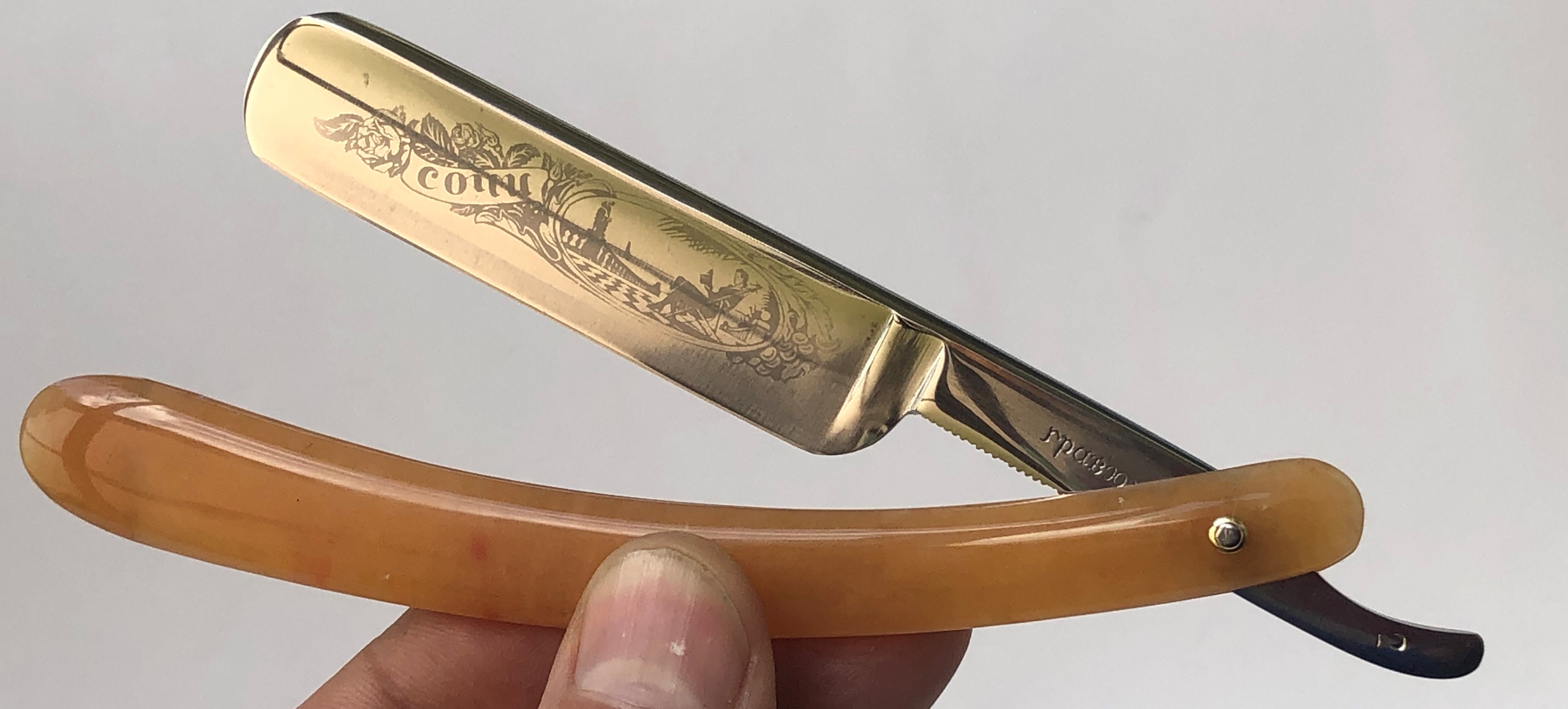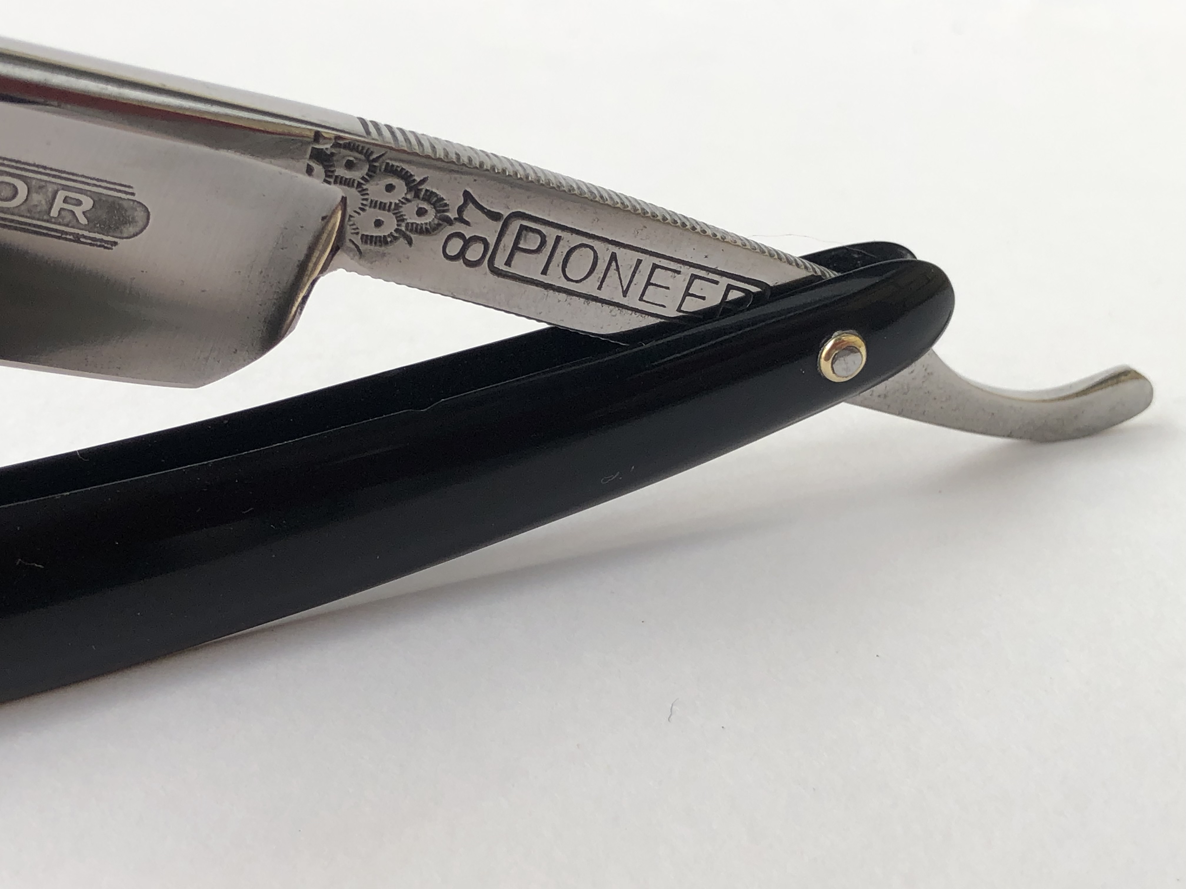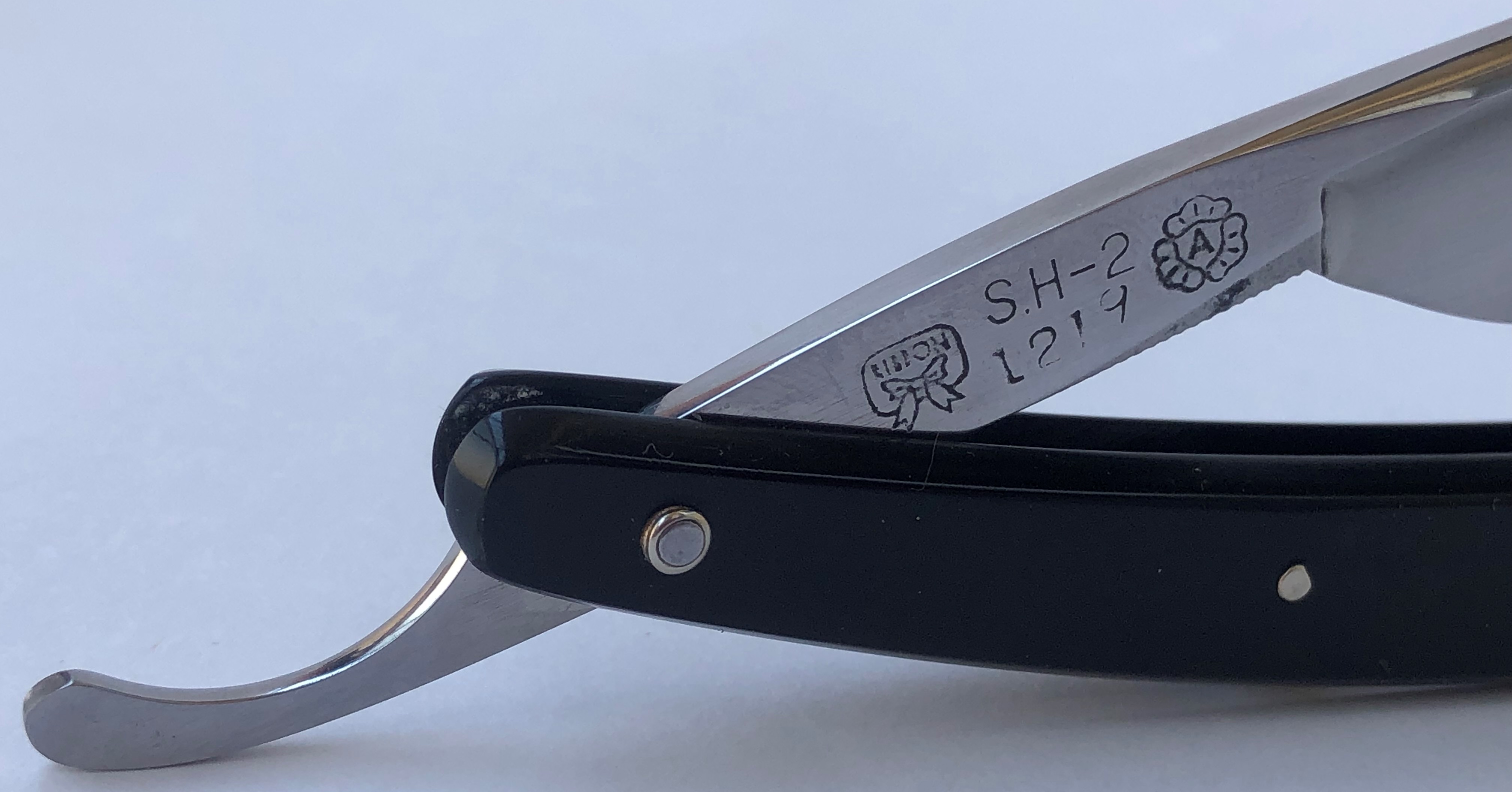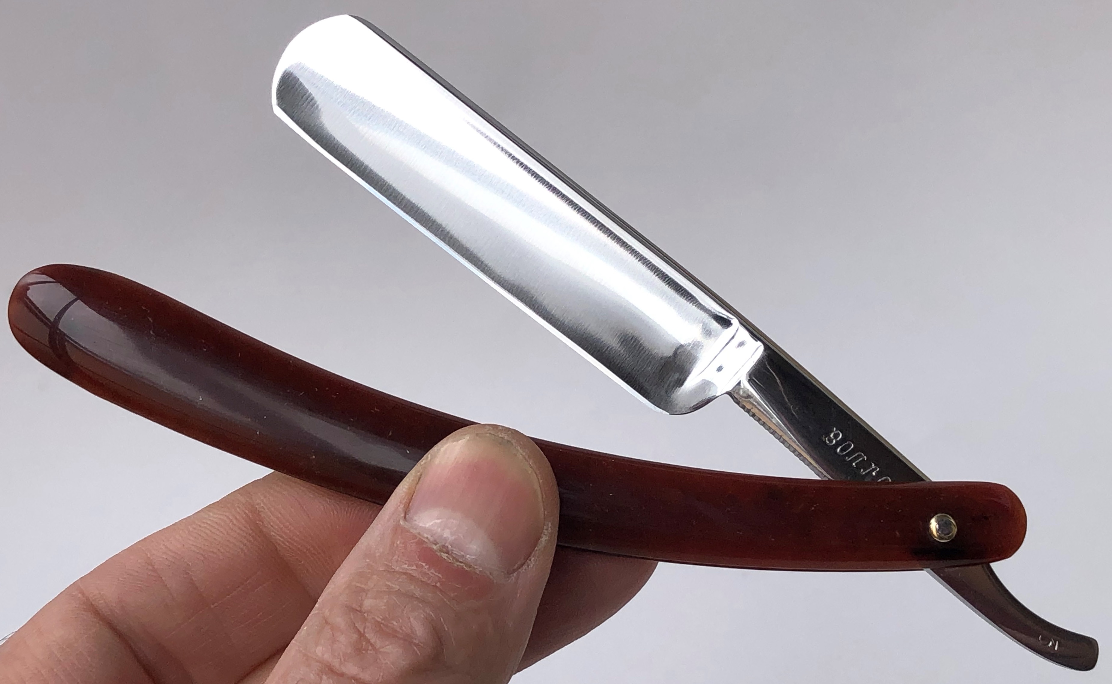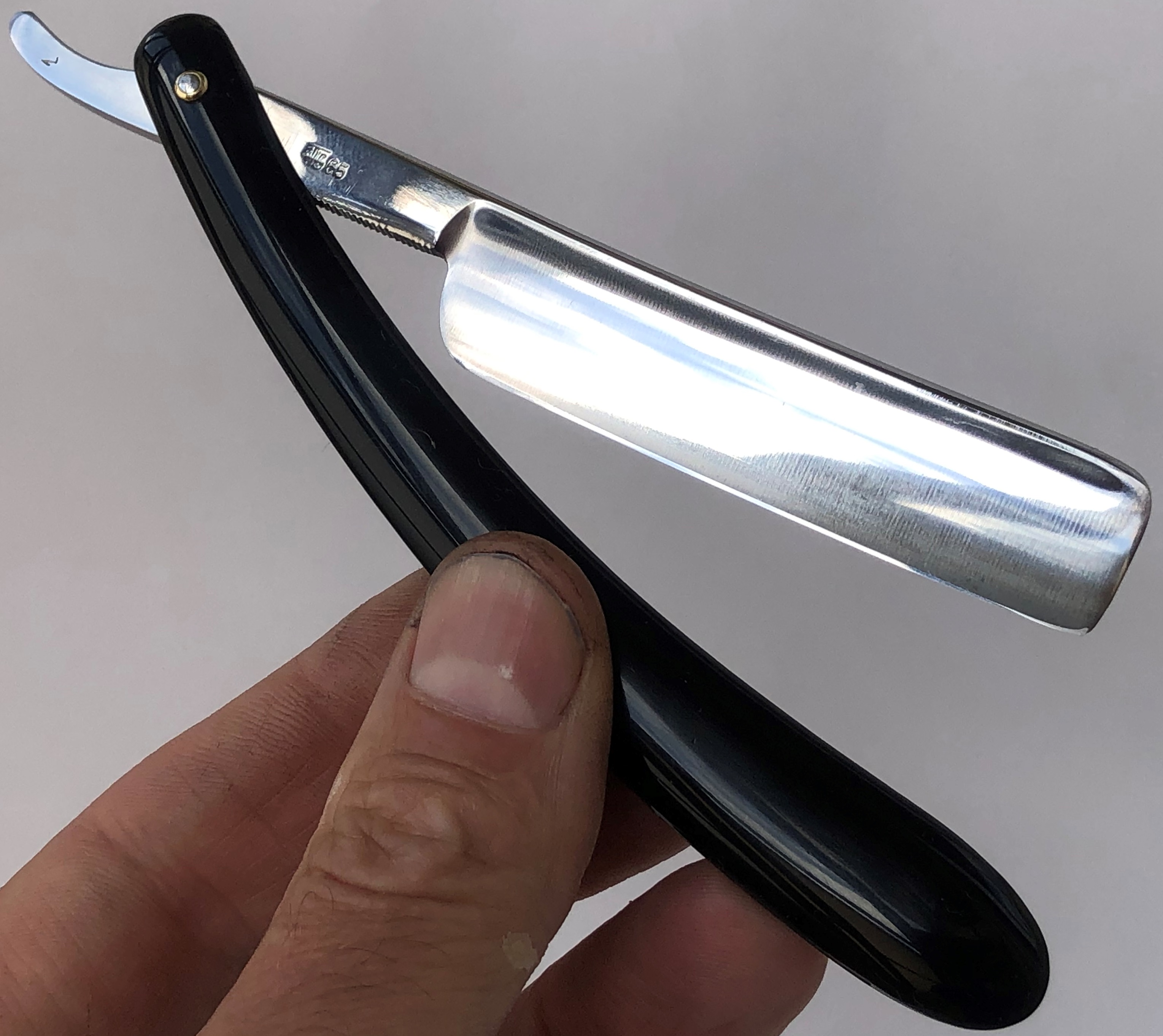 Клинок привел в порядок, убрал небольшую утОчку обушка, перешлифовал и умеренно отполировал."Cледы времени" в районе осевого пина оставил, для придания старинному клинку естественного вида.Родную ручку заменил на другую, пластиковую.Внутренние шайбы и новые втулки поставил.Кромочка ровненькая по всей длине.Парикмахерская метка. На мой взгляд, очень неплохая и недорогая бритва из прошлого.