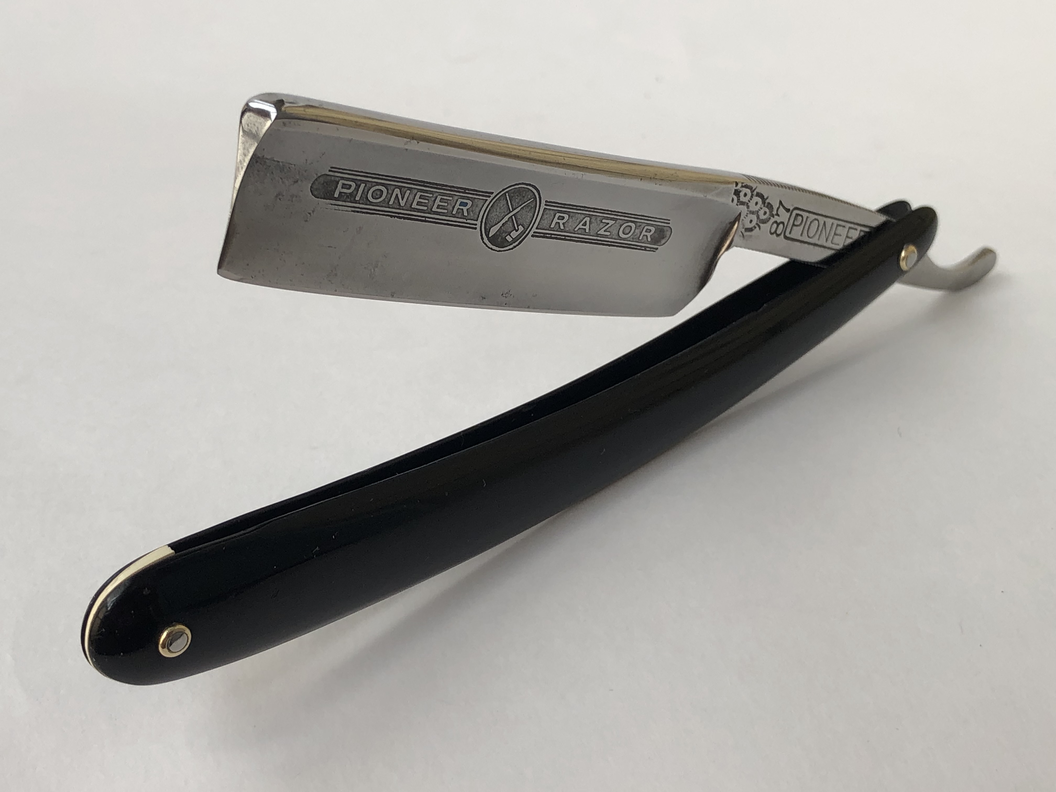 Бритва без следов пользования и по всей видимости в работе еще не была.Разобрал, для удаления незначительных "следов времени" и заново собрал, сохранив родные пины , а также добавив внутренние шайбы, для порядка.Бритва в идеальном состоянии, практически как вчера с завода. Кромочка тоненькая.Эффектные и удобные пластиковые накладки на эрле, дают возможность не так ответственно следить за районом осевого пина после бритья и не пропустить образование ржавчины в этом месте. Эта модель немного легче своих "цельнометаллических" собратьев такого же размера, но ко всему можно привыкнуть, так что для кого то это станет преимуществом и бОльшим удобством, чем пользование обычной бритвой.А избыточно толстый обушок даёт возможность не выставлять угол атаки при бритье, а класть бритву плашмя на лицо и таким образом бриться с самым минимальным углом.Бритва заточена и лично протестирована. Напомнила мне английские бритвы с полной вогнутостью, начала 20-го века. Такая же комфортная сталь, средней твердости, с характерным "шелестом" сбриваемой щетины. После бритья кромочка прекрасно проходила тест на рез волоса на весу,без правки на ремне.