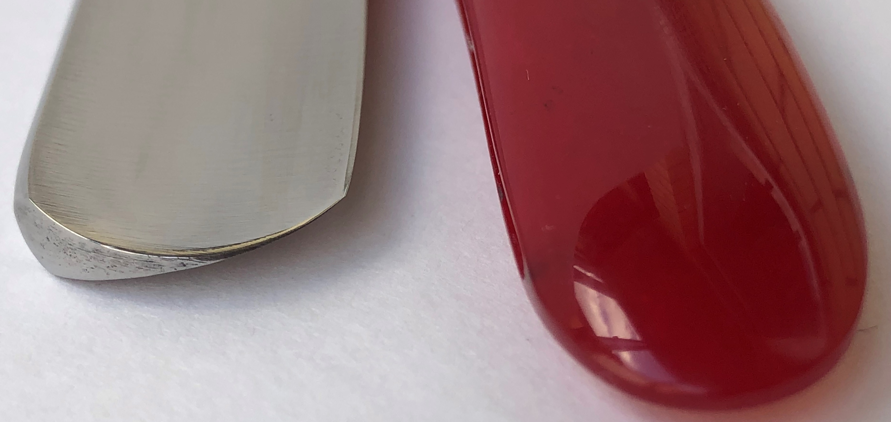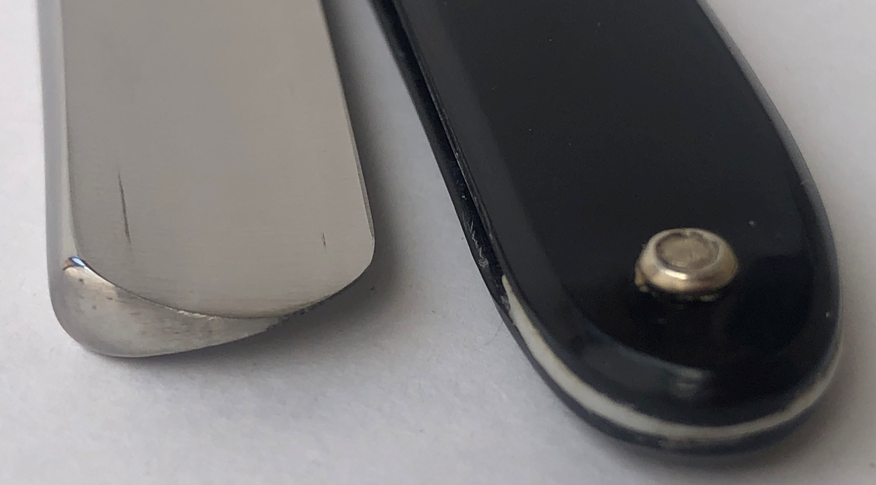 Клинок идеальный и ни разу не точился. Имеет оригинальную шлифовку и полировку полотна. Разобрал, чтобы установить внутренние шайбы и убрать радиальные царапины на эрле.Оригинальный пин установил обратно, так что сложно сейчас заметить.Можно сказать, что бритва как вчера с завода.Идеальная геометрия полотна:кромочка равномерна по всей длине.Родная коробочка того же 1958 года в комплекте!