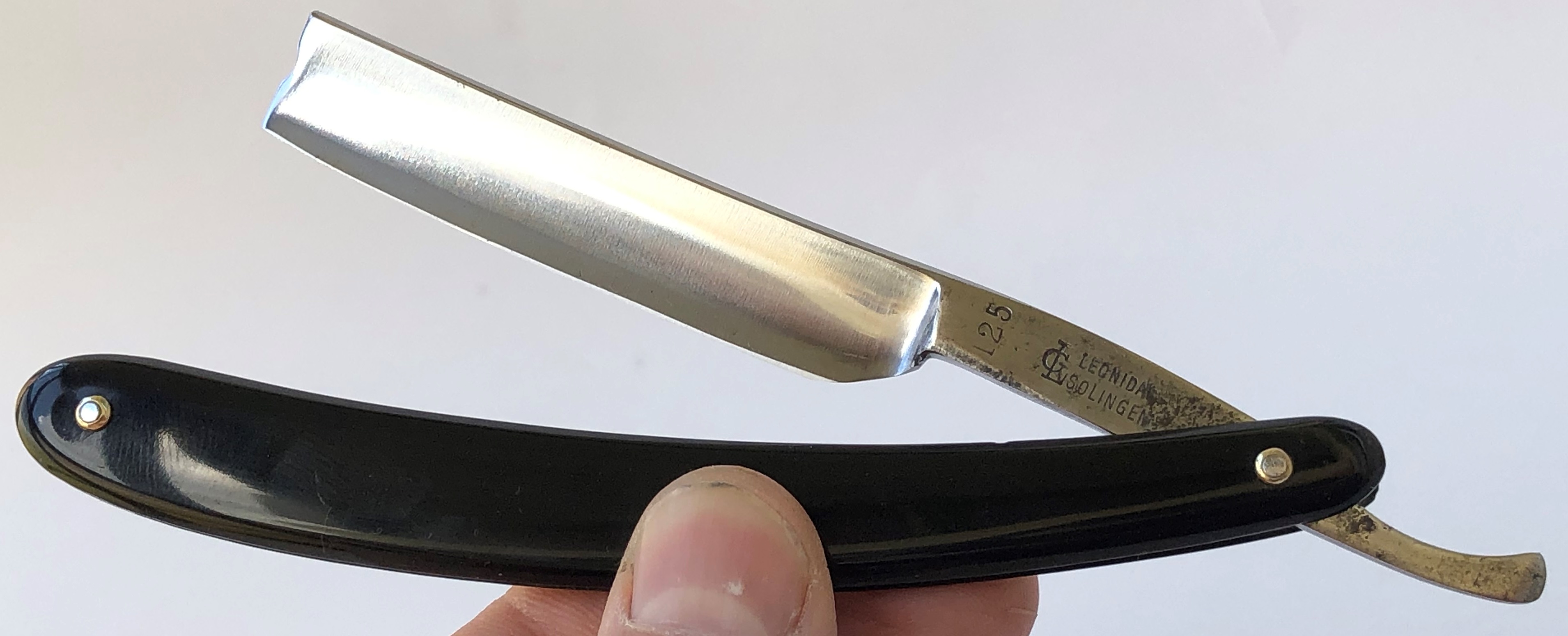 Привел в порядок старушку, так что послужит еще не один год.Немного откорректировал утОчку обушка, перешлифовал и умеренно отполировал.Пяточка совсем чуть задрана, на 0.5 мм, но не стал ничего больше исправлять, дабы сохранить драгоценный металл. Сталь чистая от разного рода видимых дефектов. Взамен сломанной оправы поставил ручку от другого древнего немца, сохранив также старинные пины.В общем и целом вполне живая и приятная бритва, с отличной , проверенной временем сталью. С учетом всего, бритва продаётся с 70-ти процентной скидкой от эталона.Не пропустите совершенно недорогой и легендарный экземпляр.