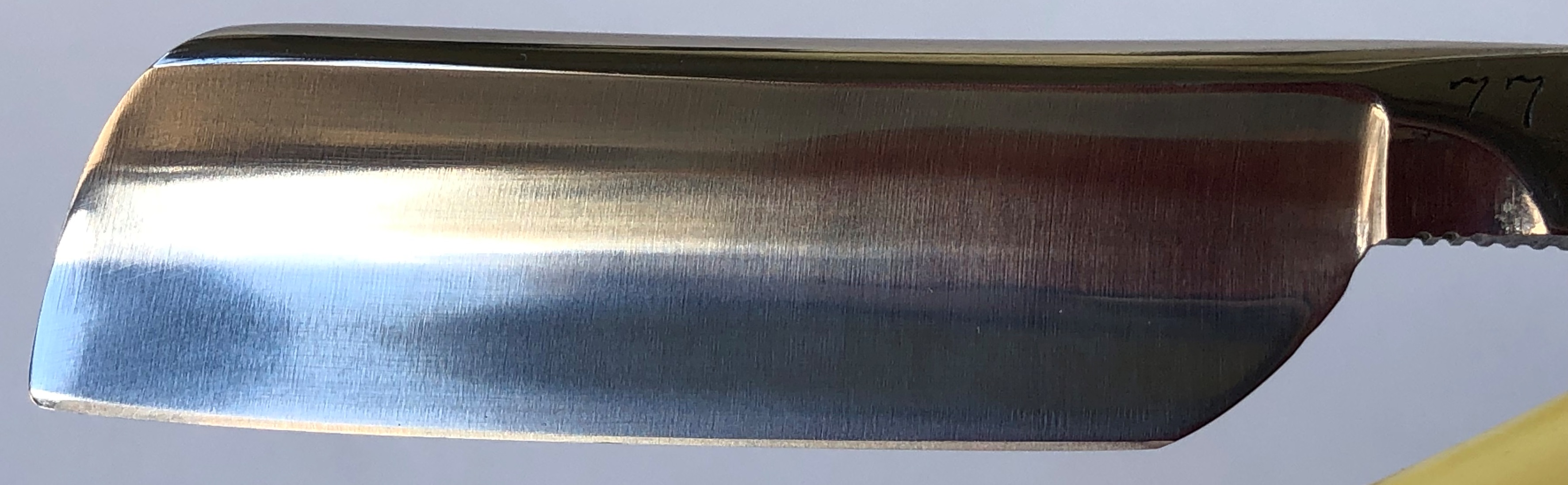 Внимание!Полотно имеет дефект. На удалении 8 мм от пятки имеется неглубокая микро-трещинка.Почти не видно на фото и на яву. При бритье не должна никоим образом беспокоить, так как эта часть полона практически не участвует в процессе.Трещинка "не гуляет" ,а сам клинок в районе кромки имеет достаточную жесткость. Поэтому принял решение подготовить бритву для использования. Бритва перед отправкой будет заточена и подготовлена в бритью.