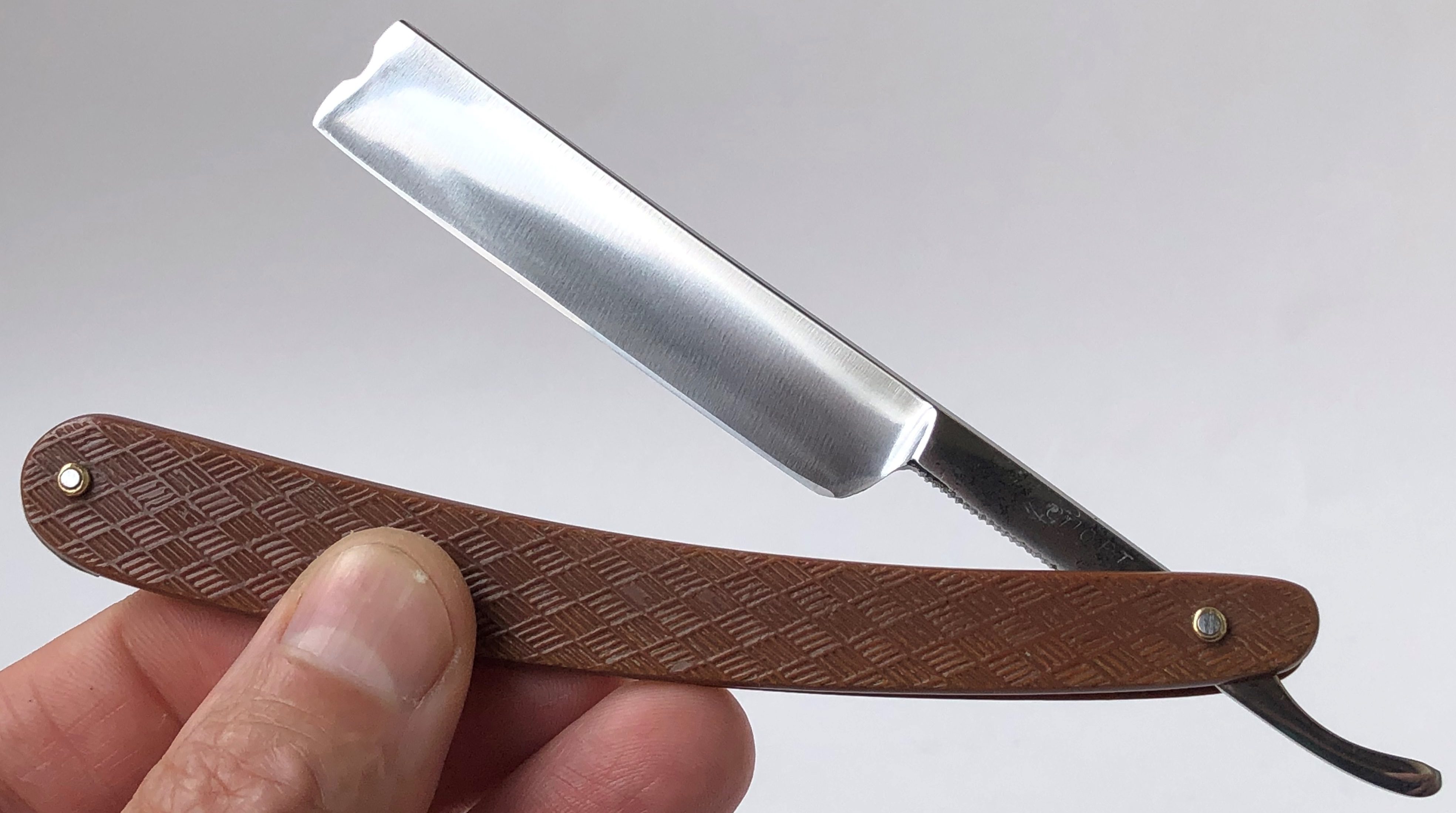 Бритва сохранилась очень хорошо. Немного откорректировал утОчку обушка, заново перешлифовал и умеренно отполировал.Рытвинки в районе осевого пина оставил, чтобы не убирать лишнего, да это собственно и не нужно.На сколько известно, данная модель бритвы комплектовалась рифлёной оправой из прессованного картона. Не стал переустанавливать родную оправу, а поменял ее на примерно такую же(и того же периода производства), только пластиковую , от Труд Вача.Новые пины и внутренние шайбы, для надежности. Очень приятная, не часто встречающаяся, элегантная бритва.Заточена и готова к бритью.