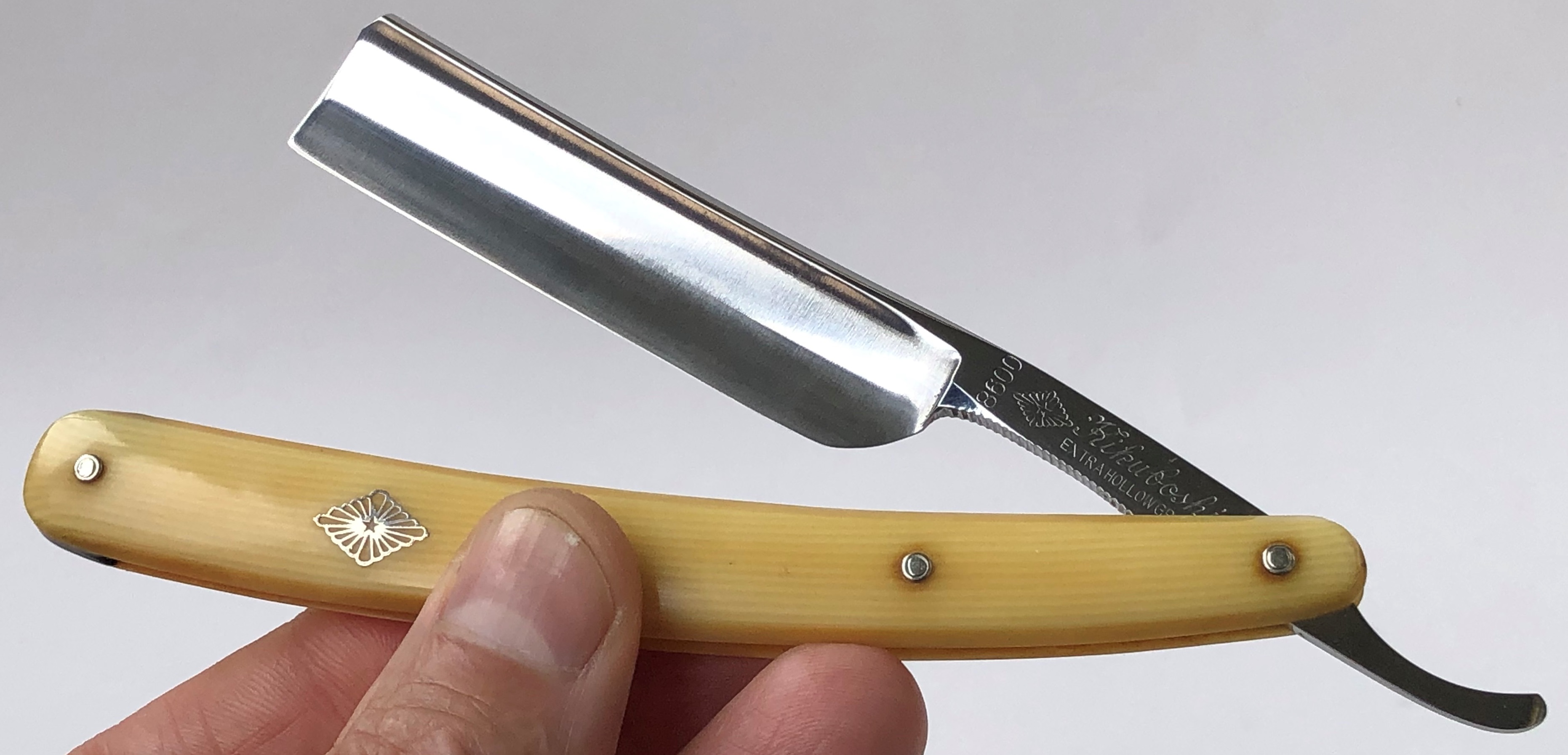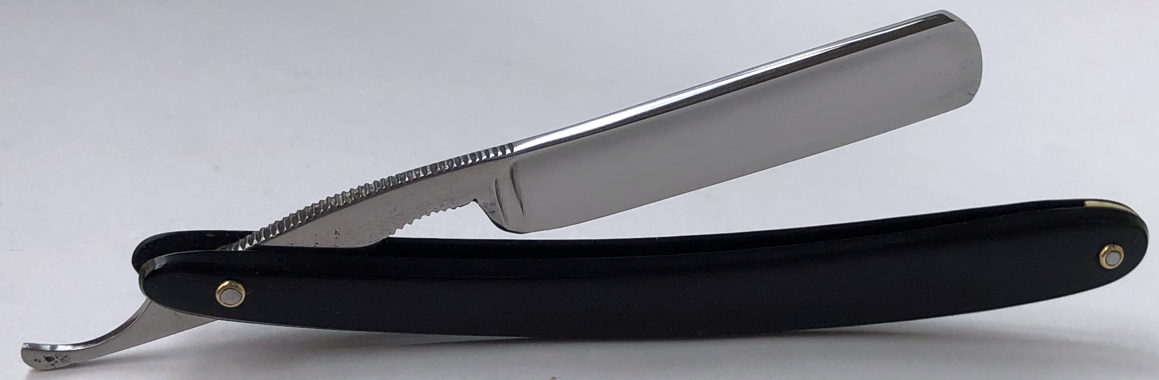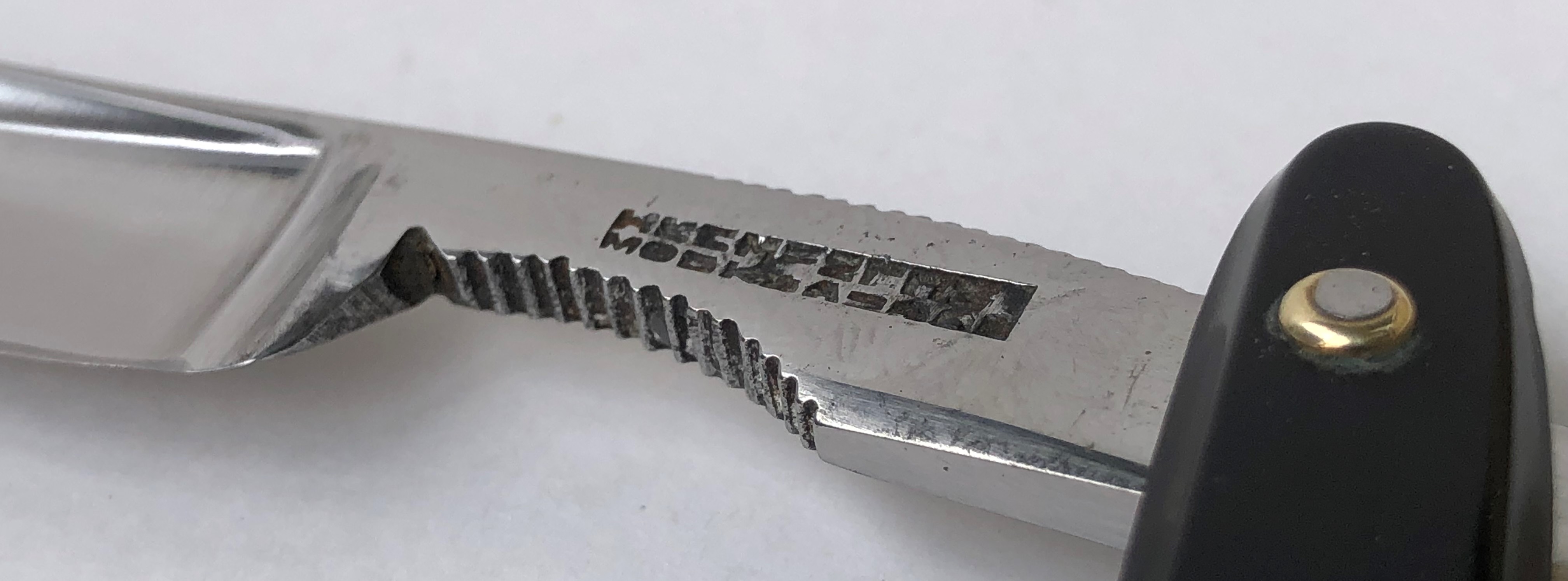 Бритва в очень хорошем состоянии.Непонятно, была ли в пользовании или нет, так как следов на обушке от заточных камней не наблюдается, но ширина полотна неоригинальна.Возможно был изначально скол, а может быть просто правильная и профессиональная эксплуатация.Бритва была разобрана для удаления следов окисления и царапин.Добавил внутренние шайбы и поставил втулку.Кромочка почти равномерна по всей длине. Сталь чистая от видимых дефектов.