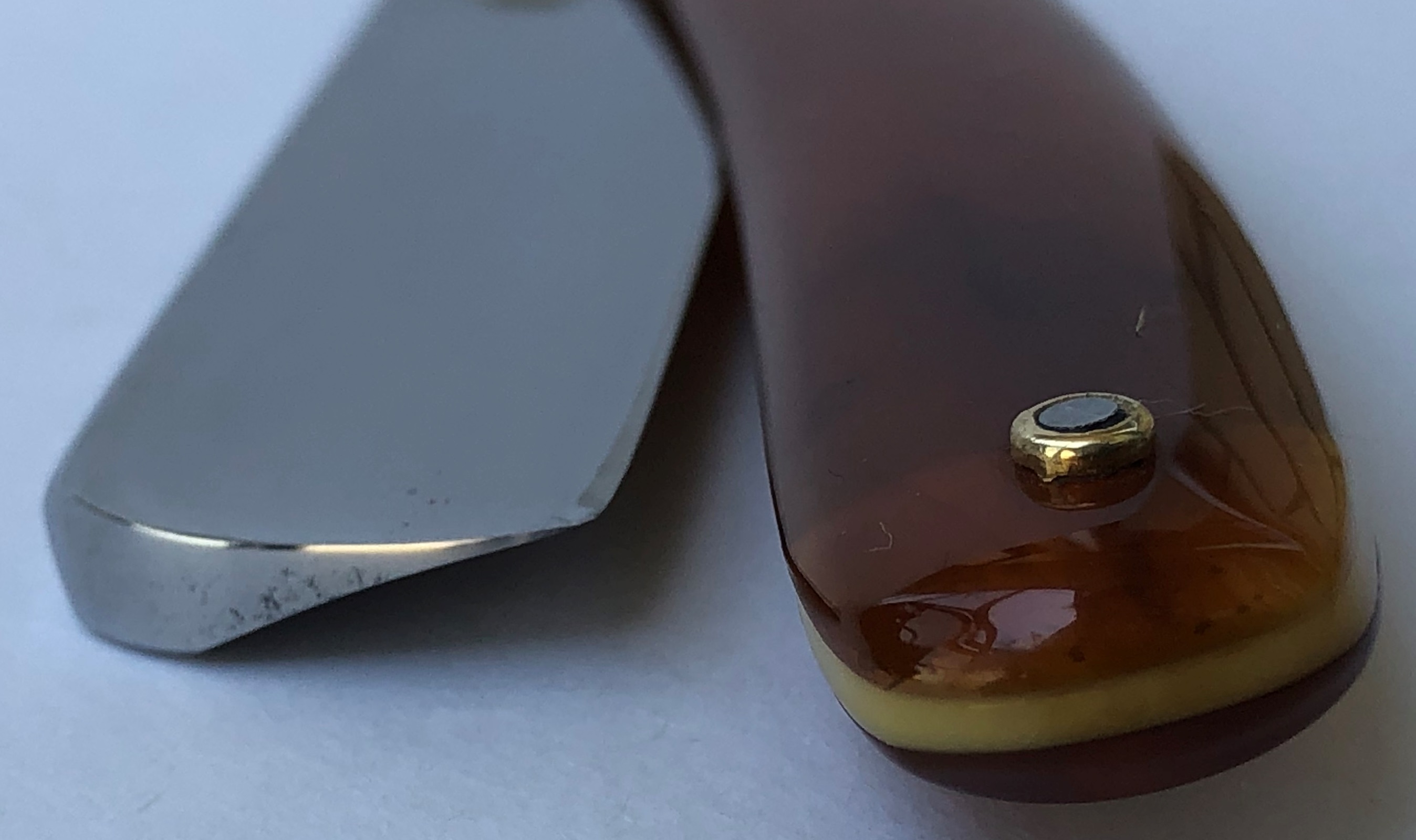 Не часто попадающиеся у меня американские бритвы, но вот эта модель очень неплоха по качеству и состоянию.Бритва была разобрана и немного освежено полотно, с заменой пинов на втулки и добавлением внутренних шайб.По всей видимости бритва в пользовании не была.Идеальная геометрия клинка:кромочка равномерна по всей длине.Бритва заточена и готова к бритью.