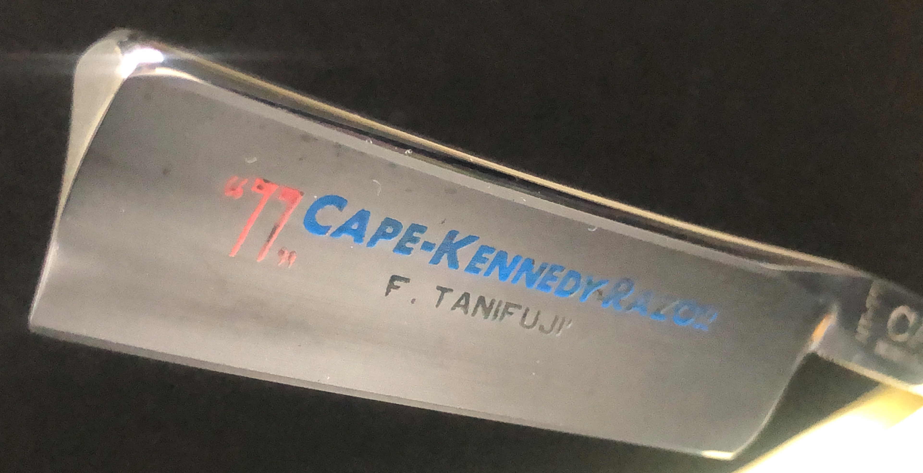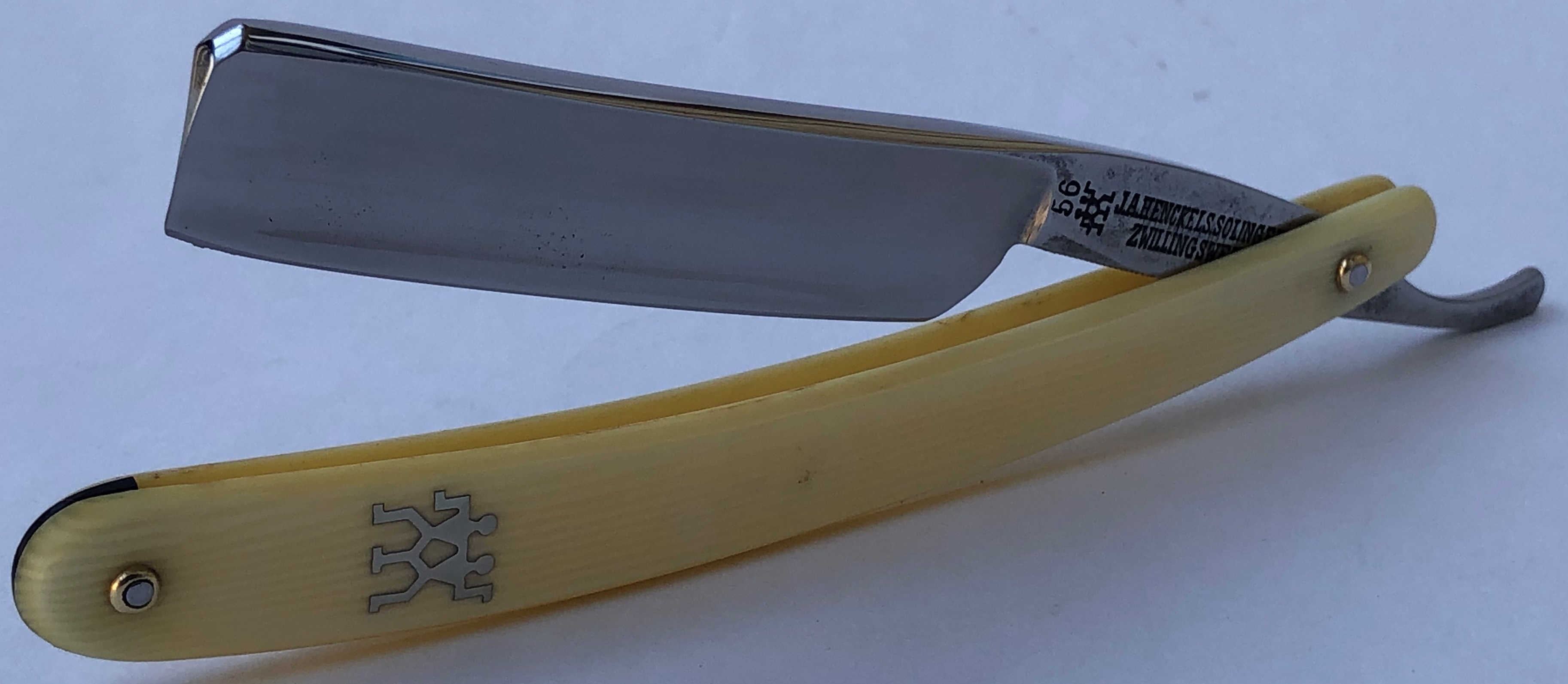 Клинок в прекрасном и малопользованном состоянии для своих лет. Бритва была разобрана, для приведения в порядок и снова собрана, с заменой пинов на двух-цветные пины, а также с добавлением внутренних шайб.