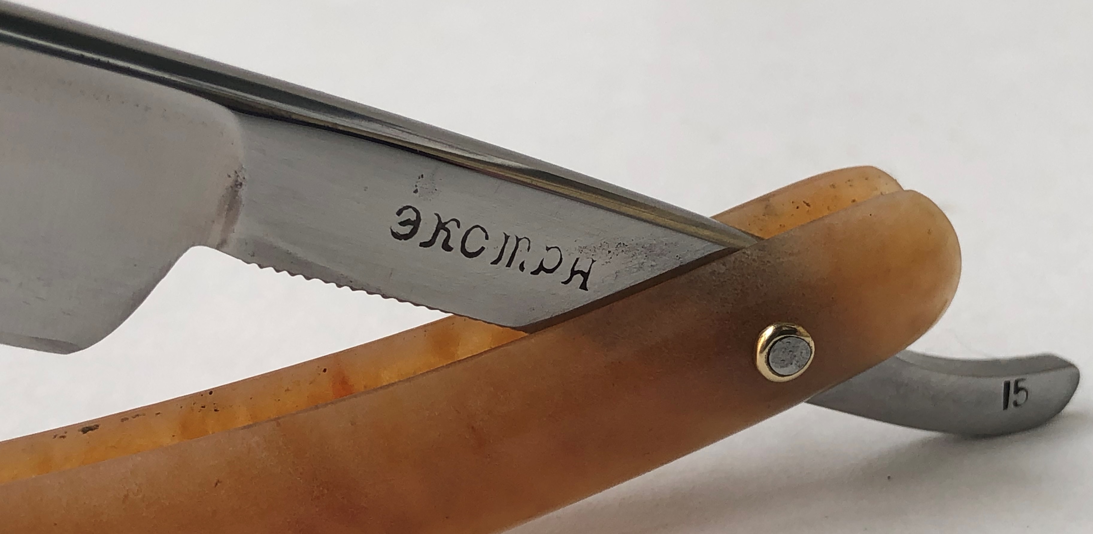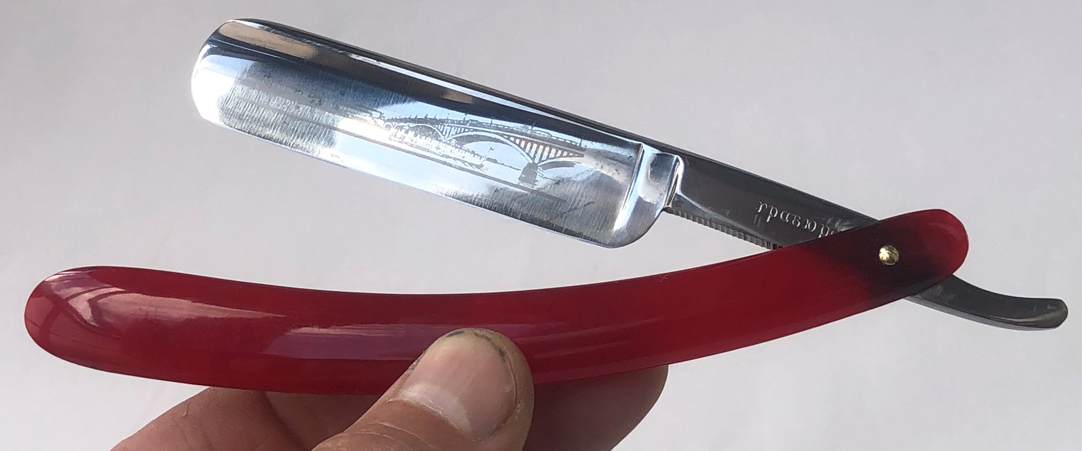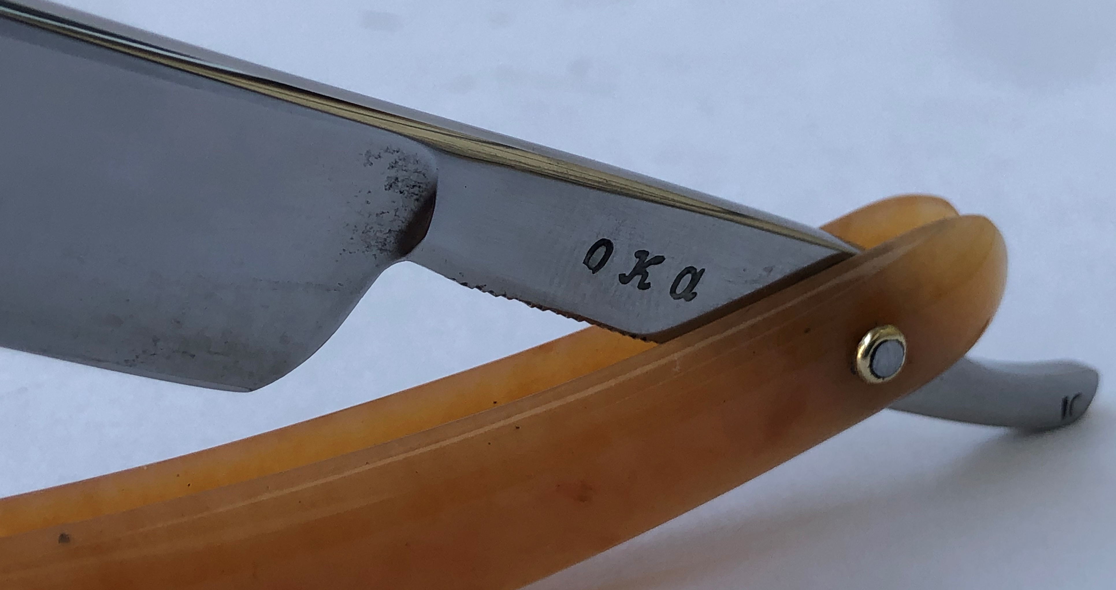 Ничего тут не делал. Бритва была разобрана, для удаления окисления в районе осевого пина, а также замены шайб на двух-цветные втулки.Очень неплохая и редкая вещь.Заточена и готова к бритью.