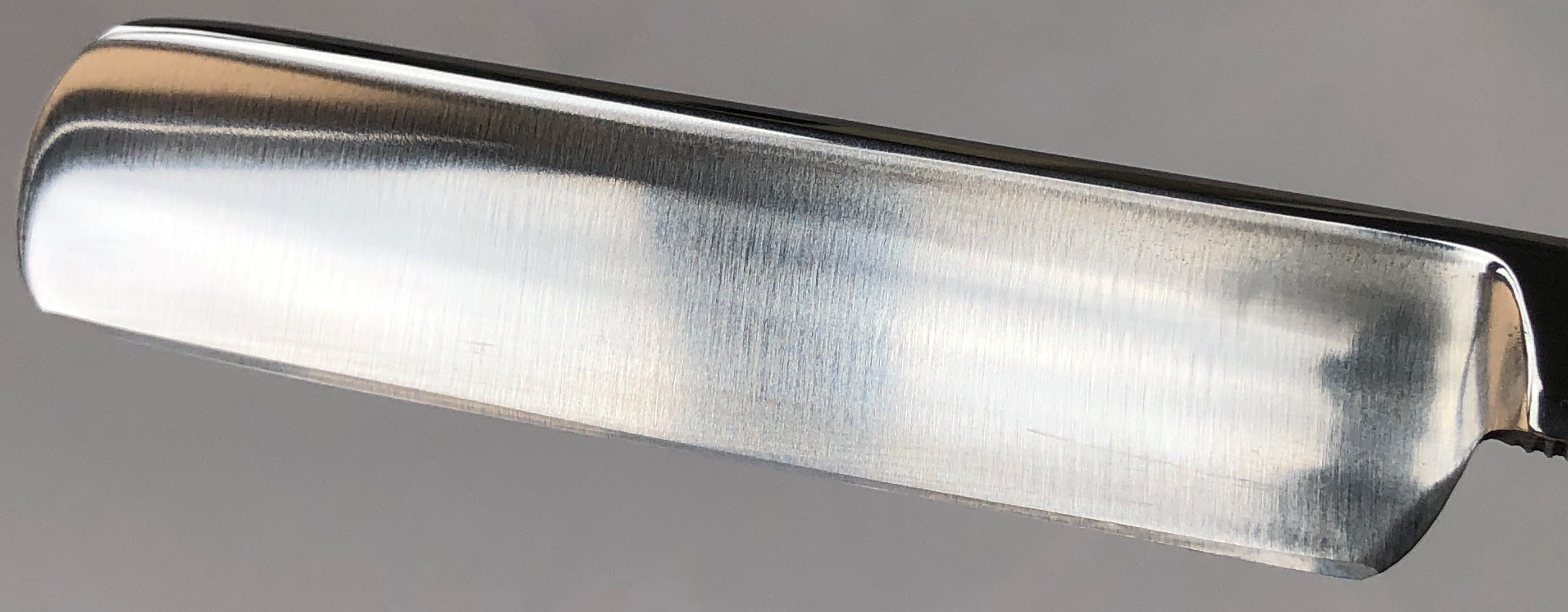 Попробовал вдохнуть вторую жизнь в старушку.Разобрал, откорректировал утОчку обушка и исправил небольшую "обратную улыбку".Скошенная пятка в результате удаления скола.Умеренная полировка.Кромка сейчас равномерна по всей длине. Оставил немного красивого налета патины на эрле. Неглубокую трещинку на ручке также хорошо проклеил.В общем и целом получалась неплохая, недорогая и удобная бритва. Заточена и готова к бритью.