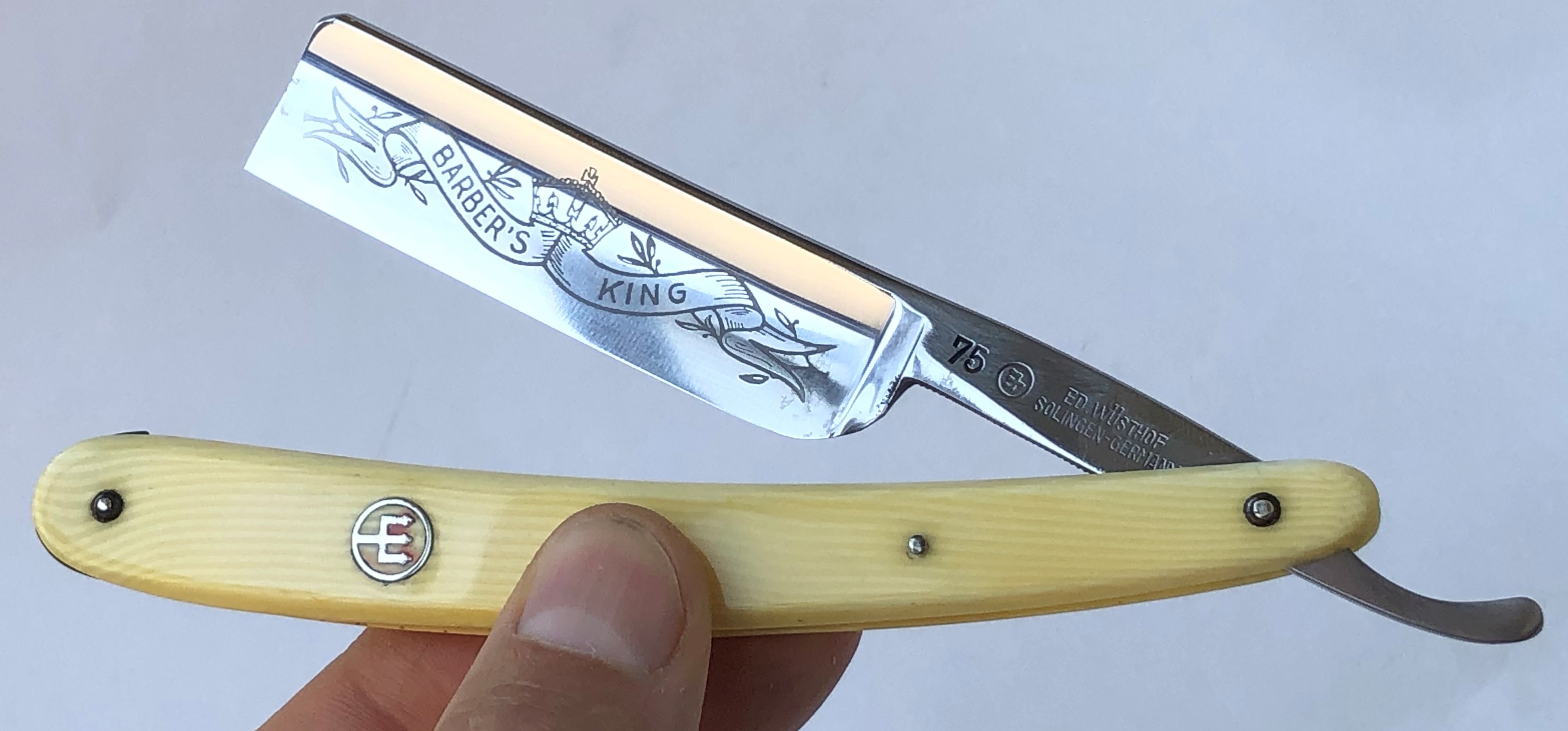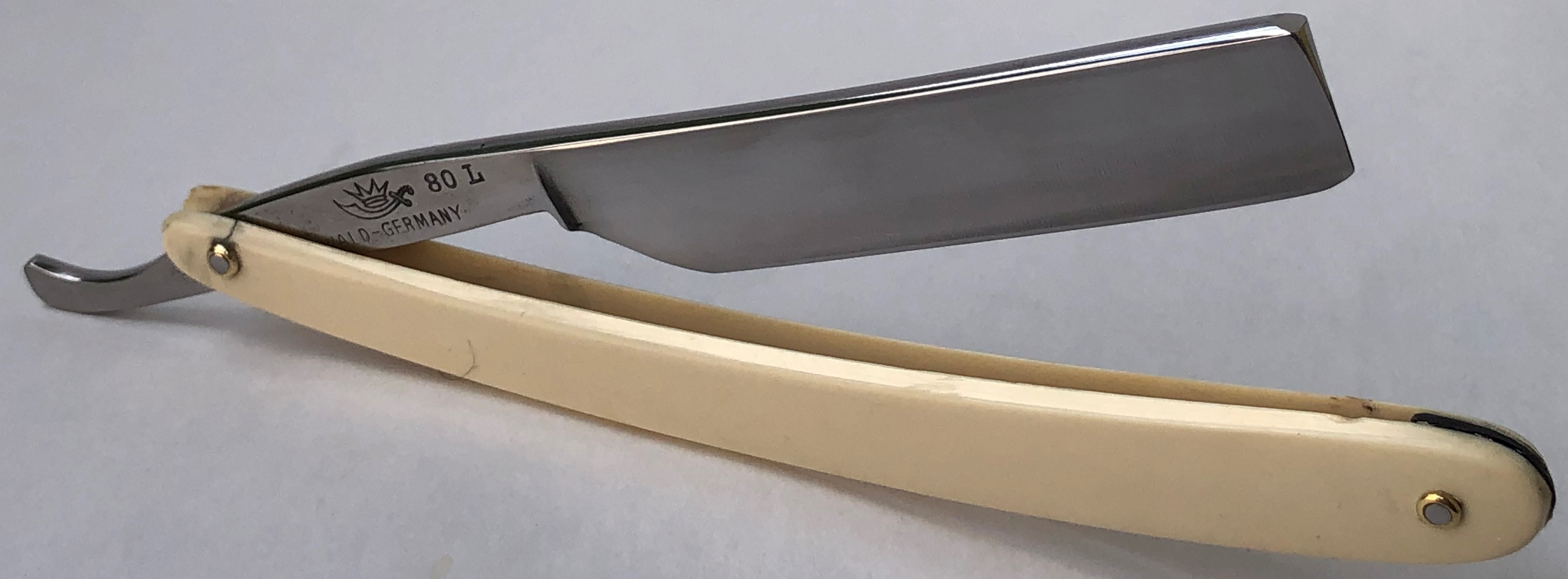 Сохранил благородный налет патины на эрле, дабы сохранить аутентичный вид и подчеркнуть почтенный возраст бритвы.Сам клинок имеет идеальную геометрию, с тоненькой кромочкой по всей длине. Редко толстый обух для бритв этого бренда.Тяжёлая. За счет такого обушка есть возможность бриться, не выставляя угла атаки, а просто кладя бритву плашмя.Бритва среднего размера, но тяжёлая и верткая. Уверен, что опытный пользователь в полной мере оценит все преимущества такого инструмента.Красивая и редкая вещь. Заточена и лично протестирована. Бритье чистое, с неким металлическим отзвоном сбриваемой щетины. Умеренно агрессивная,впрочем как и большинство немцев.Не пропустите!