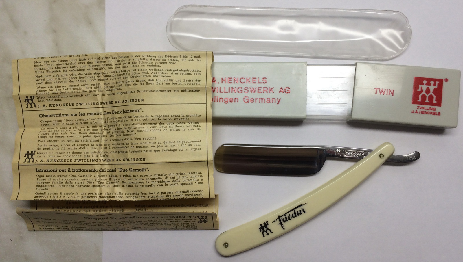 Zwilling J.A. Henckels AG, Solingen 6/8 Модель 72 1/2 Friodur Inox No stain Germany Нержавейка с обработкой жидким азотом. Мягкая. Подойдет новичкам. Хорошо пойдет под борд с пастой. Состояние идеальное (не могу написать что NOS так как не я вскрывал) Но даже ветхая бумажка на месте. Сложно оценить возраст. Лэйбл говорит что моложе 80 лет. Бумажка истлела как на все 60-80 лет (трухлявая и с запахом библиотеки) Но пластиковая коробочка смущает. (как сейчас помню что году этак в 2000 видел такие в магазинах и слюни пускал. Но ручки у бритв были уже более грубые. Так что по факту думаю годов 90-х а м.б. и 80-х Цена 9000