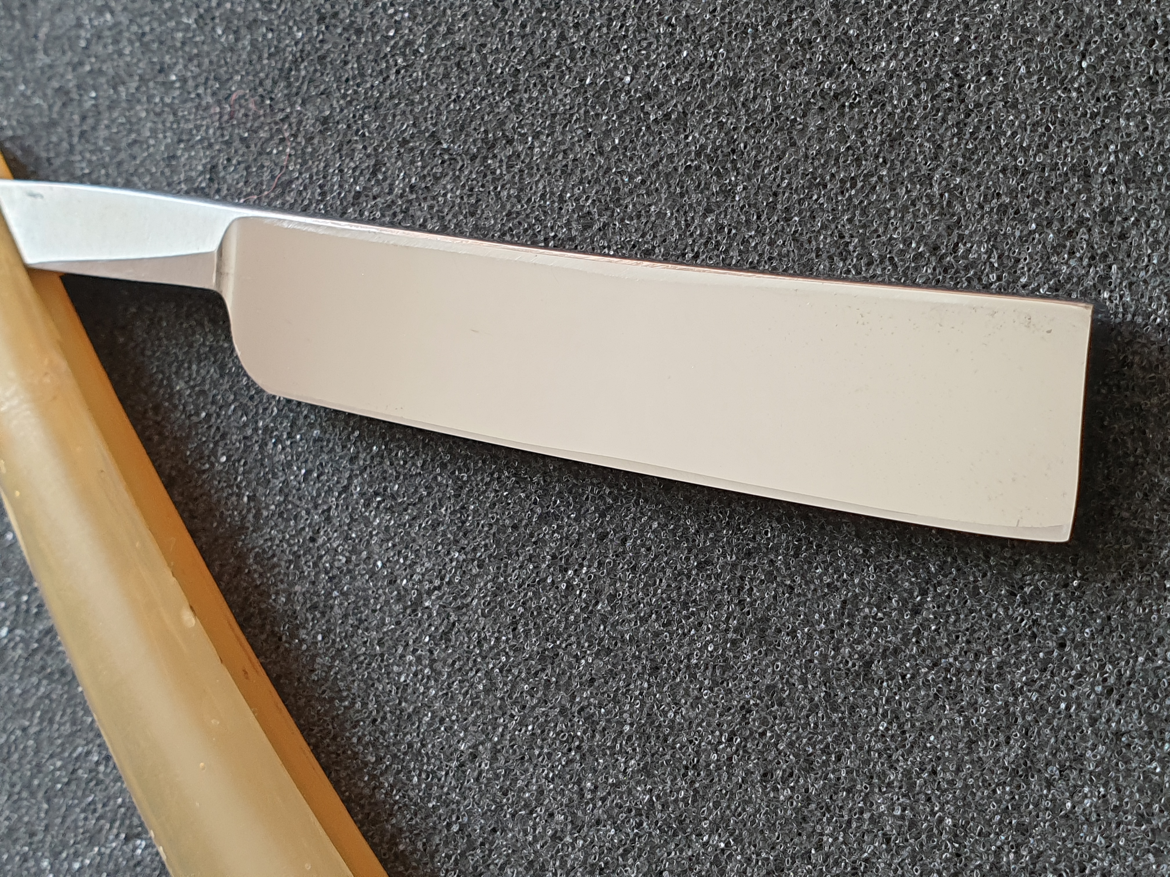 Продаётся от S&T100. Bengall, Шеффилд, XIX век. Форма - клин, ручка из рога с клинышком из олова, ширина клинка 15мм, все родное, ручка без выгрызов и прочих дефектов, отличная геометрия клинка, бритва не разбиралась, не шкурилась, сделана только свежая заточка на японских камнях.