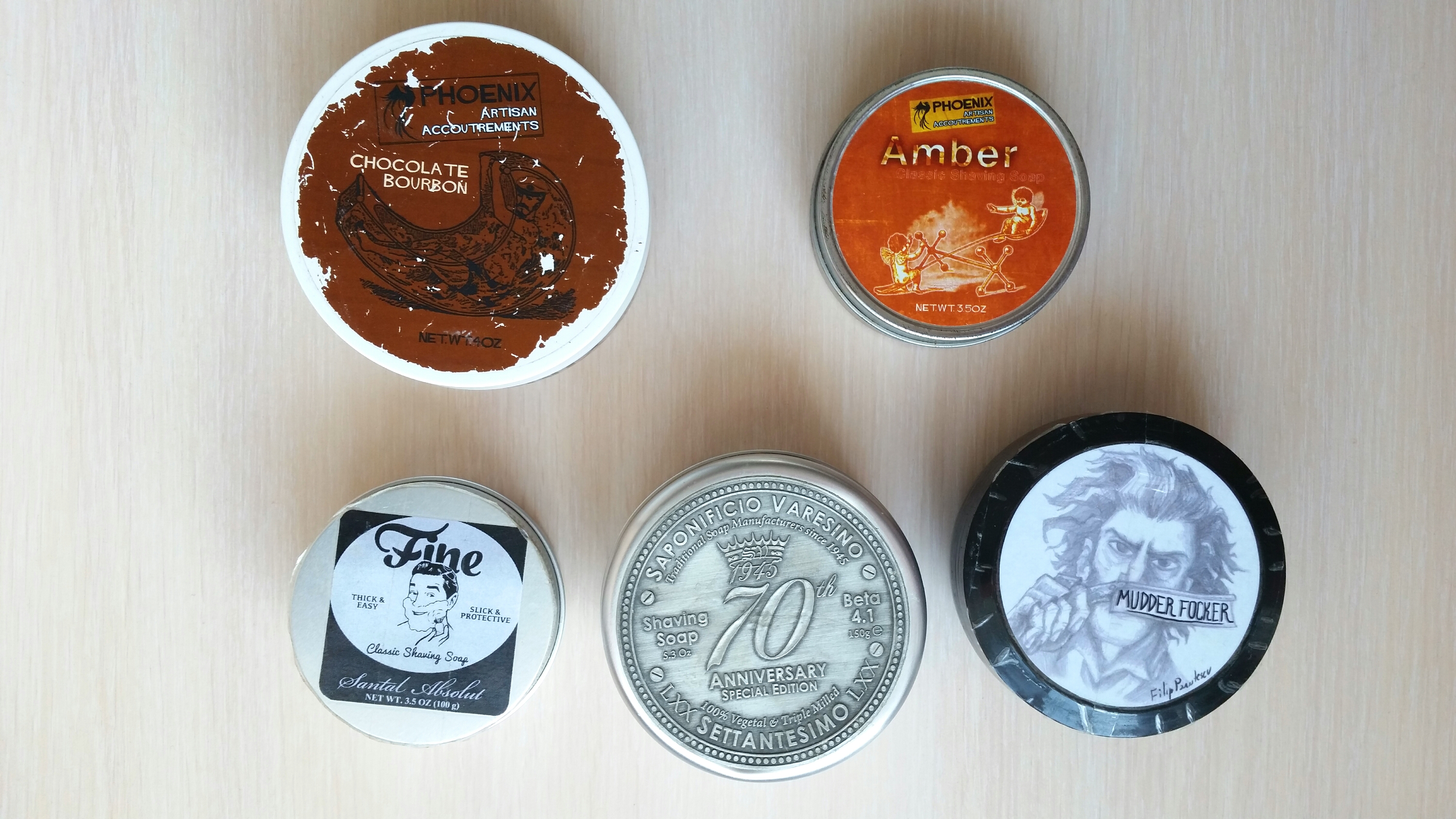 - Phoenix Artisan Accoutrements, Amber. Янтарь, старинная архитектура, античность. Остаток примерно 75%. Цена ПРОДАНО руб. - Phoenix Artisan Accoutrements, Chocolate Bourbon. Шоколадный бурбон, горький шоколад и еще какая то выпечка. Остаток примерно 80%. Цена ПРОДАНО руб. - Saponificio Varesino, 70th Anniversary Special Edition. Специздание к 70 летию компании, сложный парфюмированный аромат. Остаток примерно 85% (очень экономичный расход). Цена ПРОДАНО руб. - Fine Santal. В металлической банке, твердое жировое мыло с моноароматом сандала. Остаток примерно 90% (очень экономичный расход). Цена ПРОДАНО руб. - Razorock Mudder Focker. Жировое крем-мыло от итальянского производителя, отличная пена, приятный аромат. Остаток примерно 70%. Цена ПРОДАНО руб. Spoiler Show
